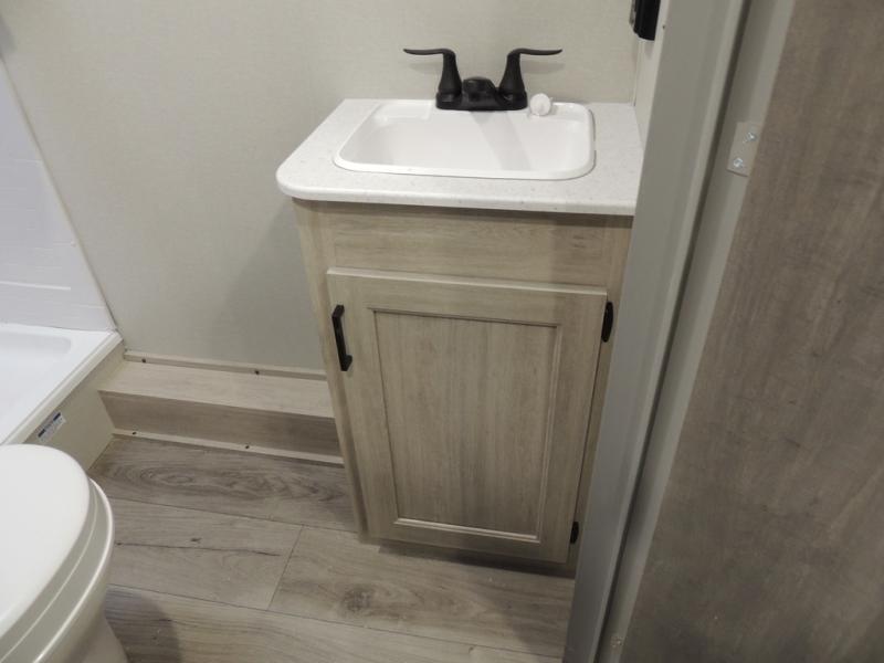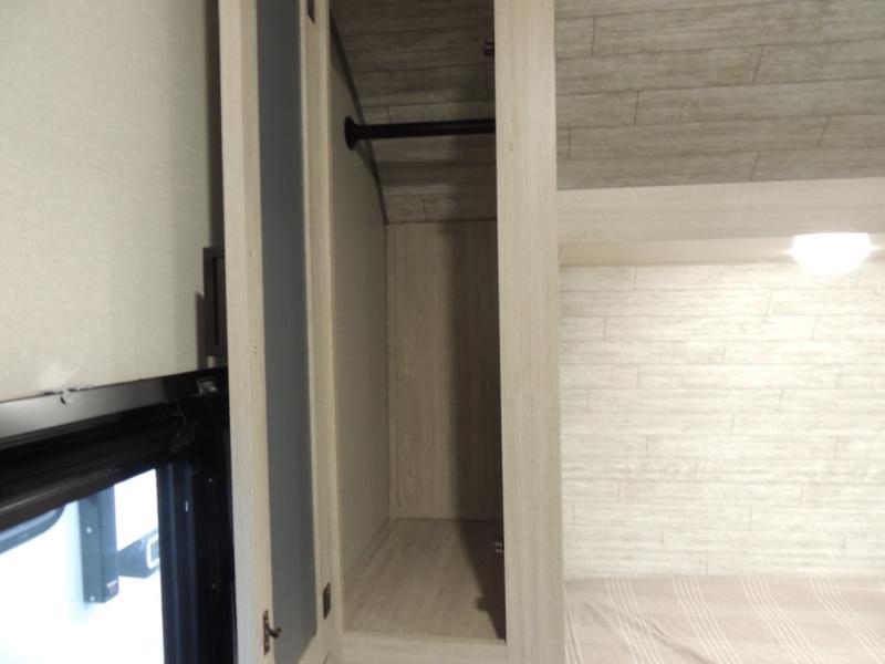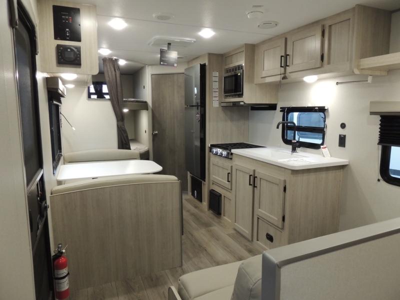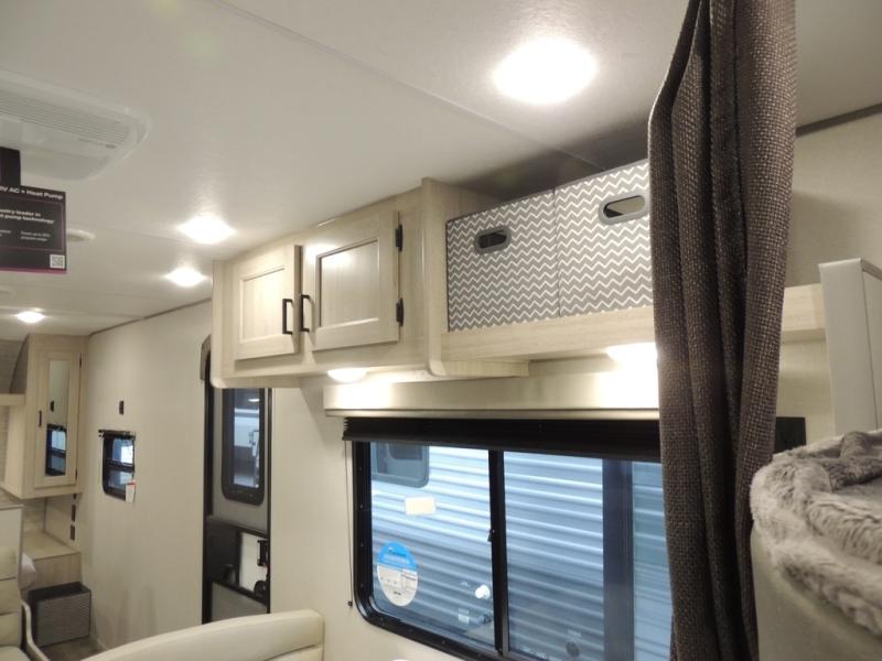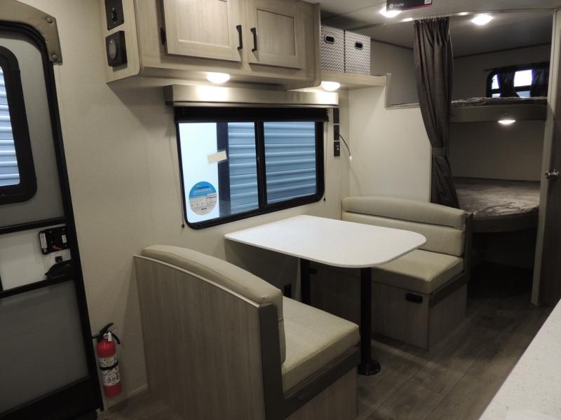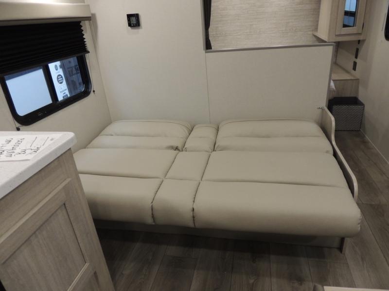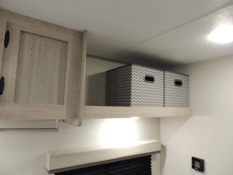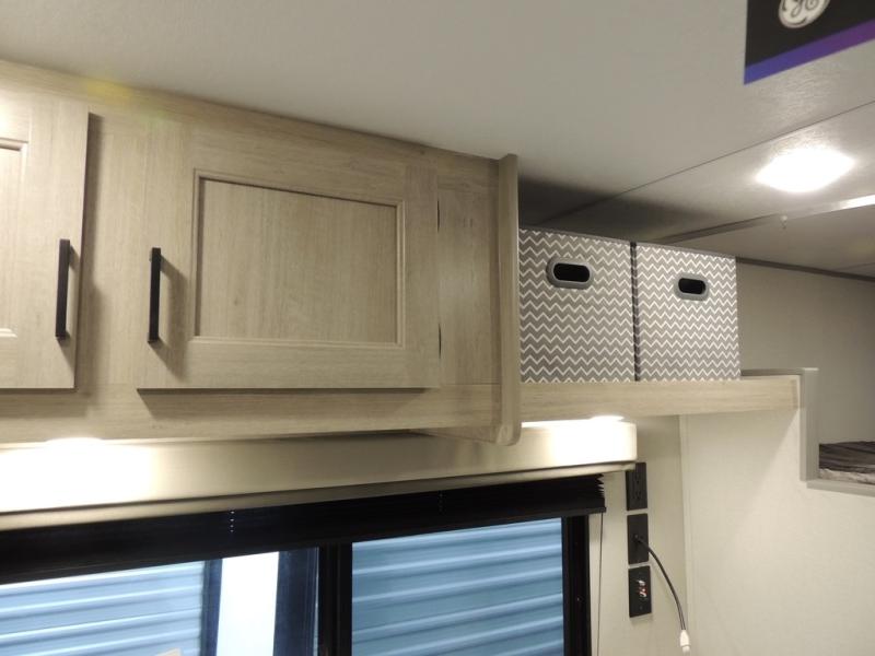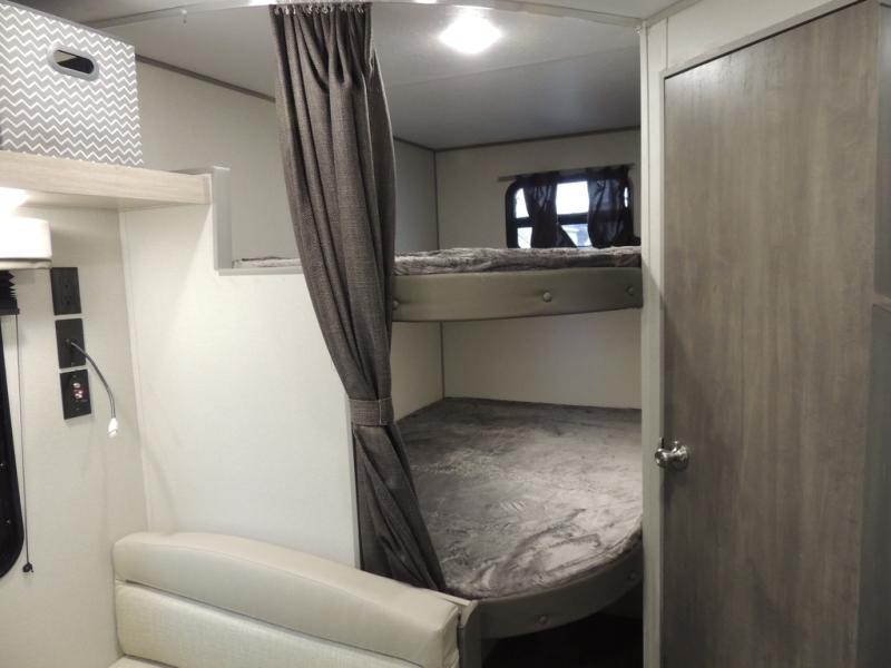 You get to choose to sit at the sofa or at the booth dinette when you are relaxing inside. There is a shelf with storage totes above the sofa for your belongings, and an additional overhead cabinet above the dinette for games. Maybe you want to rest on your own queen bed in the front semi-private bedroom before you make a meal in the kitchen or take a hike through the trails around the lake. The 15' electric awning with multi-color LED lights and a remote offers an outdoor living area where you can visit with other RVers. The kids will love their own double-size bunks that they can share with a friend or two, and the full bathroom is nearby as an added convenience.