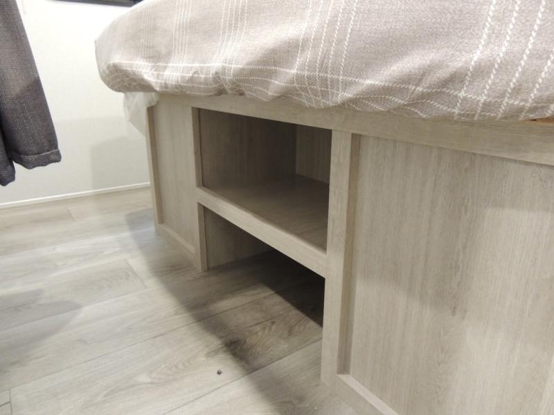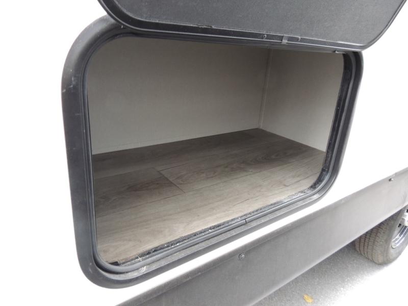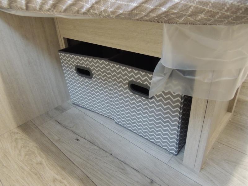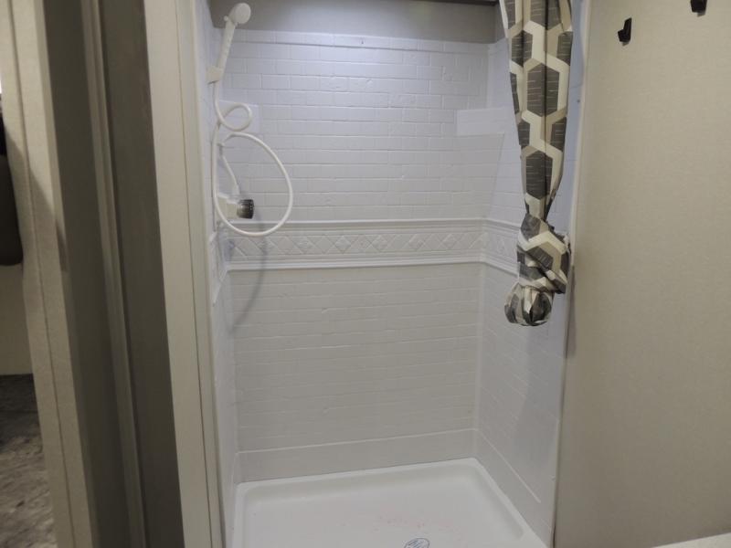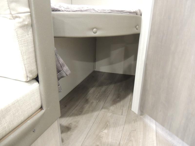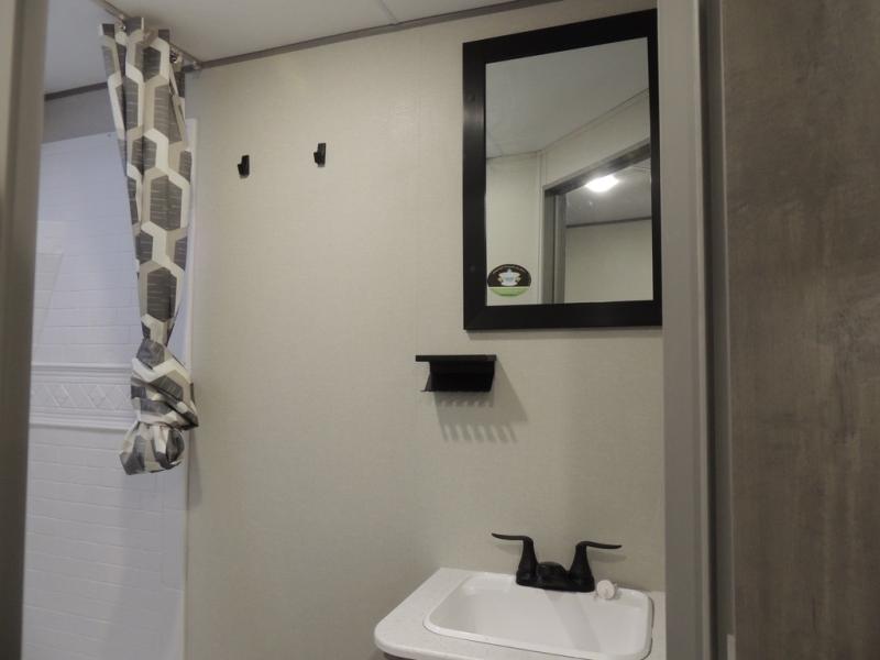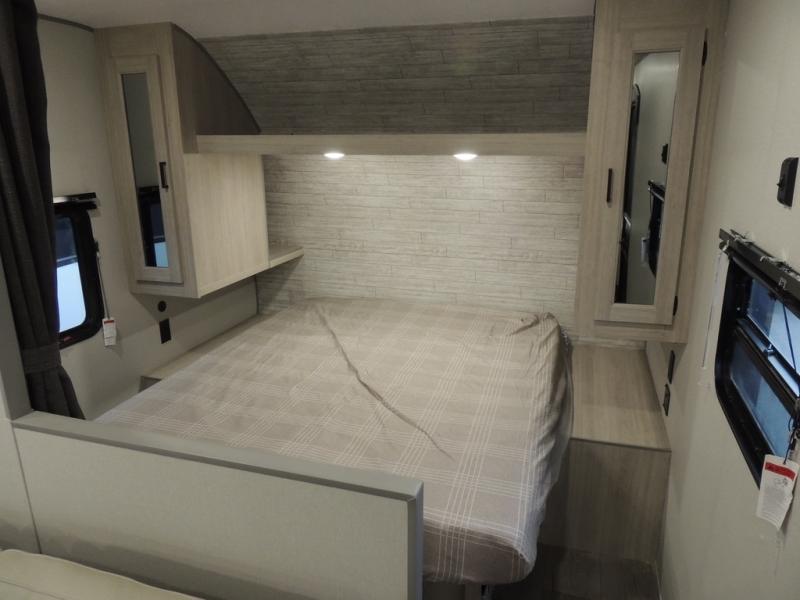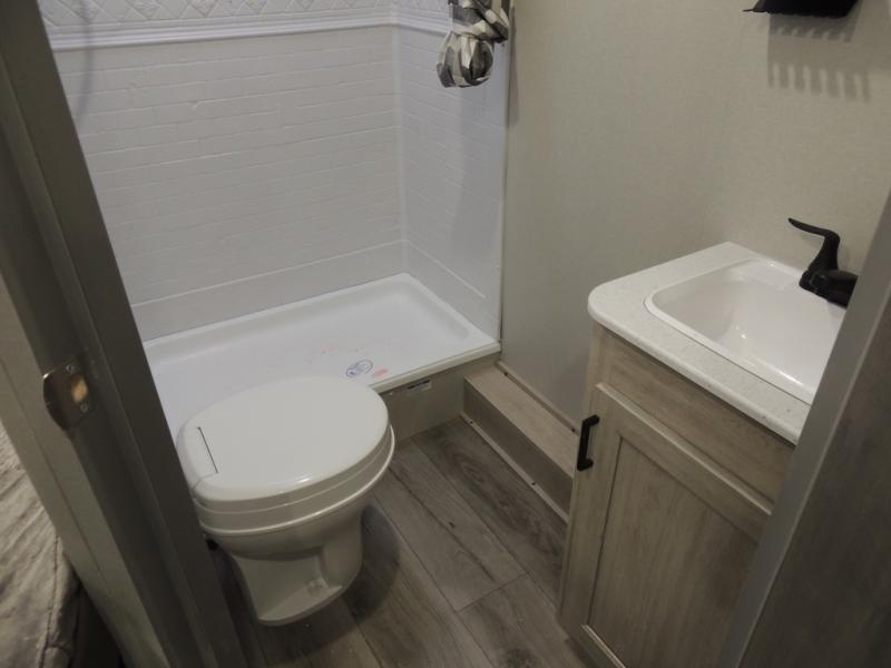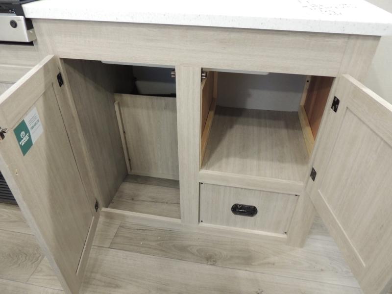 You get to choose to sit at the sofa or at the booth dinette when you are relaxing inside. There is a shelf with storage totes above the sofa for your belongings, and an additional overhead cabinet above the dinette for games. Maybe you want to rest on your own queen bed in the front semi-private bedroom before you make a meal in the kitchen or take a hike through the trails around the lake. The 15' electric awning with multi-color LED lights and a remote offers an outdoor living area where you can visit with other RVers. The kids will love their own double-size bunks that they can share with a friend or two, and the full bathroom is nearby as an added convenience.