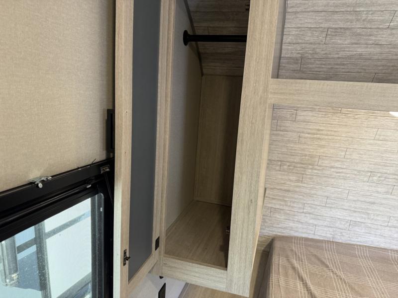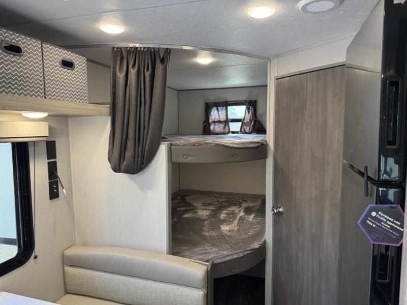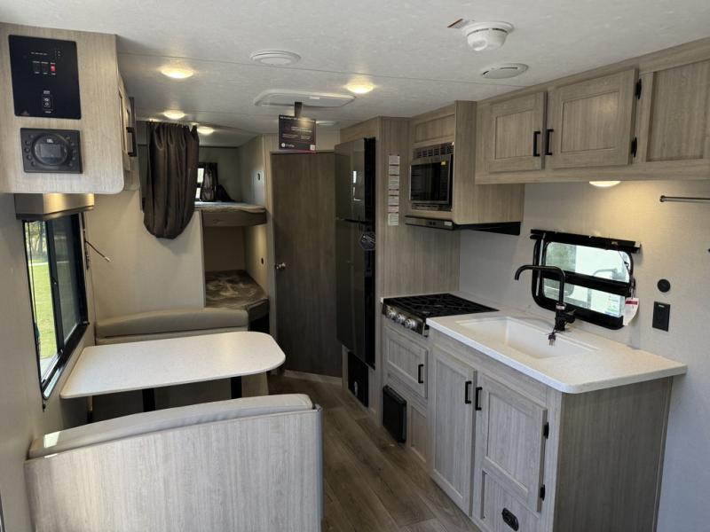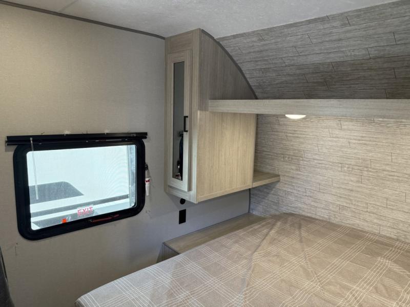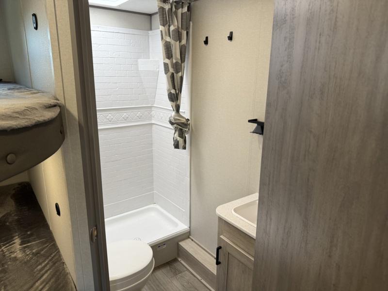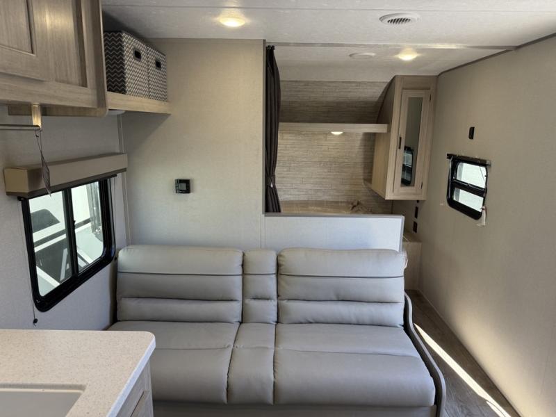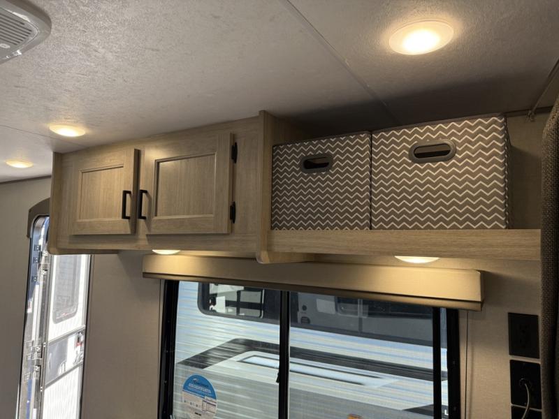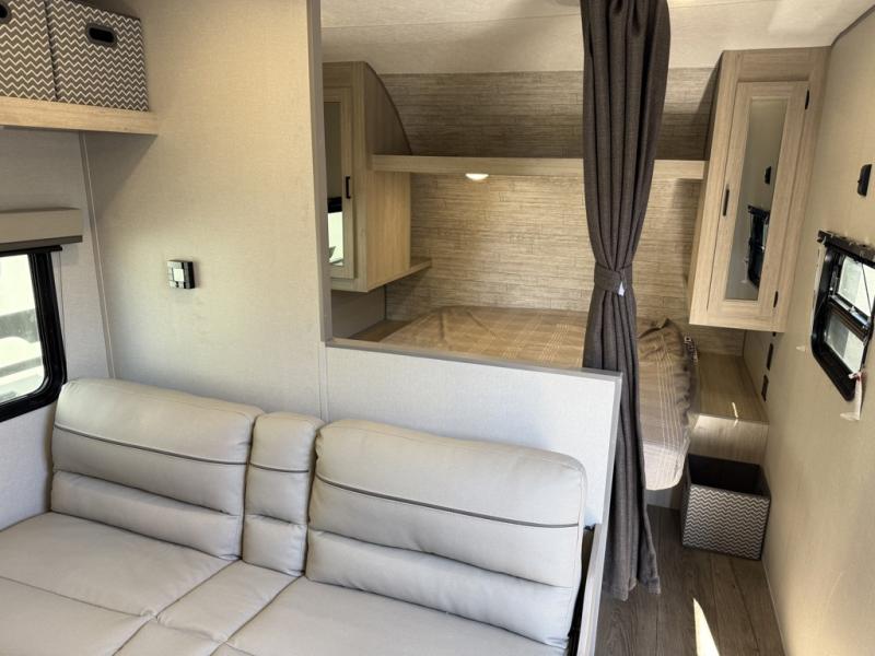 You get to choose to sit at the sofa or at the booth dinette when you are relaxing inside. There is a shelf with storage totes above the sofa for your belongings, and an additional overhead cabinet above the dinette for games. Maybe you want to rest on your own queen bed in the front semi-private bedroom before you make a meal in the kitchen or take a hike through the trails around the lake. The 15' electric awning with multi-color LED lights and a remote offers an outdoor living area where you can visit with other RVers. The kids will love their own double-size bunks that they can share with a friend or two, and the full bathroom is nearby as an added convenience.