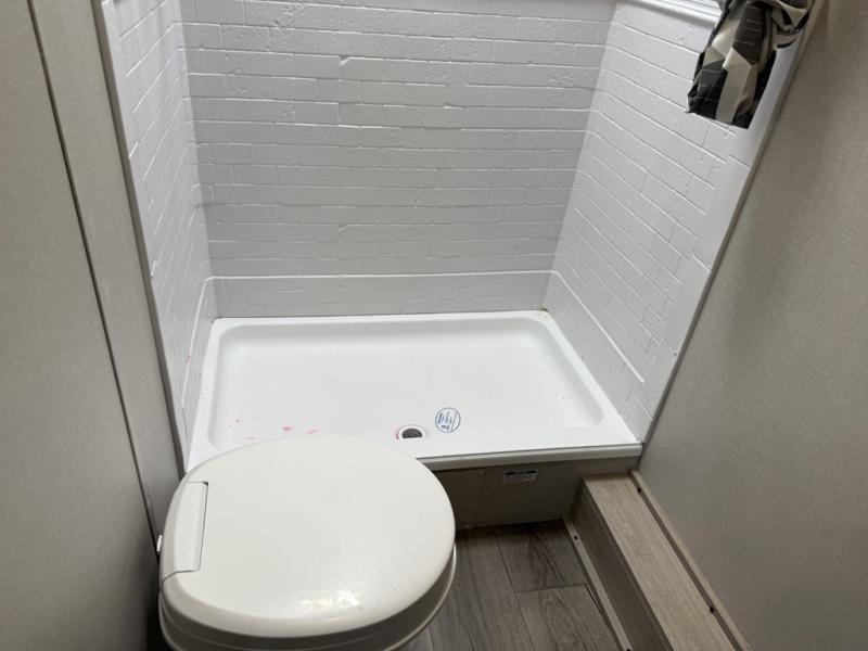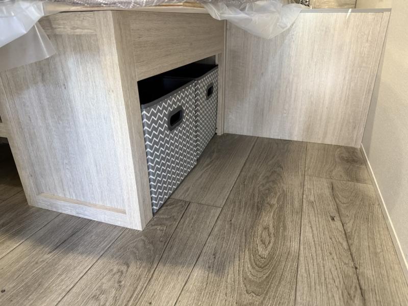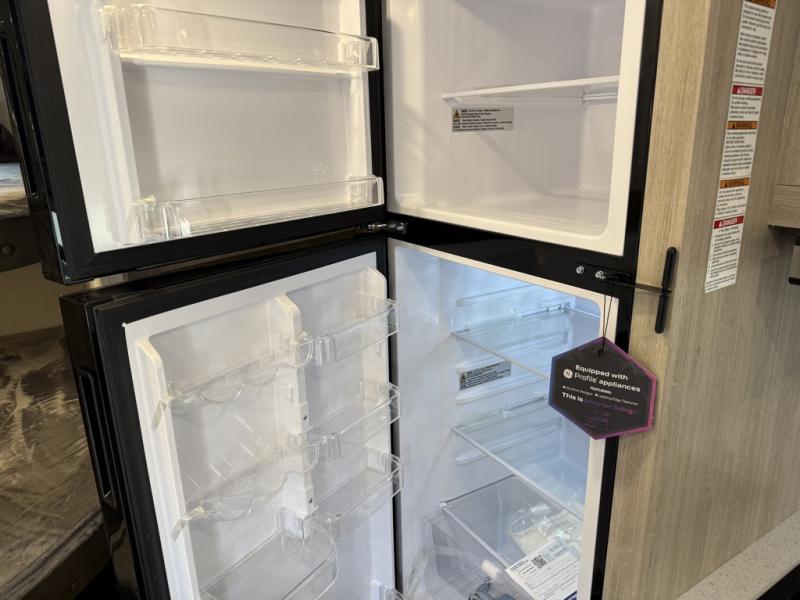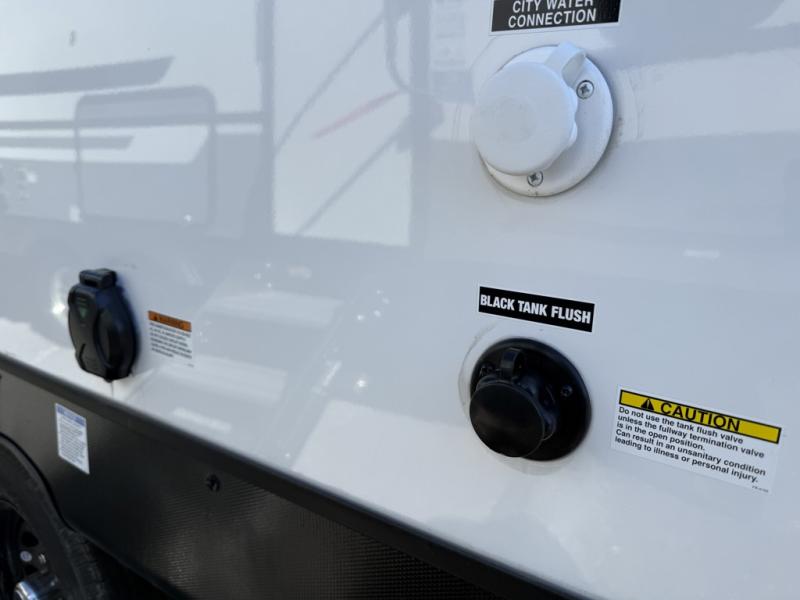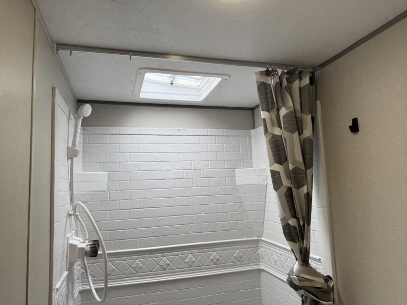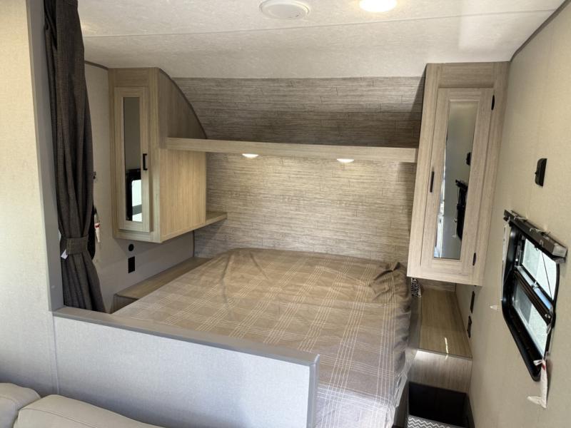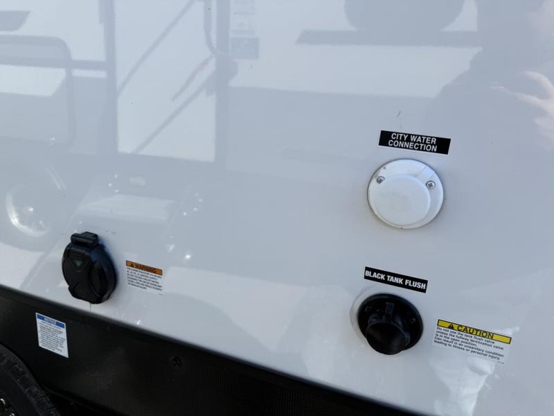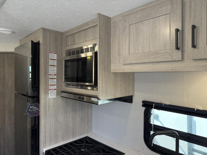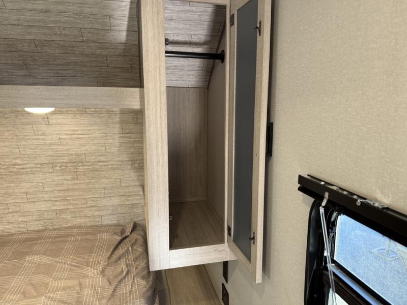 You get to choose to sit at the sofa or at the booth dinette when you are relaxing inside. There is a shelf with storage totes above the sofa for your belongings, and an additional overhead cabinet above the dinette for games. Maybe you want to rest on your own queen bed in the front semi-private bedroom before you make a meal in the kitchen or take a hike through the trails around the lake. The 15' electric awning with multi-color LED lights and a remote offers an outdoor living area where you can visit with other RVers. The kids will love their own double-size bunks that they can share with a friend or two, and the full bathroom is nearby as an added convenience.
