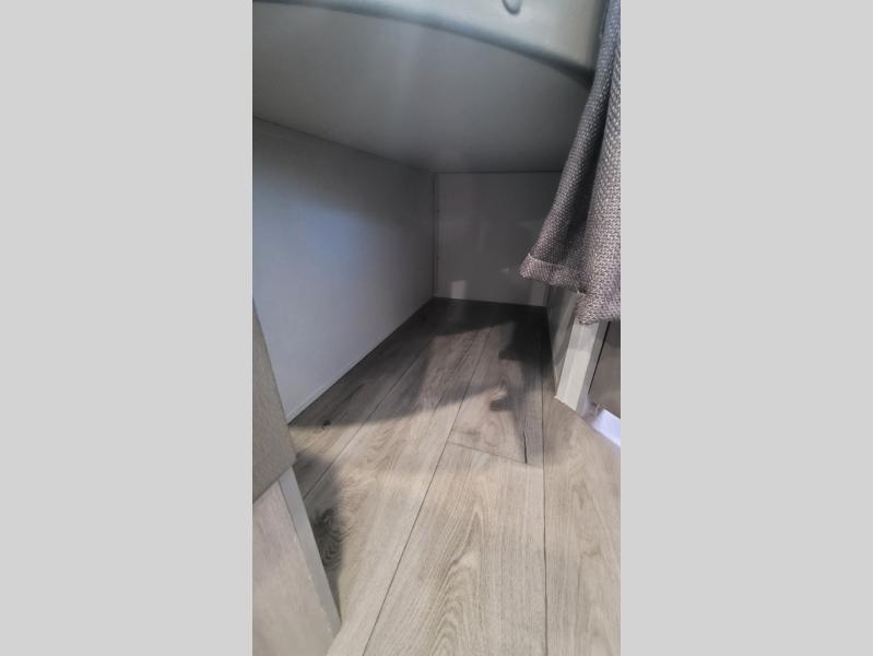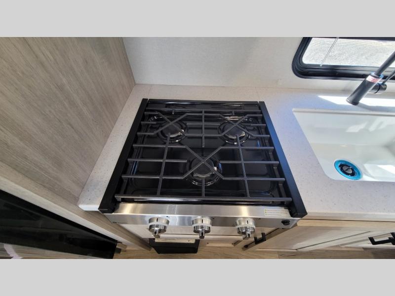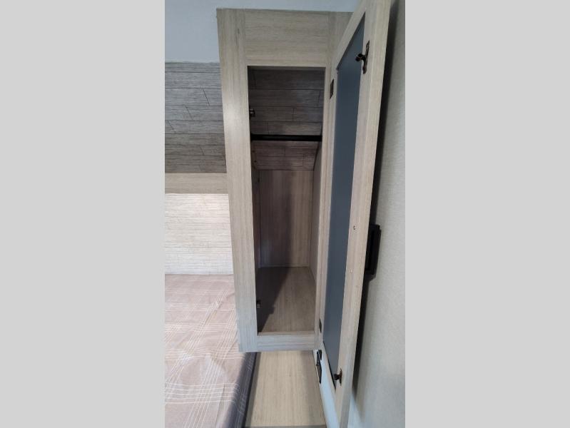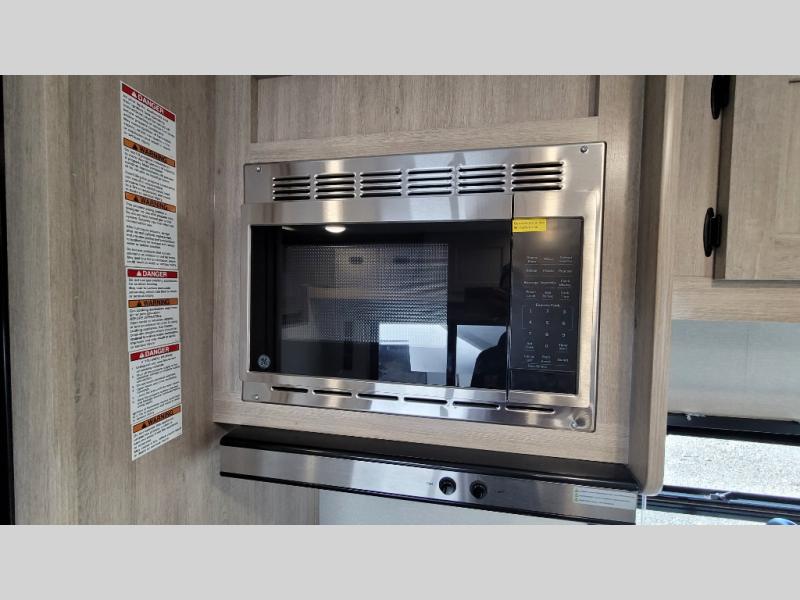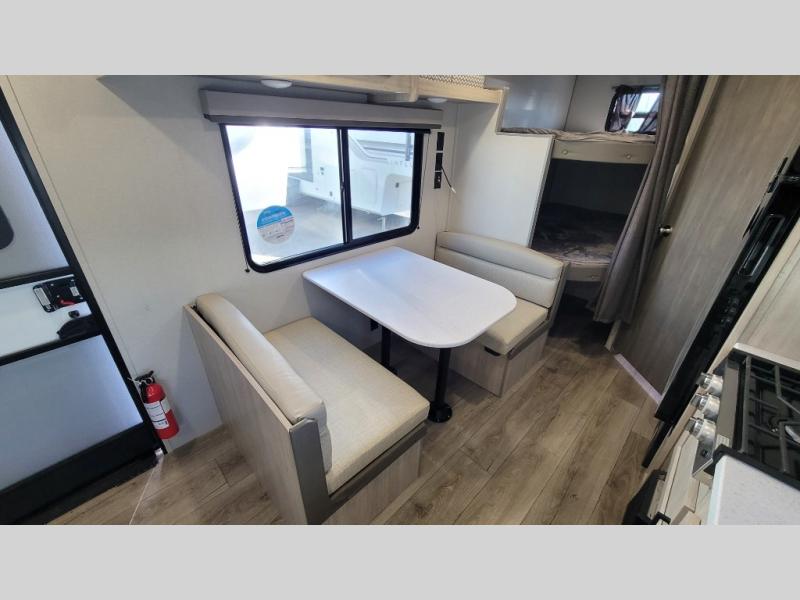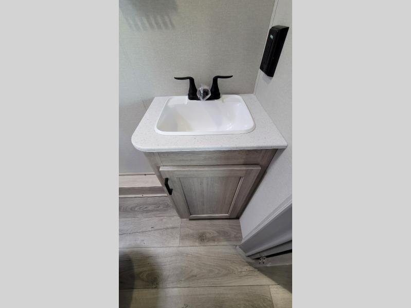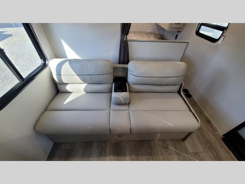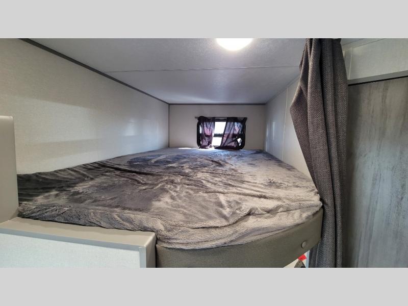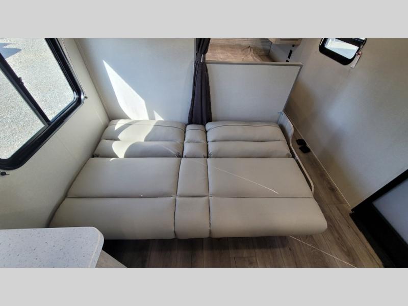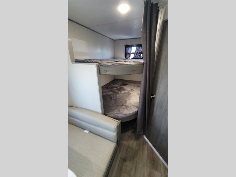 You get to choose to sit at the sofa or at the booth dinette when you are relaxing inside. There is a shelf with storage totes above the sofa for your belongings, and an additional overhead cabinet above the dinette for games. Maybe you want to rest on your own queen bed in the front semi-private bedroom before you make a meal in the kitchen or take a hike through the trails around the lake. The 15' electric awning with multi-color LED lights and a remote offers an outdoor living area where you can visit with other RVers. The kids will love their own double-size bunks that they can share with a friend or two, and the full bathroom is nearby as an added convenience.