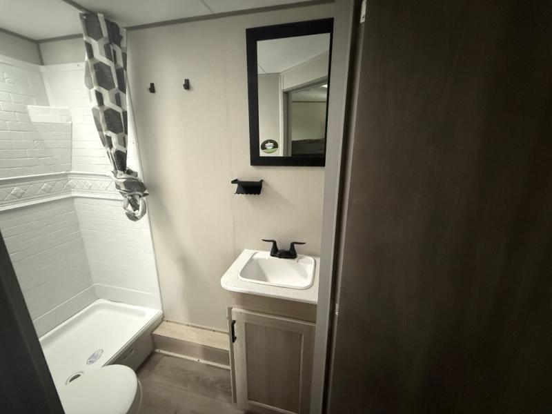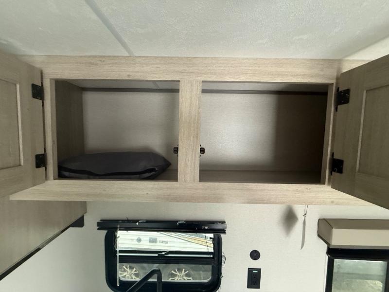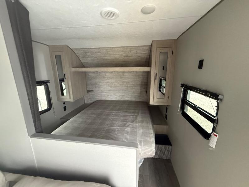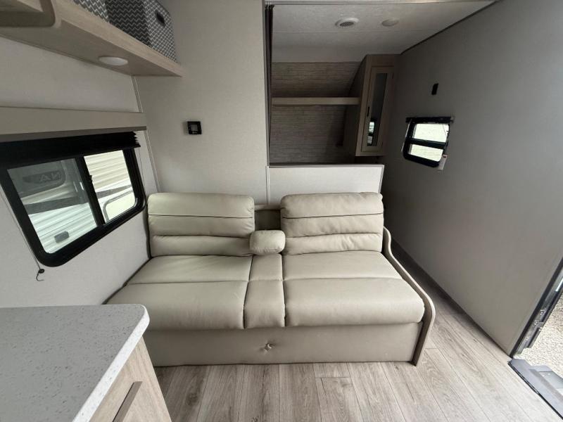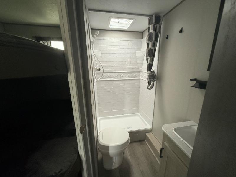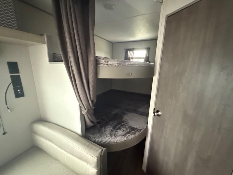 You get to choose to sit at the sofa or at the booth dinette when you are relaxing inside. There is a shelf with storage totes above the sofa for your belongings, and an additional overhead cabinet above the dinette for games. Maybe you want to rest on your own queen bed in the front semi-private bedroom before you make a meal in the kitchen or take a hike through the trails around the lake. The 15' electric awning with multi-color LED lights and a remote offers an outdoor living area where you can visit with other RVers. The kids will love their own double-size bunks that they can share with a friend or two, and the full bathroom is nearby as an added convenience.