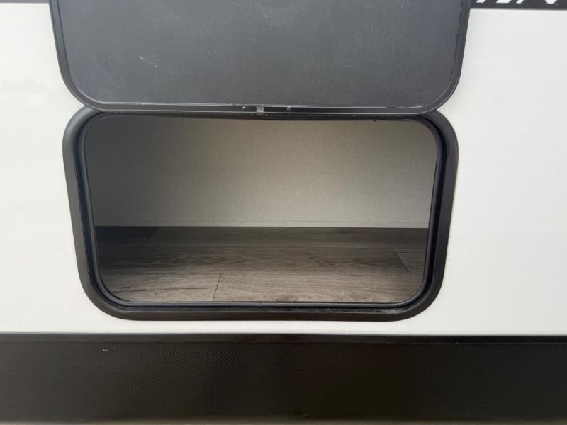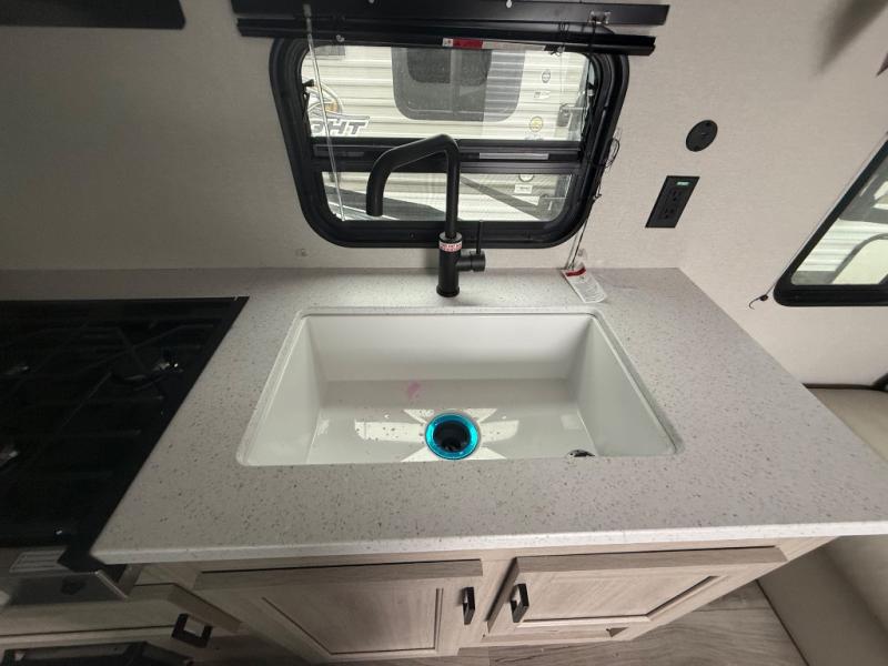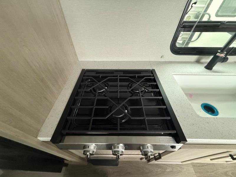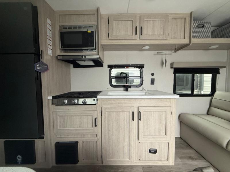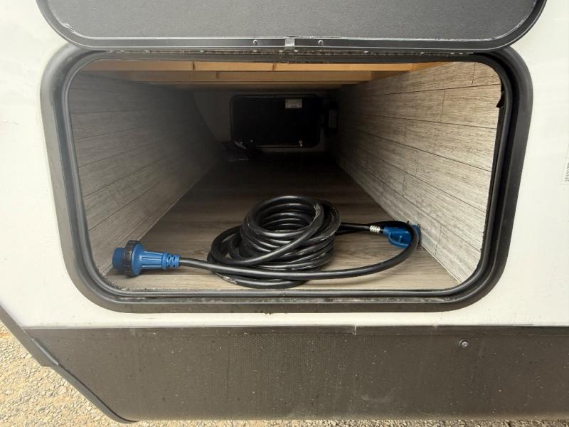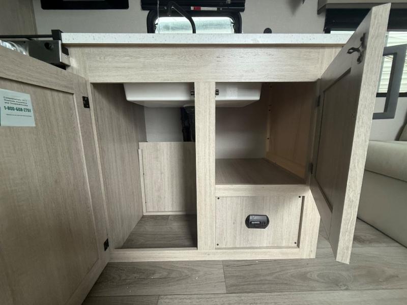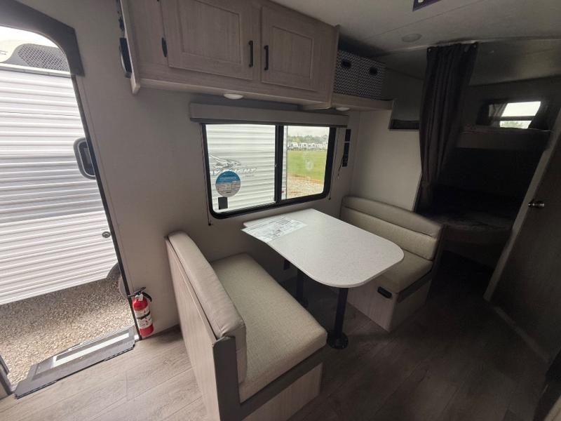 You get to choose to sit at the sofa or at the booth dinette when you are relaxing inside. There is a shelf with storage totes above the sofa for your belongings, and an additional overhead cabinet above the dinette for games. Maybe you want to rest on your own queen bed in the front semi-private bedroom before you make a meal in the kitchen or take a hike through the trails around the lake. The 15' electric awning with multi-color LED lights and a remote offers an outdoor living area where you can visit with other RVers. The kids will love their own double-size bunks that they can share with a friend or two, and the full bathroom is nearby as an added convenience.