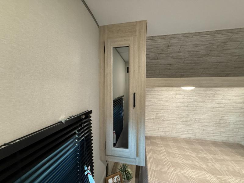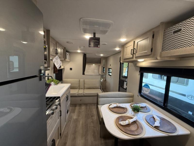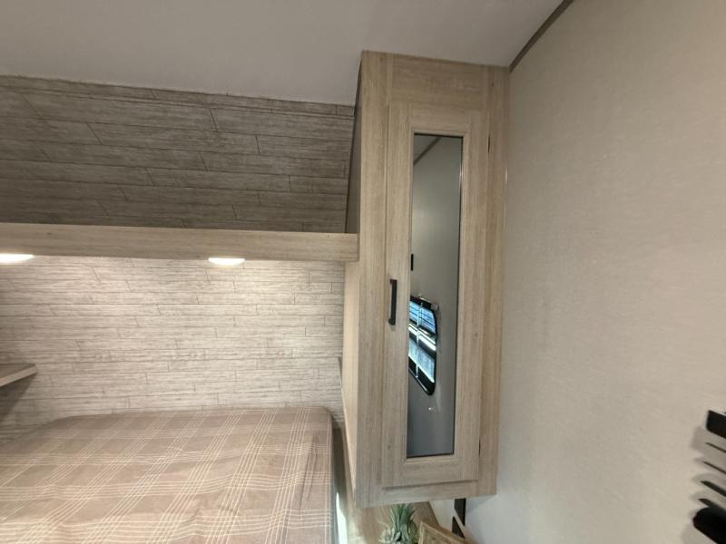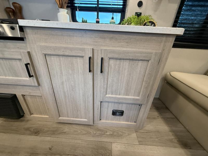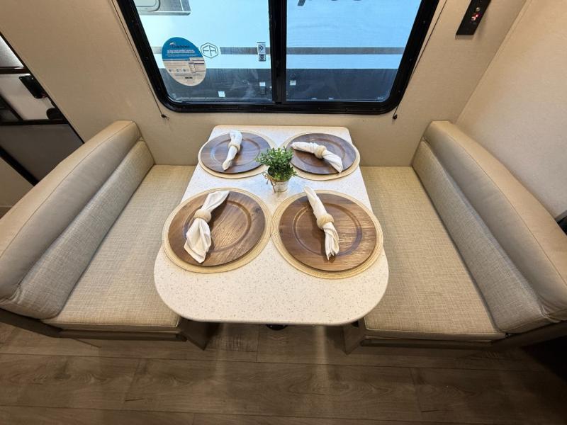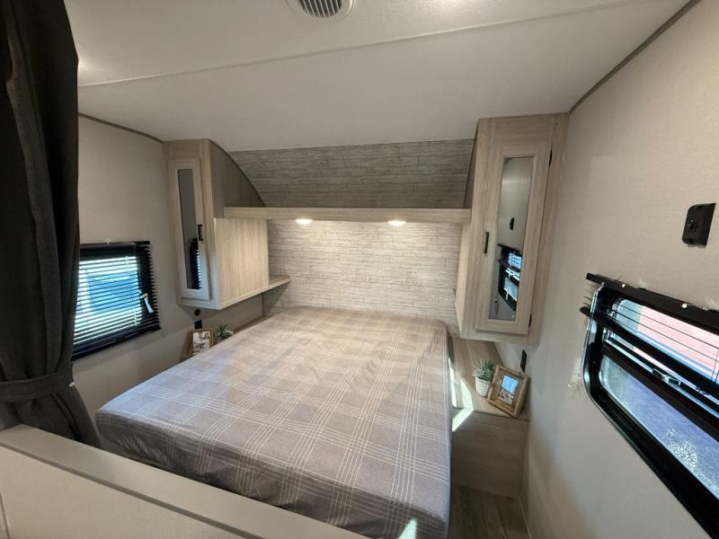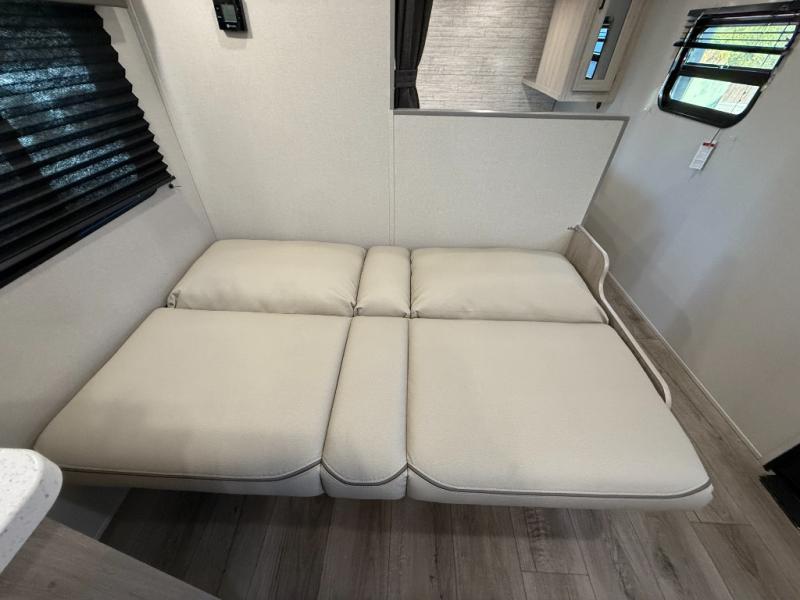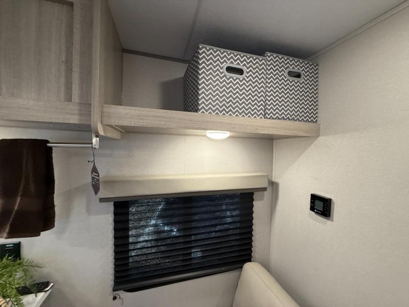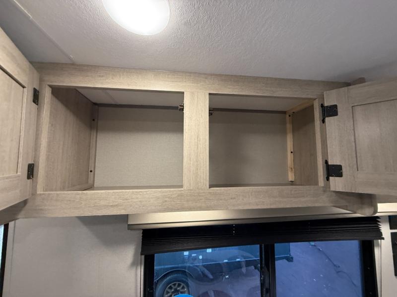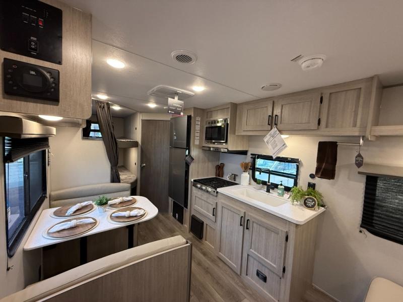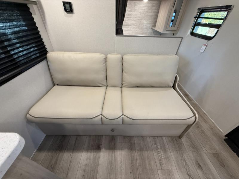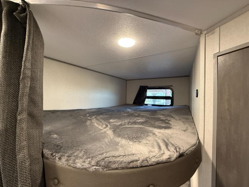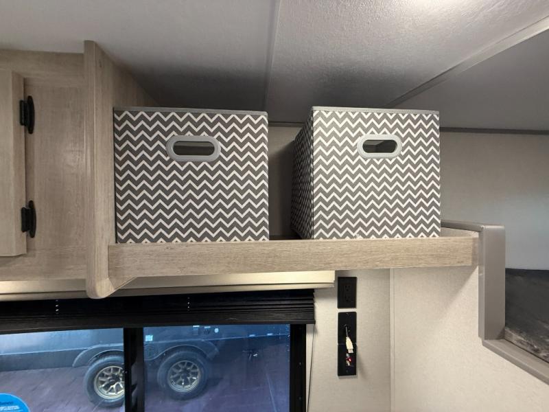 You get to choose to sit at the sofa or at the booth dinette when you are relaxing inside. There is a shelf with storage totes above the sofa for your belongings, and an additional overhead cabinet above the dinette for games. Maybe you want to rest on your own queen bed in the front semi-private bedroom before you make a meal in the kitchen or take a hike through the trails around the lake. The 15' electric awning with multi-color LED lights and a remote offers an outdoor living area where you can visit with other RVers. The kids will love their own double-size bunks that they can share with a friend or two, and the full bathroom is nearby as an added convenience.