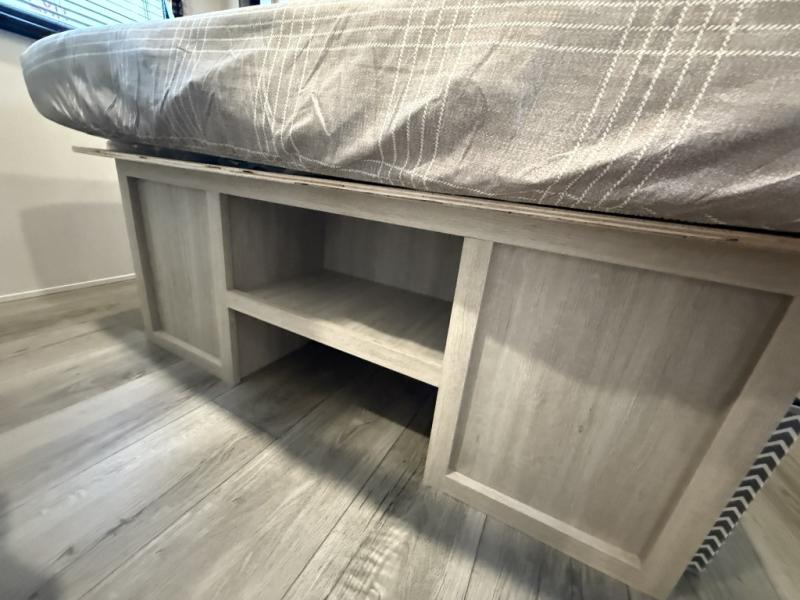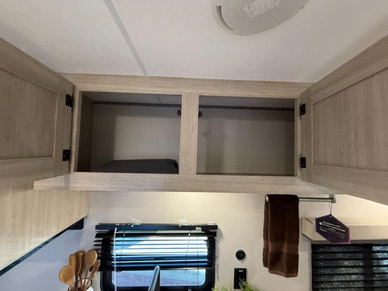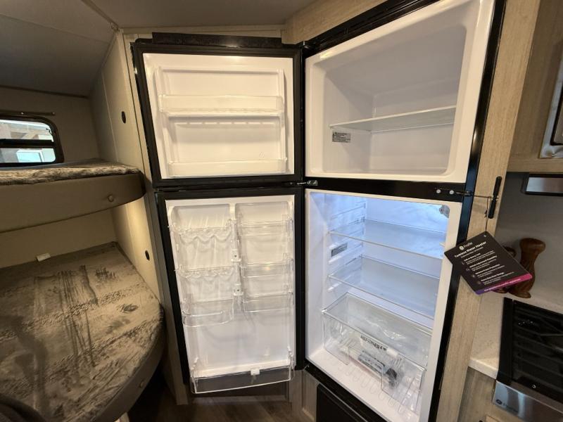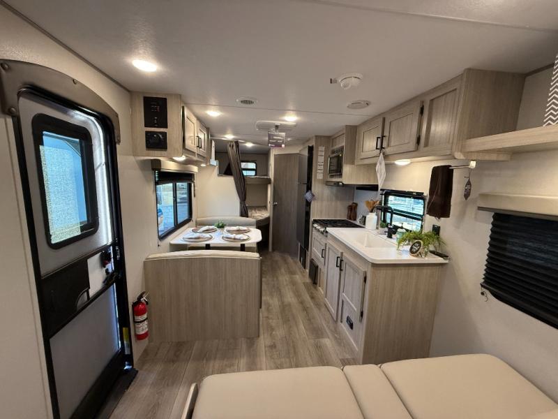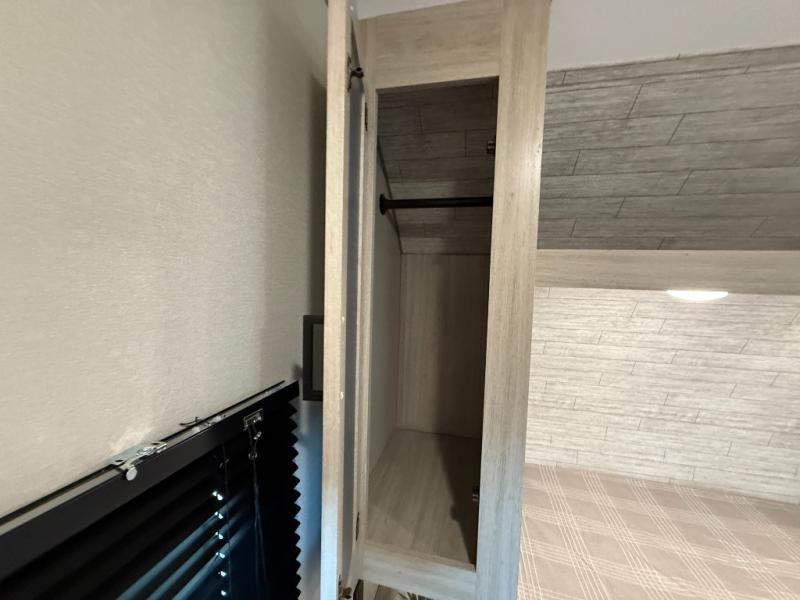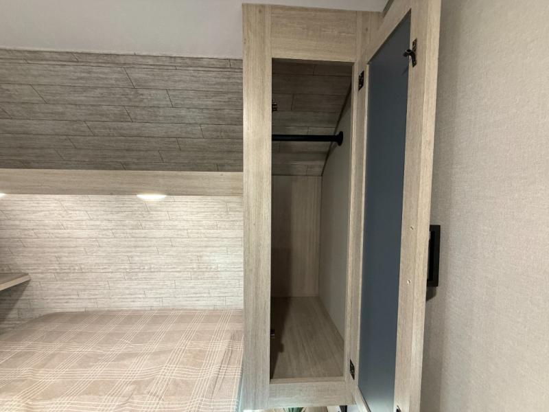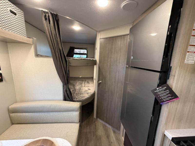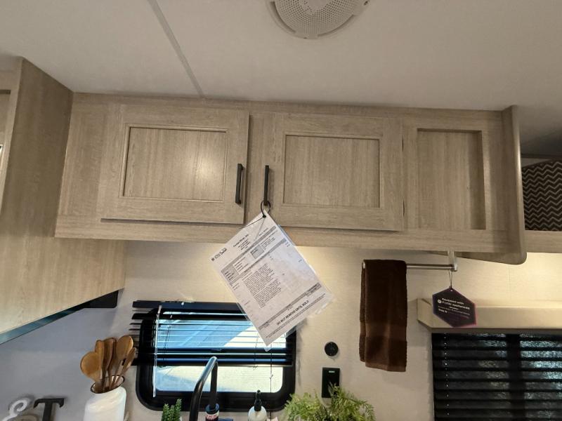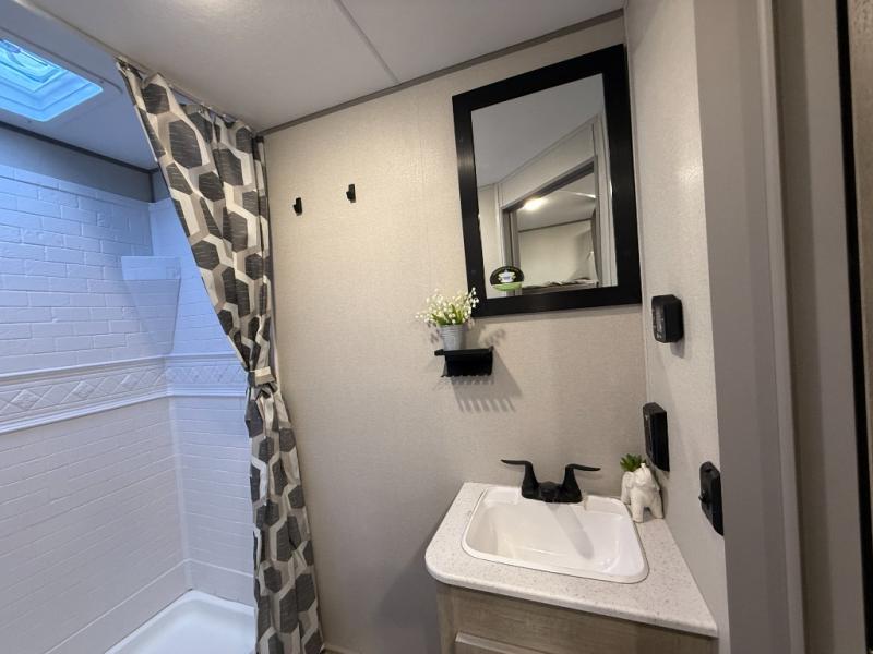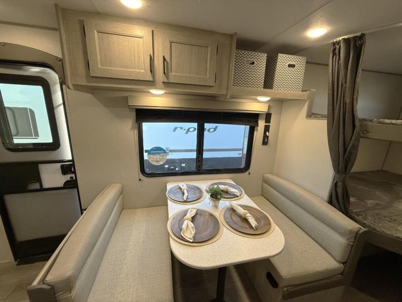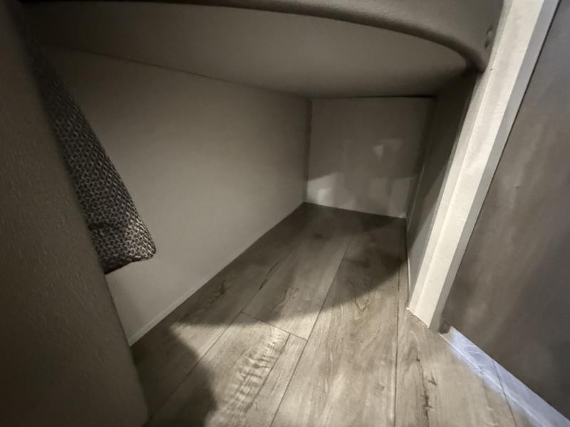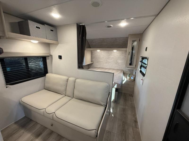 You get to choose to sit at the sofa or at the booth dinette when you are relaxing inside. There is a shelf with storage totes above the sofa for your belongings, and an additional overhead cabinet above the dinette for games. Maybe you want to rest on your own queen bed in the front semi-private bedroom before you make a meal in the kitchen or take a hike through the trails around the lake. The 15' electric awning with multi-color LED lights and a remote offers an outdoor living area where you can visit with other RVers. The kids will love their own double-size bunks that they can share with a friend or two, and the full bathroom is nearby as an added convenience.