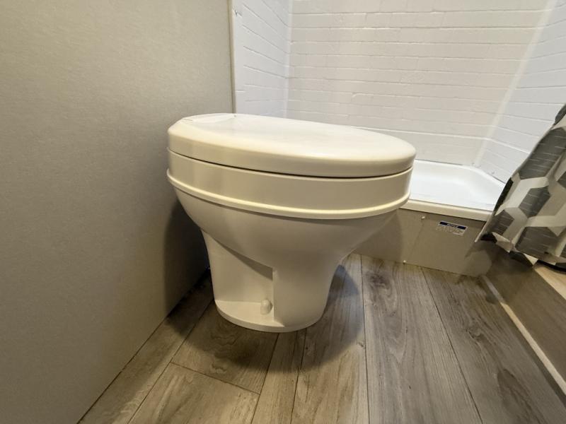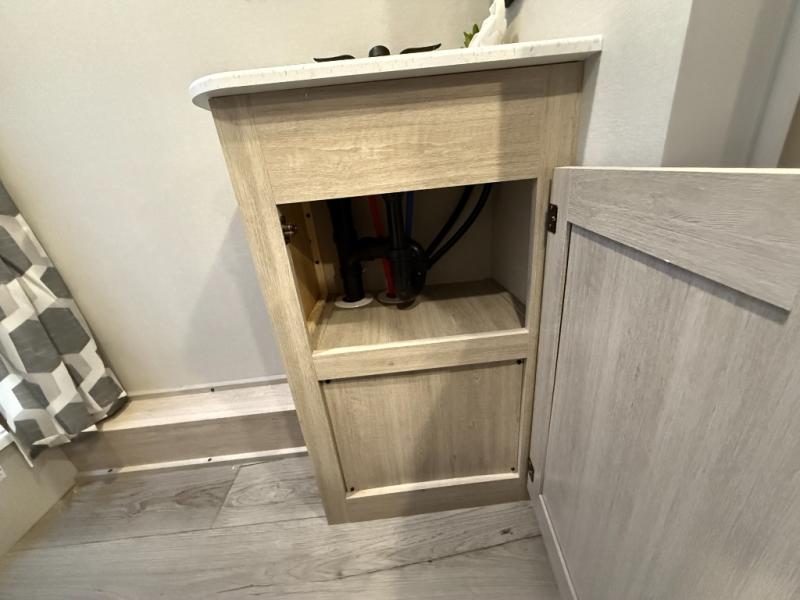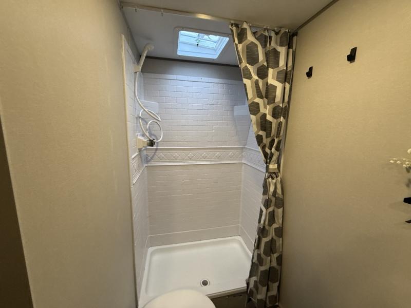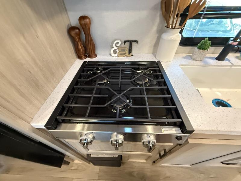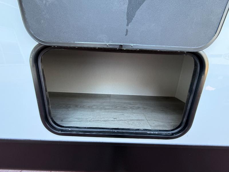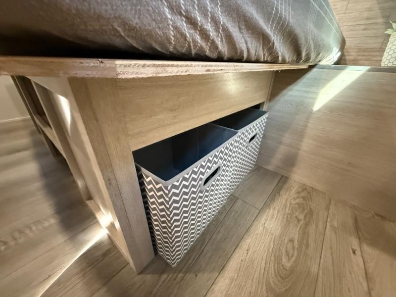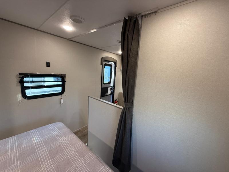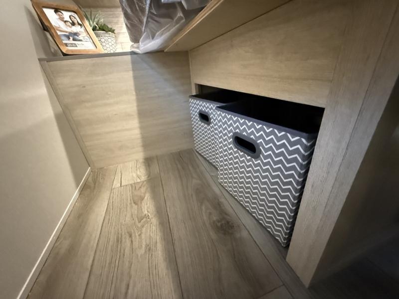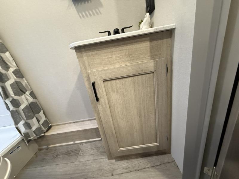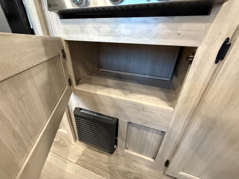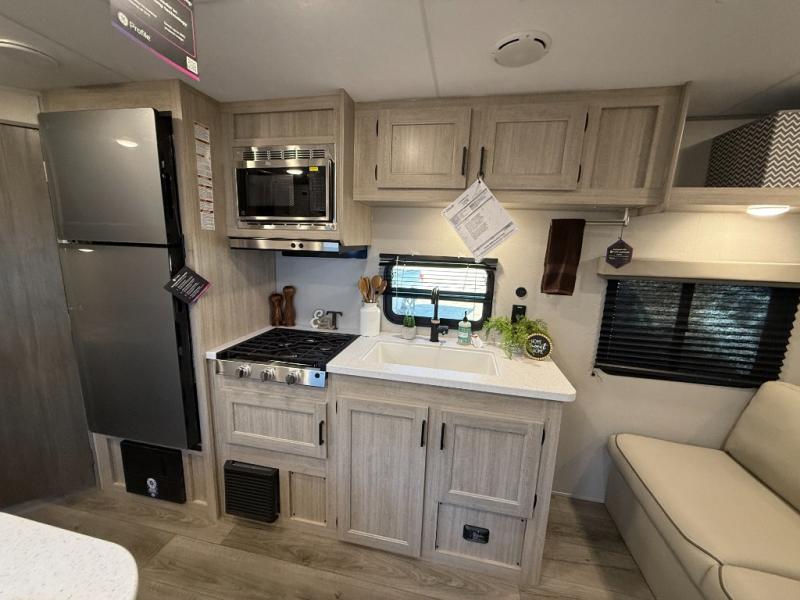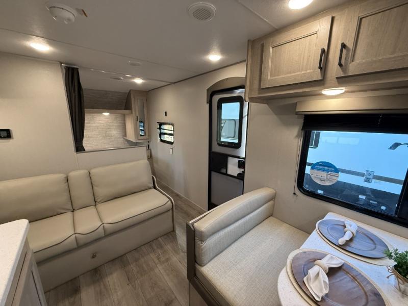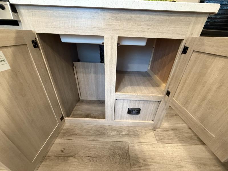 You get to choose to sit at the sofa or at the booth dinette when you are relaxing inside. There is a shelf with storage totes above the sofa for your belongings, and an additional overhead cabinet above the dinette for games. Maybe you want to rest on your own queen bed in the front semi-private bedroom before you make a meal in the kitchen or take a hike through the trails around the lake. The 15' electric awning with multi-color LED lights and a remote offers an outdoor living area where you can visit with other RVers. The kids will love their own double-size bunks that they can share with a friend or two, and the full bathroom is nearby as an added convenience.