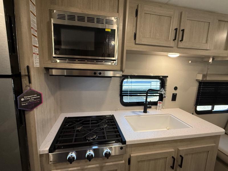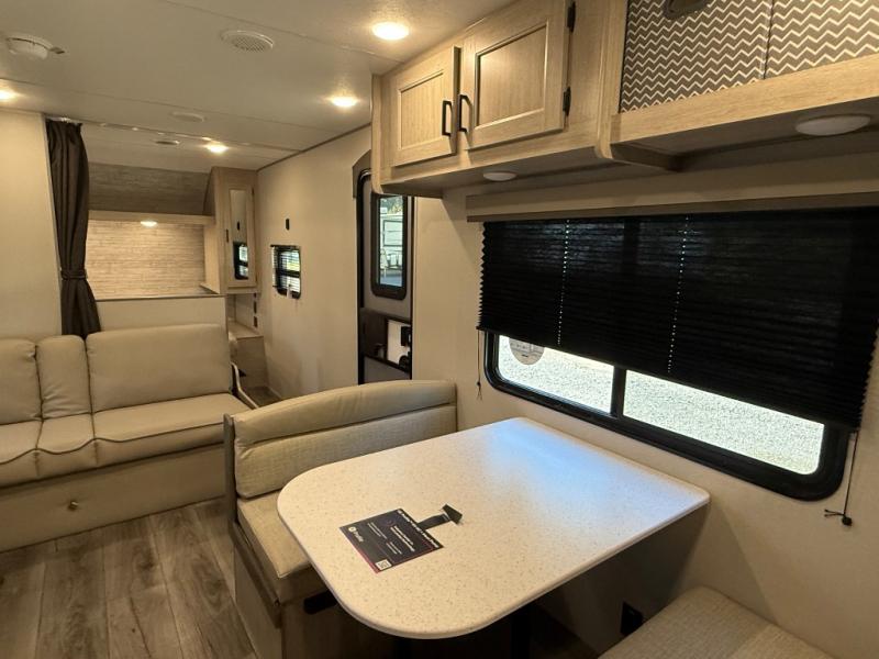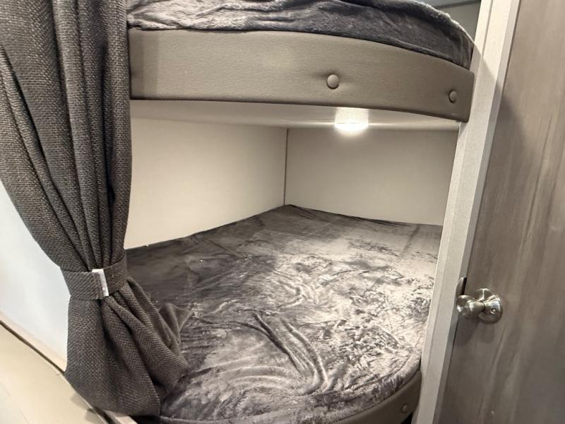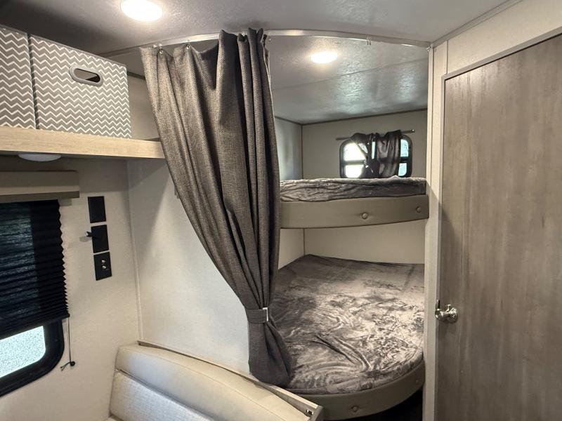 You get to choose to sit at the sofa or at the booth dinette when you are relaxing inside. There is a shelf with storage totes above the sofa for your belongings, and an additional overhead cabinet above the dinette for games. Maybe you want to rest on your own queen bed in the front semi-private bedroom before you make a meal in the kitchen or take a hike through the trails around the lake. The 15' electric awning with multi-color LED lights and a remote offers an outdoor living area where you can visit with other RVers. The kids will love their own double-size bunks that they can share with a friend or two, and the full bathroom is nearby as an added convenience.