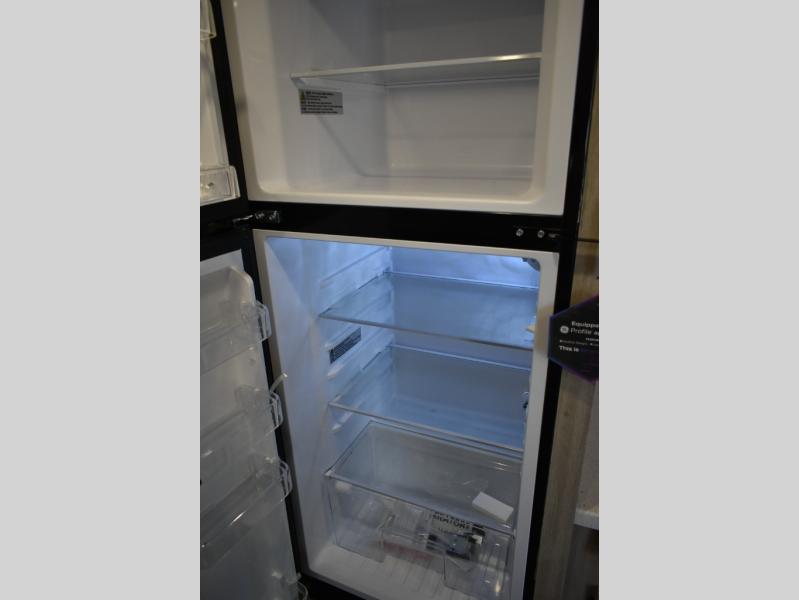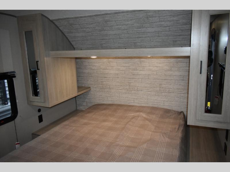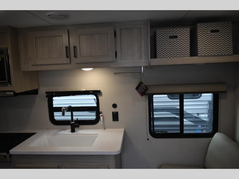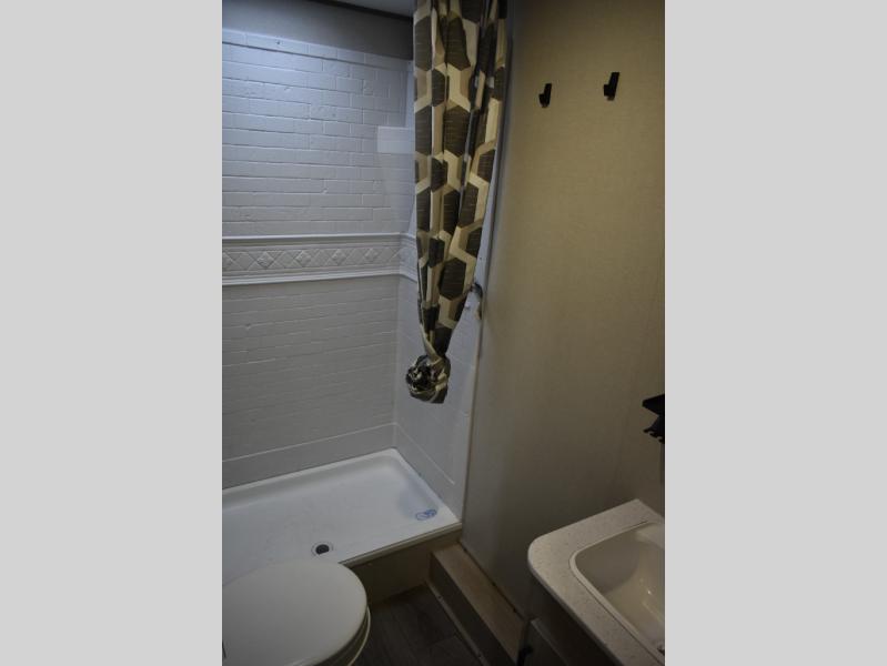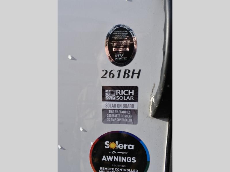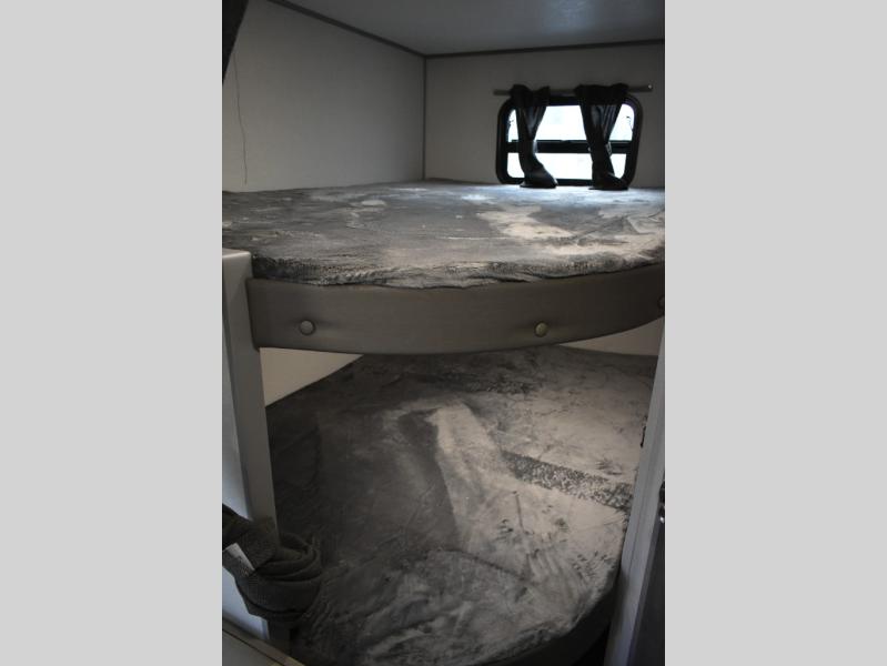 You get to choose to sit at the sofa or at the booth dinette when you are relaxing inside. There is a shelf with storage totes above the sofa for your belongings, and an additional overhead cabinet above the dinette for games. Maybe you want to rest on your own queen bed in the front semi-private bedroom before you make a meal in the kitchen or take a hike through the trails around the lake. The 15' electric awning with multi-color LED lights and a remote offers an outdoor living area where you can visit with other RVers. The kids will love their own double-size bunks that they can share with a friend or two, and the full bathroom is nearby as an added convenience.