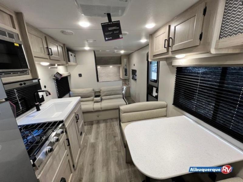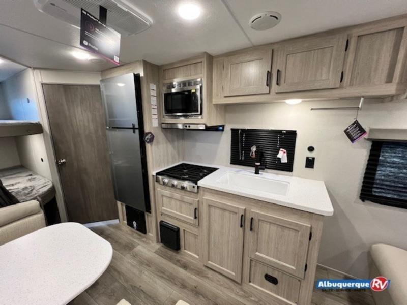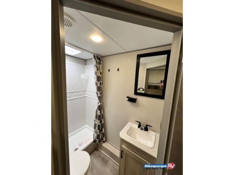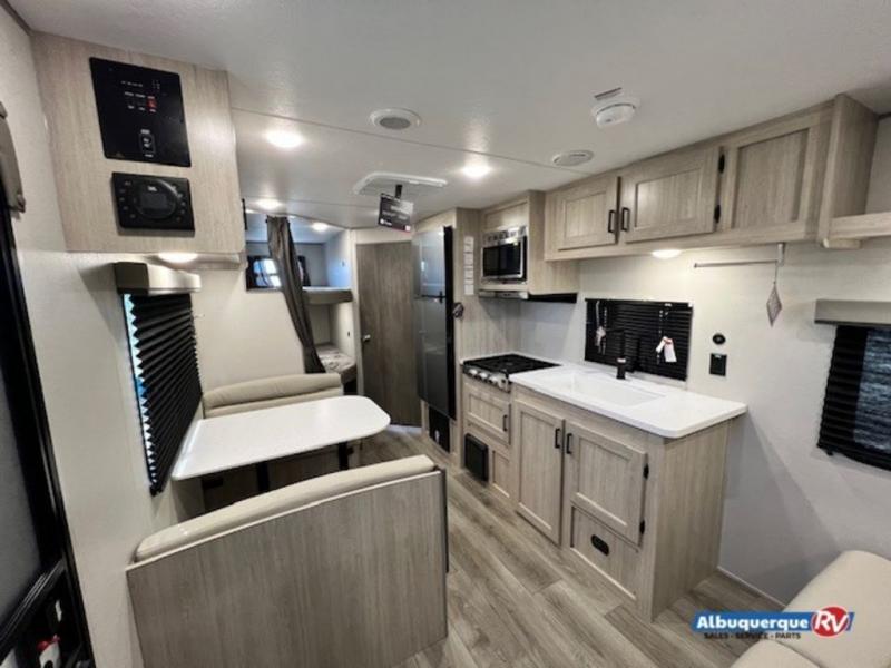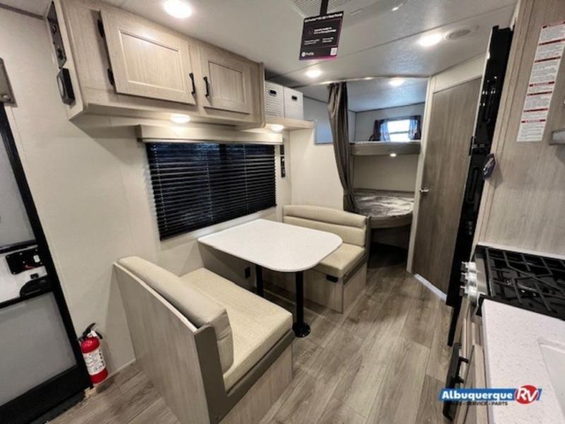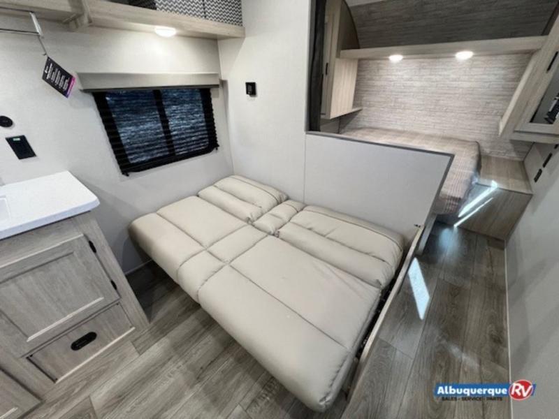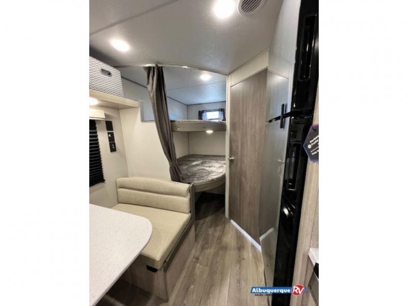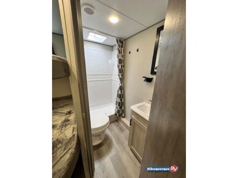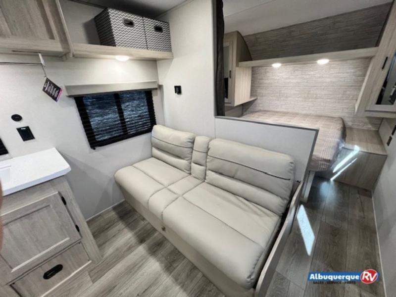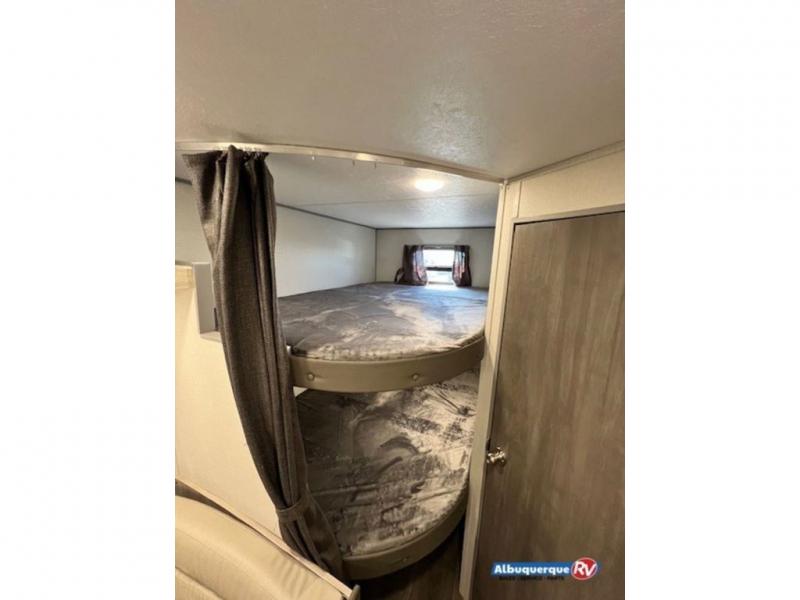 You get to choose to sit at the sofa or at the booth dinette when you are relaxing inside. There is a shelf with storage totes above the sofa for your belongings, and an additional overhead cabinet above the dinette for games. Maybe you want to rest on your own queen bed in the front semi-private bedroom before you make a meal in the kitchen or take a hike through the trails around the lake. The 15' electric awning with multi-color LED lights and a remote offers an outdoor living area where you can visit with other RVers. The kids will love their own double-size bunks that they can share with a friend or two, and the full bathroom is nearby as an added convenience.