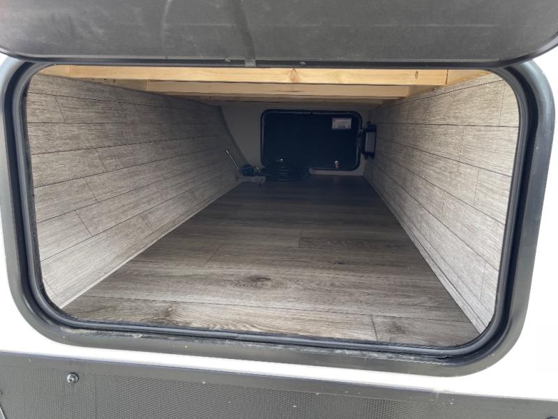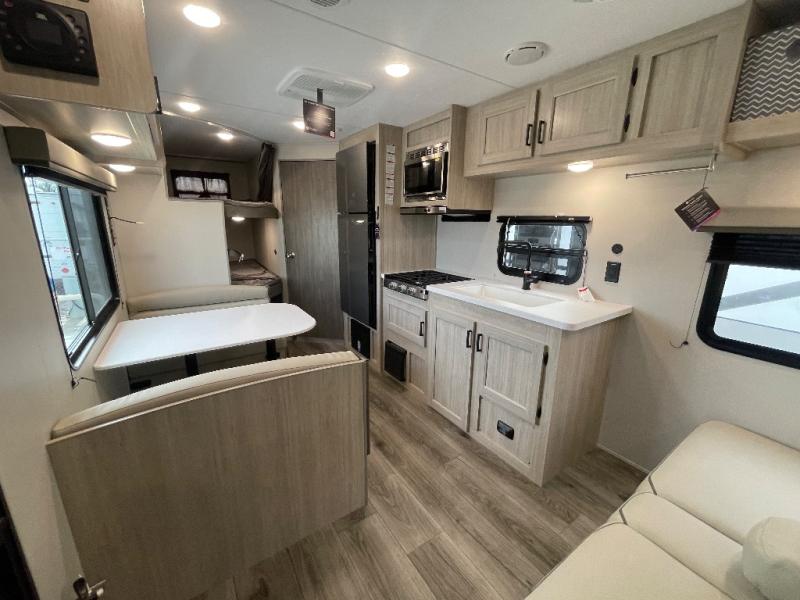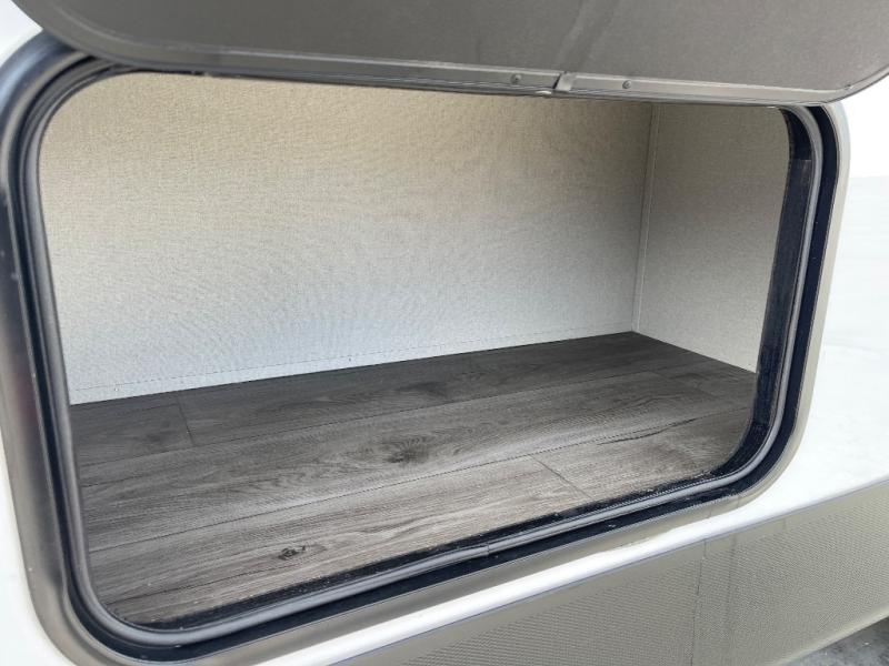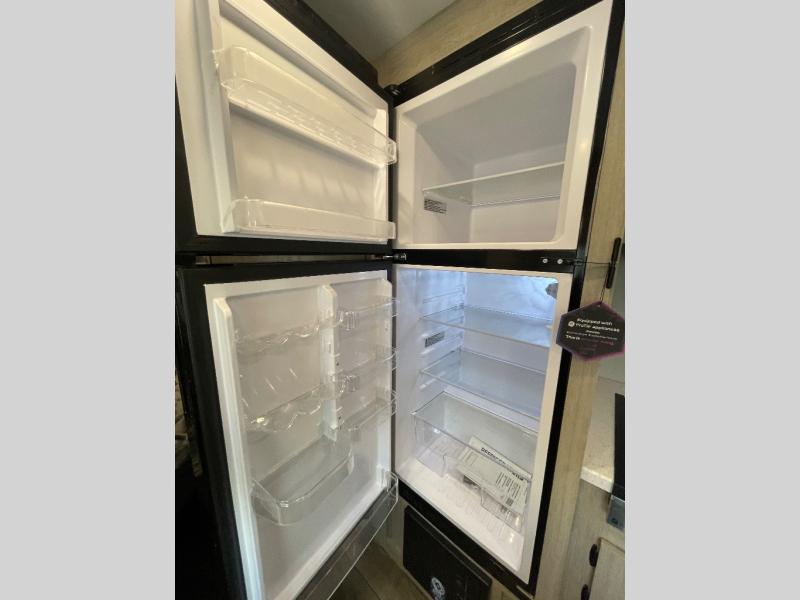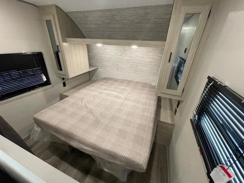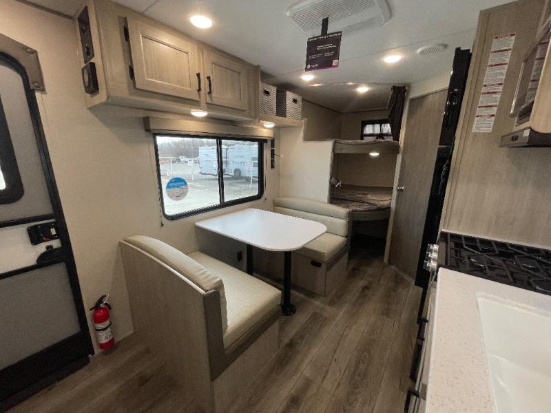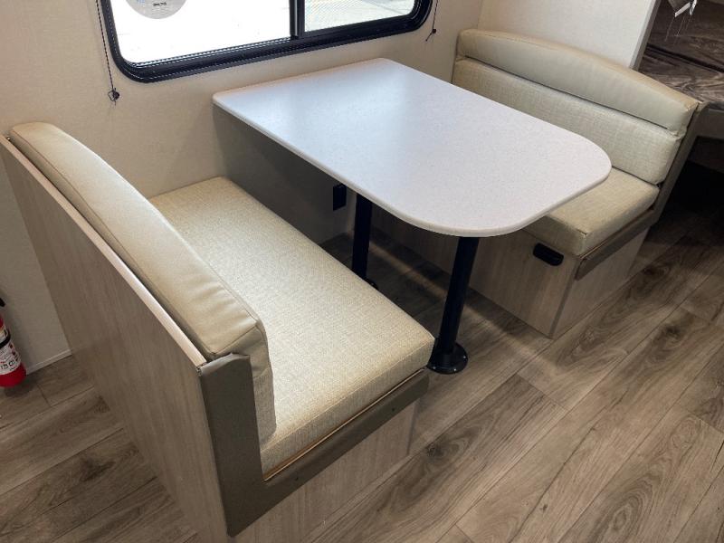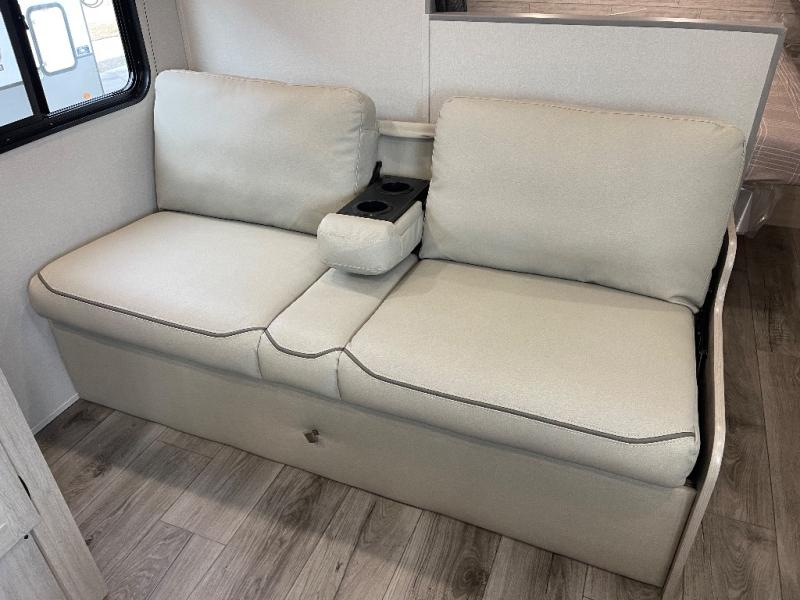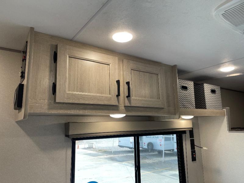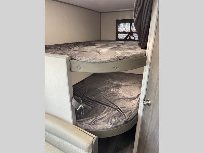 You get to choose to sit at the sofa or at the booth dinette when you are relaxing inside. There is a shelf with storage totes above the sofa for your belongings, and an additional overhead cabinet above the dinette for games. Maybe you want to rest on your own queen bed in the front semi-private bedroom before you make a meal in the kitchen or take a hike through the trails around the lake. The 15' electric awning with multi-color LED lights and a remote offers an outdoor living area where you can visit with other RVers. The kids will love their own double-size bunks that they can share with a friend or two, and the full bathroom is nearby as an added convenience.
