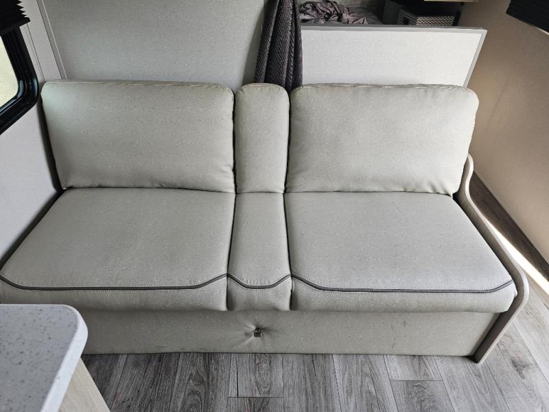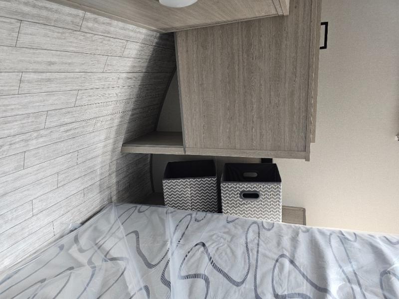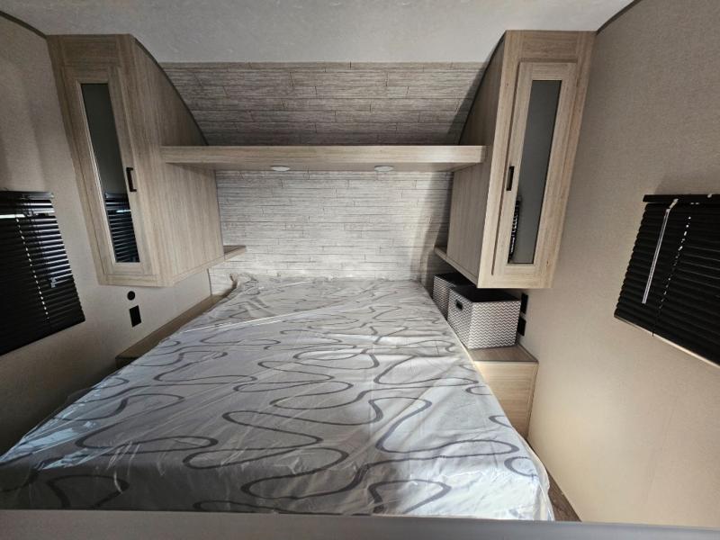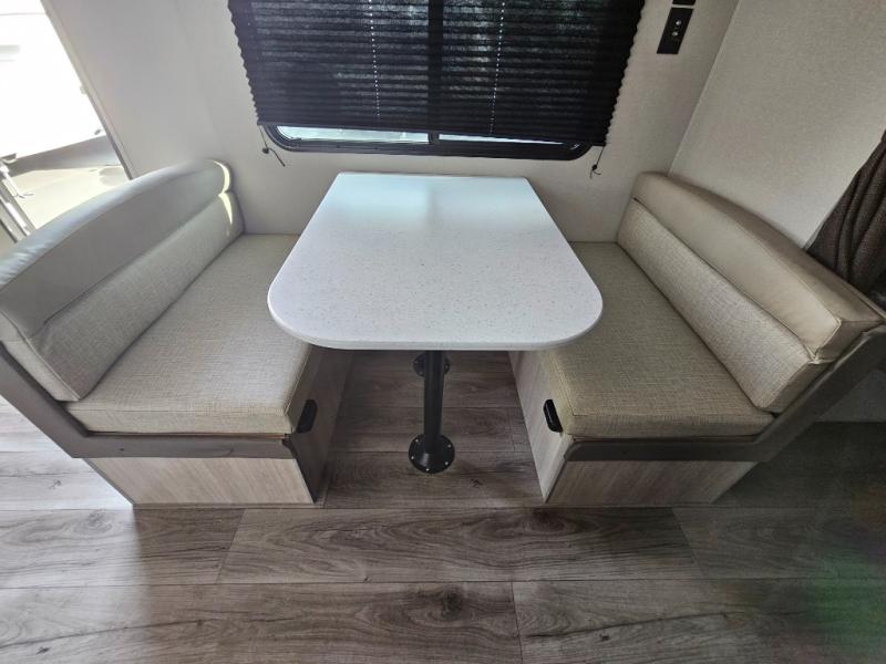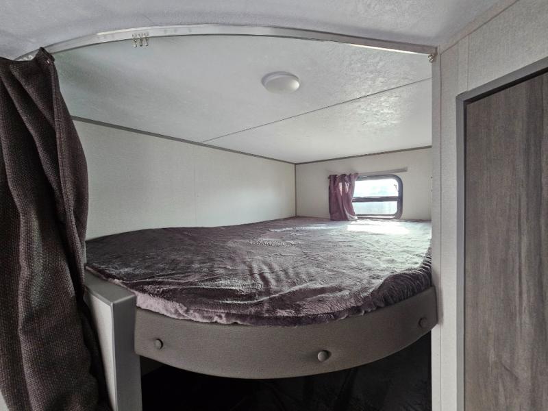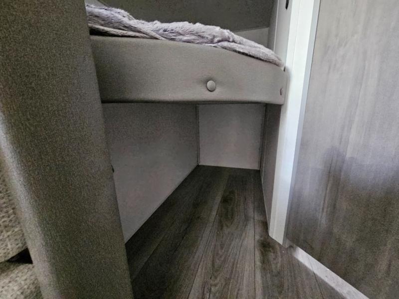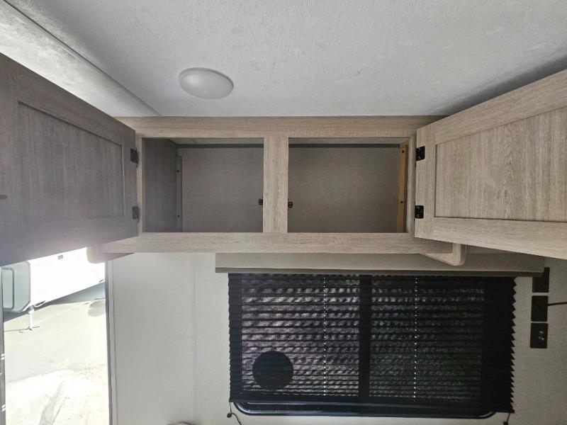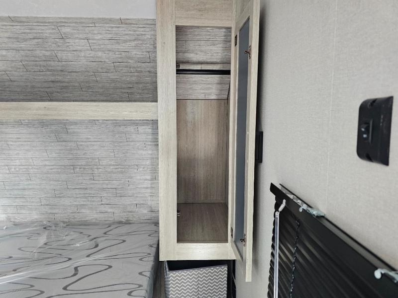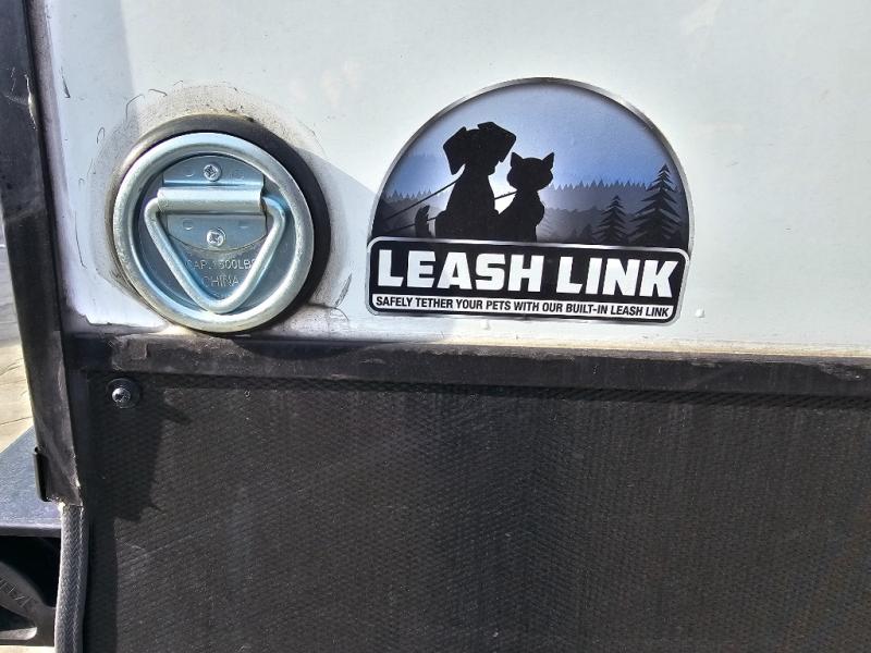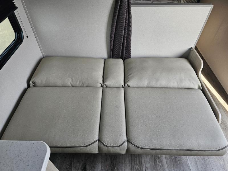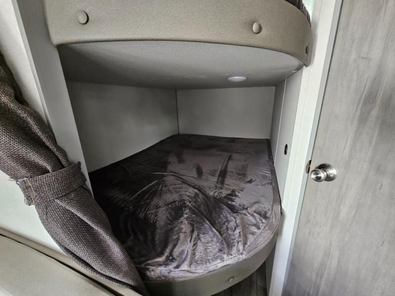You get to choose to sit at the sofa or at the booth dinette when you are relaxing inside. There is a shelf with storage totes above the sofa for your belongings, and an additional overhead cabinet above the dinette for games. Maybe you want to rest on your own queen bed in the front semi-private bedroom before you make a meal in the kitchen or take a hike through the trails around the lake. The 15' electric awning with multi-color LED lights and a remote offers an outdoor living area where you can visit with other RVers. The kids will love their own double-size bunks that they can share with a friend or two, and the full bathroom is nearby as an added convenience.