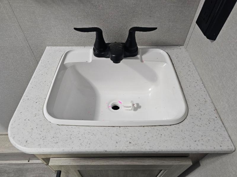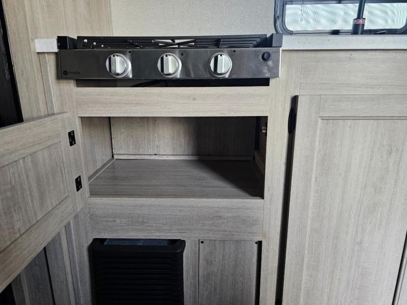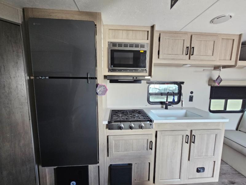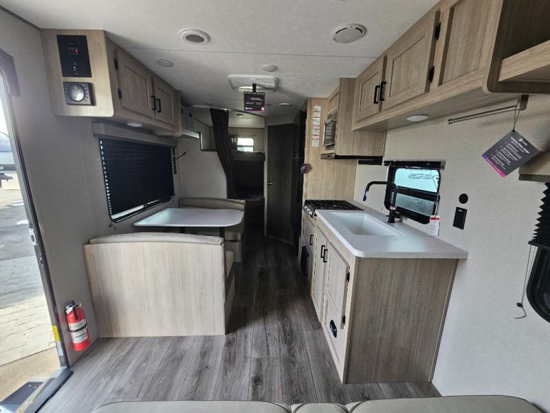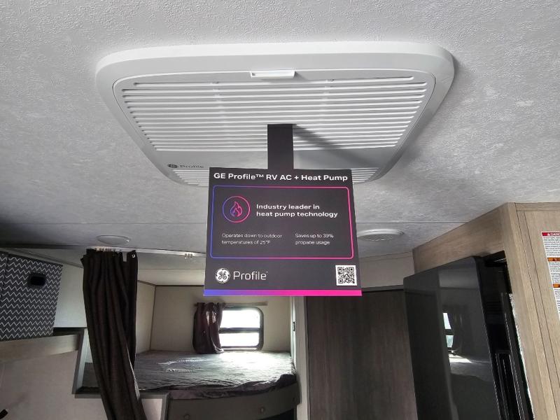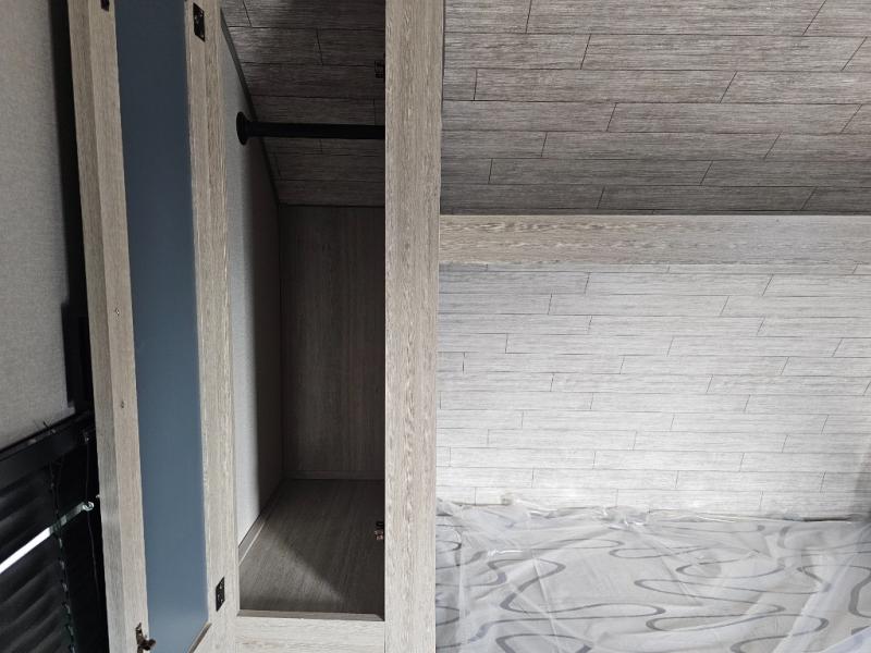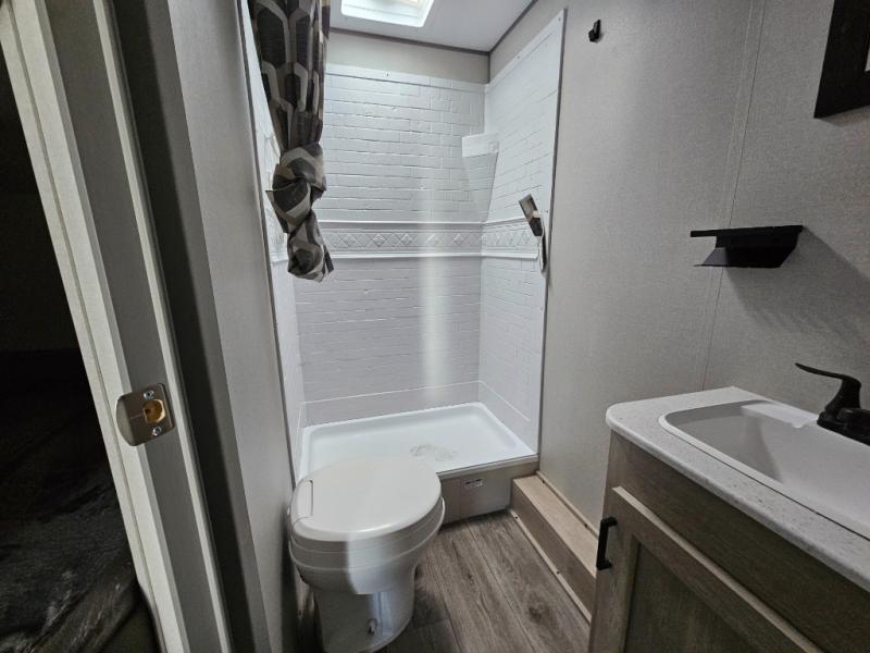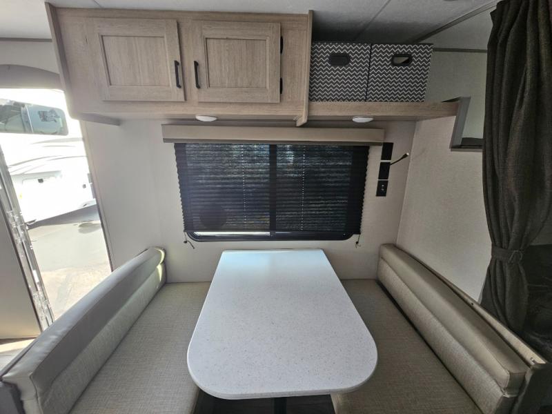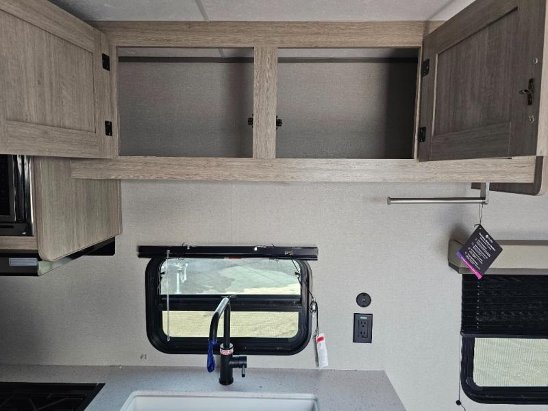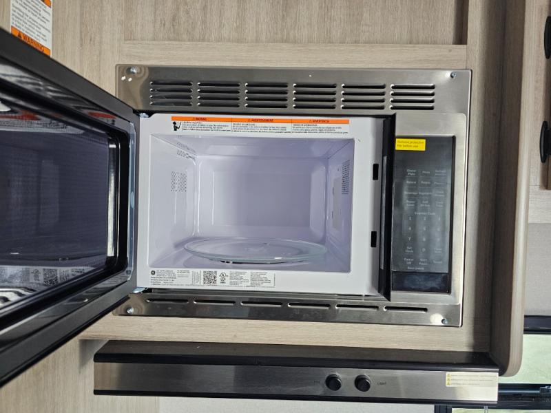 You get to choose to sit at the sofa or at the booth dinette when you are relaxing inside. There is a shelf with storage totes above the sofa for your belongings, and an additional overhead cabinet above the dinette for games. Maybe you want to rest on your own queen bed in the front semi-private bedroom before you make a meal in the kitchen or take a hike through the trails around the lake. The 15' electric awning with multi-color LED lights and a remote offers an outdoor living area where you can visit with other RVers. The kids will love their own double-size bunks that they can share with a friend or two, and the full bathroom is nearby as an added convenience.
