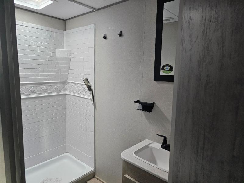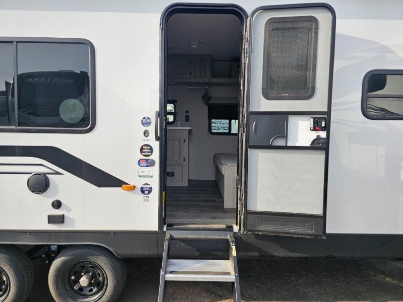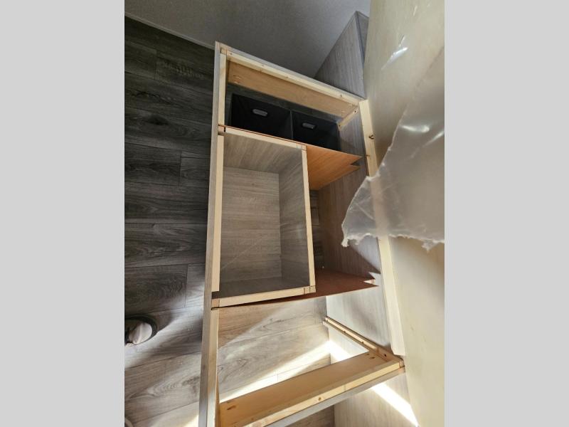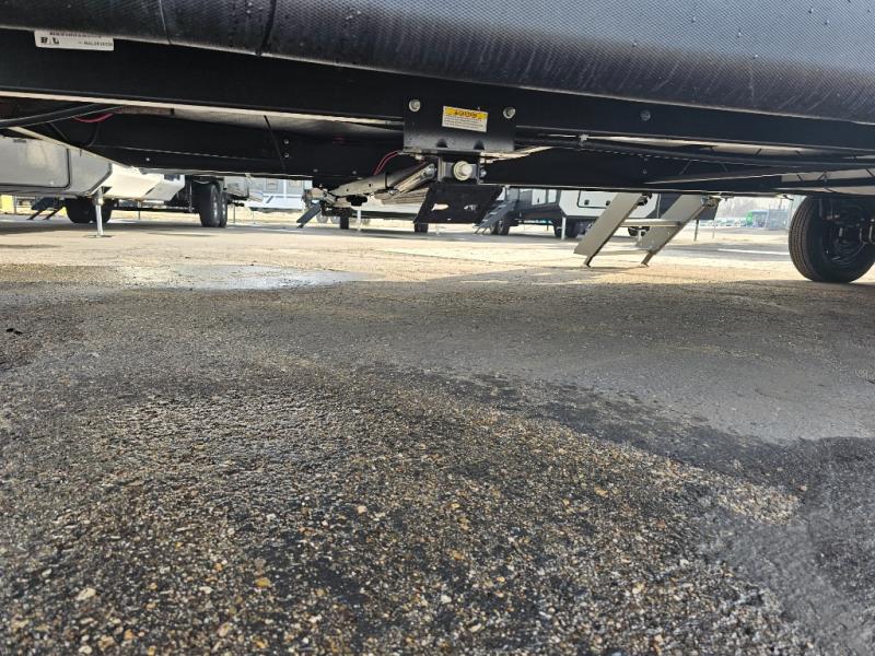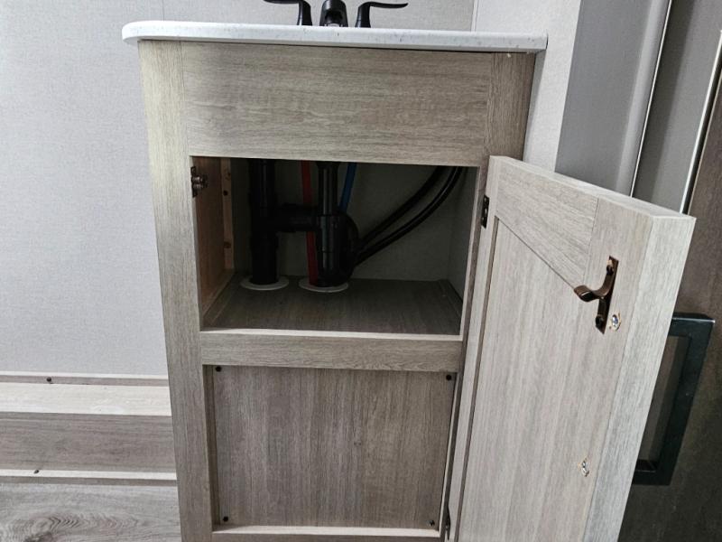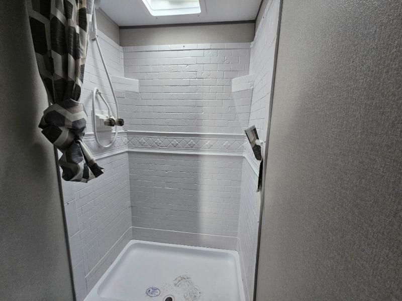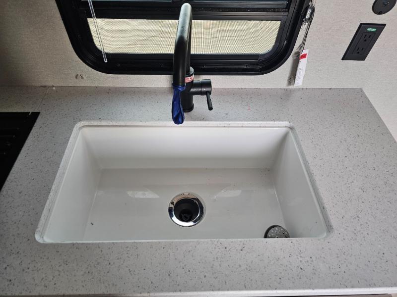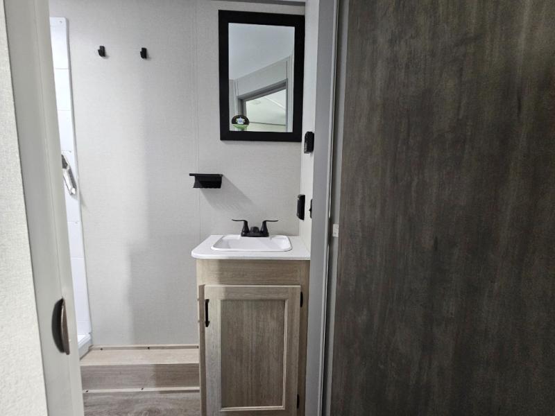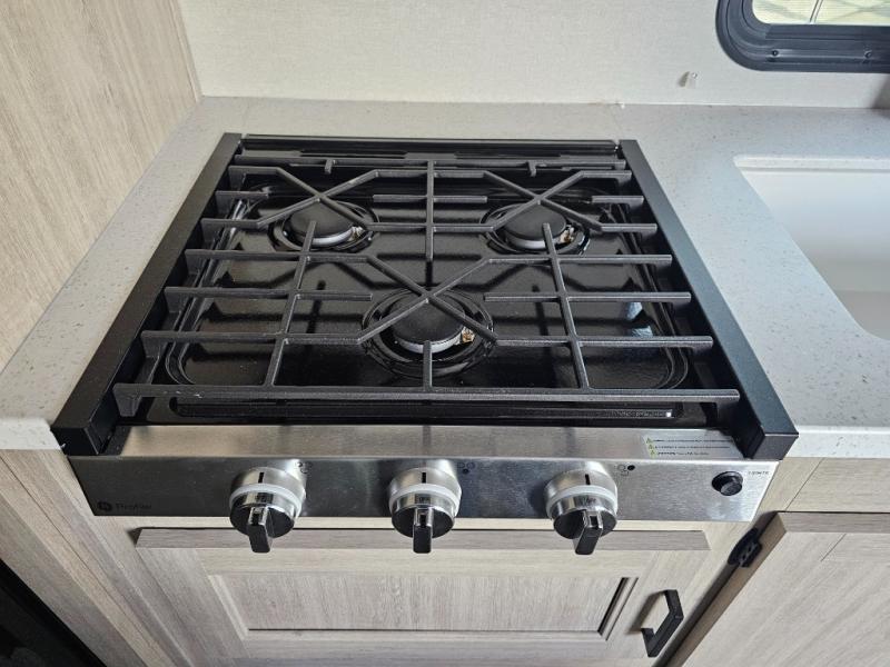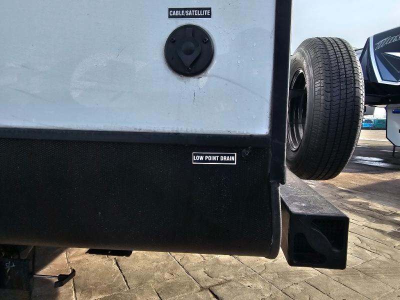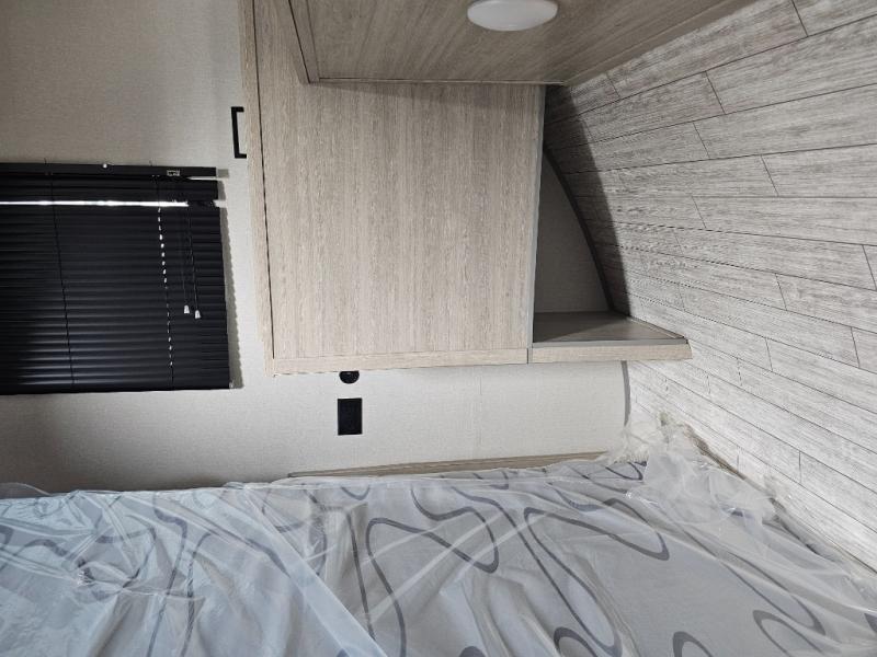 You get to choose to sit at the sofa or at the booth dinette when you are relaxing inside. There is a shelf with storage totes above the sofa for your belongings, and an additional overhead cabinet above the dinette for games. Maybe you want to rest on your own queen bed in the front semi-private bedroom before you make a meal in the kitchen or take a hike through the trails around the lake. The 15' electric awning with multi-color LED lights and a remote offers an outdoor living area where you can visit with other RVers. The kids will love their own double-size bunks that they can share with a friend or two, and the full bathroom is nearby as an added convenience.
