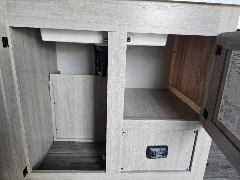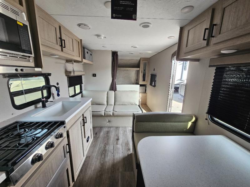 You get to choose to sit at the sofa or at the booth dinette when you are relaxing inside. There is a shelf with storage totes above the sofa for your belongings, and an additional overhead cabinet above the dinette for games. Maybe you want to rest on your own queen bed in the front semi-private bedroom before you make a meal in the kitchen or take a hike through the trails around the lake. The 15' electric awning with multi-color LED lights and a remote offers an outdoor living area where you can visit with other RVers. The kids will love their own double-size bunks that they can share with a friend or two, and the full bathroom is nearby as an added convenience.