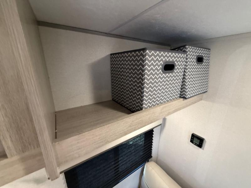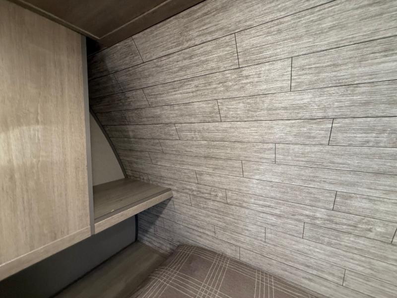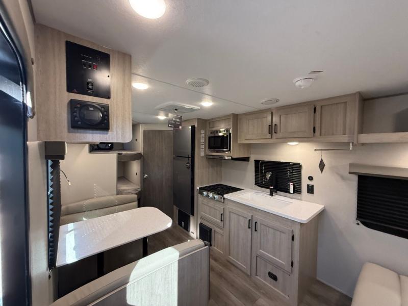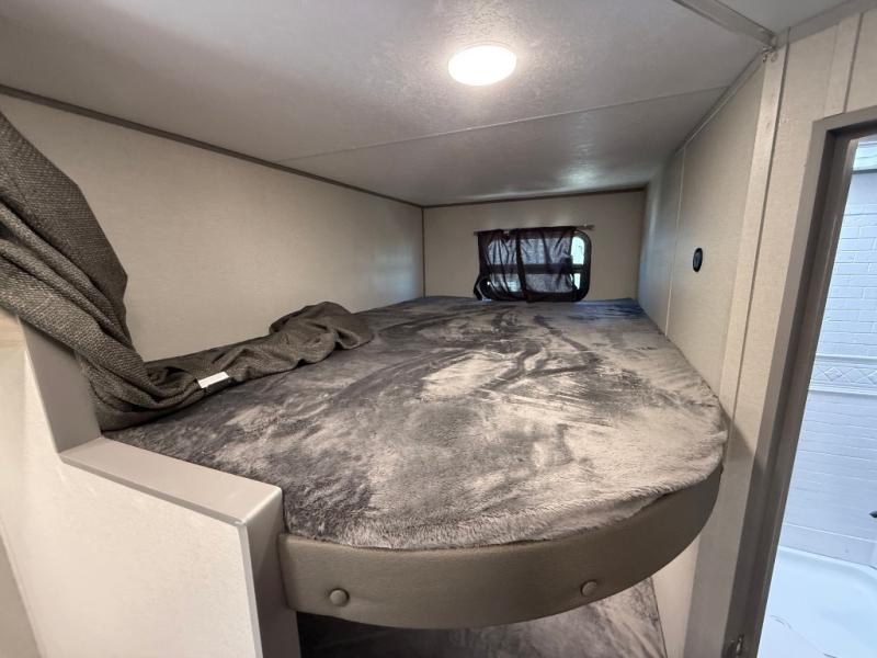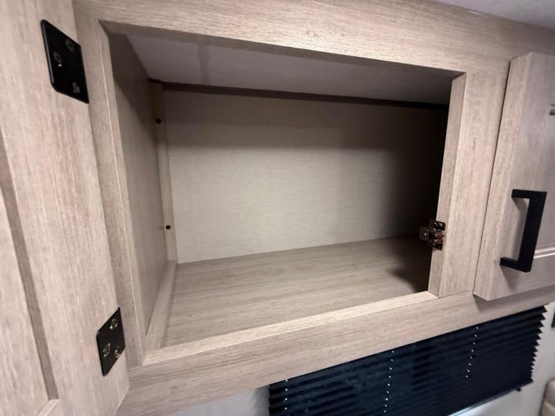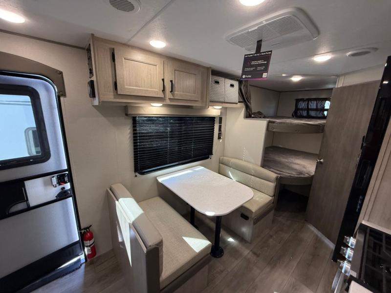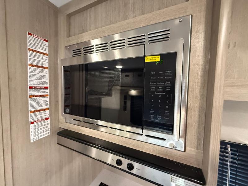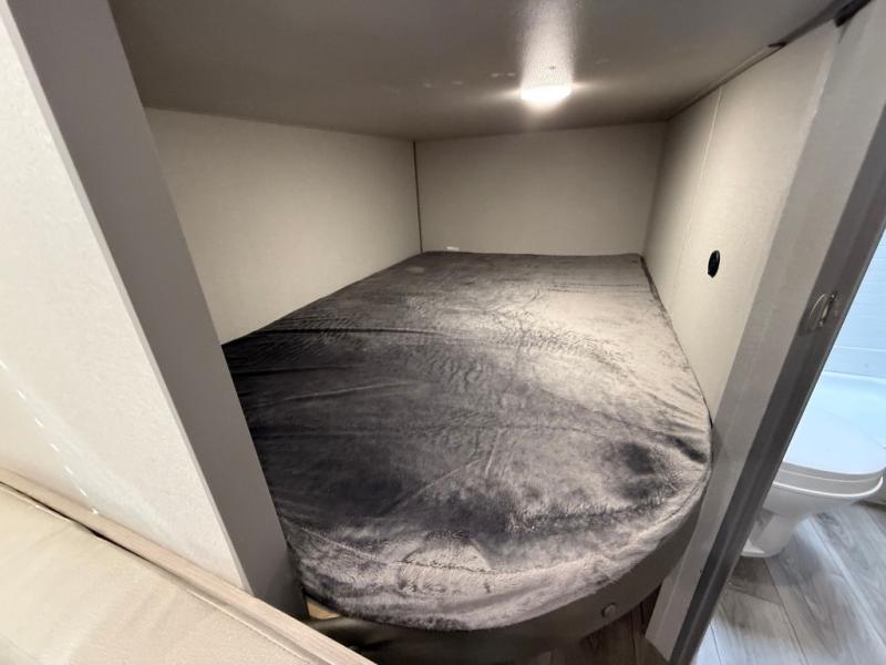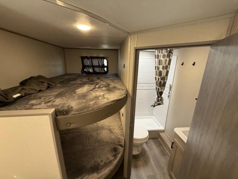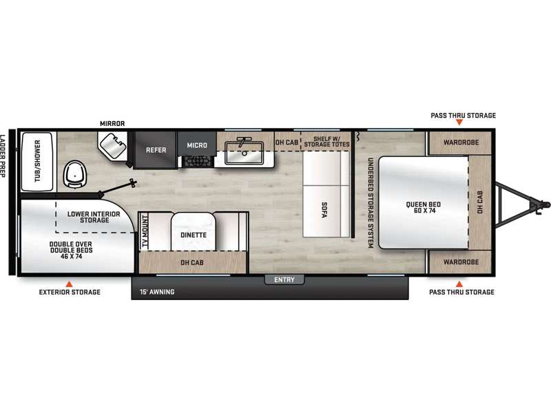 You get to choose to sit at the sofa or at the booth dinette when you are relaxing inside. There is a shelf with storage totes above the sofa for your belongings, and an additional overhead cabinet above the dinette for games. Maybe you want to rest on your own queen bed in the front semi-private bedroom before you make a meal in the kitchen or take a hike through the trails around the lake. The 15' electric awning with multi-color LED lights and a remote offers an outdoor living area where you can visit with other RVers. The kids will love their own double-size bunks that they can share with a friend or two, and the full bathroom is nearby as an added convenience.