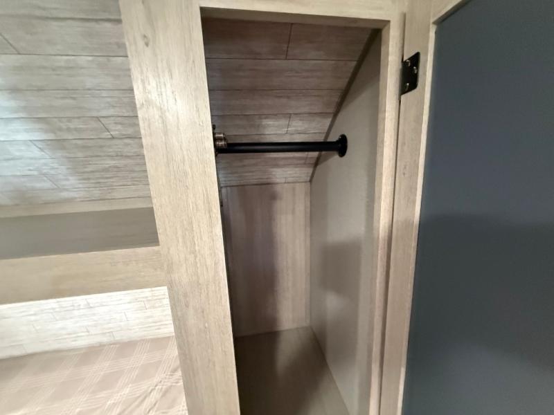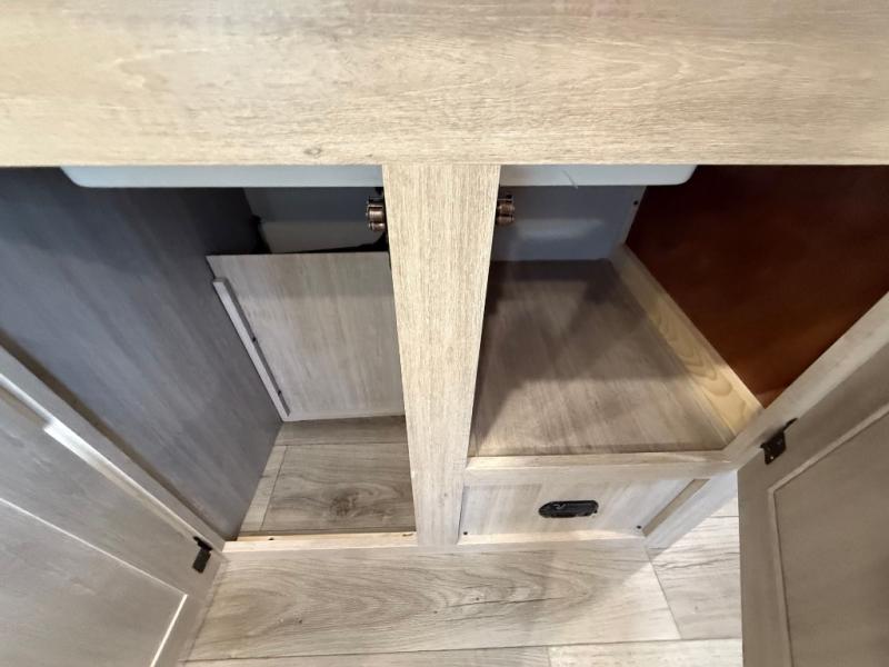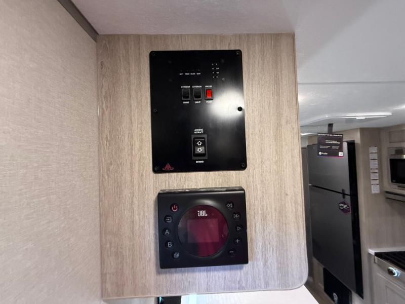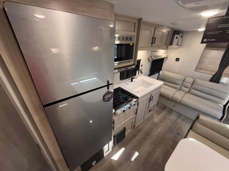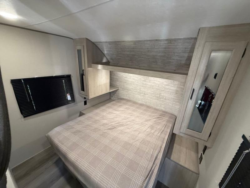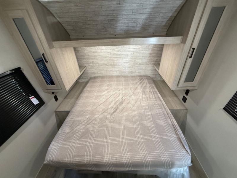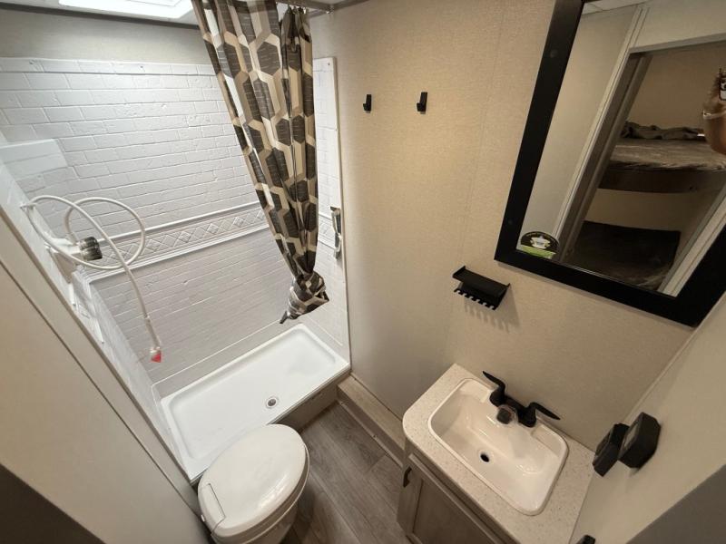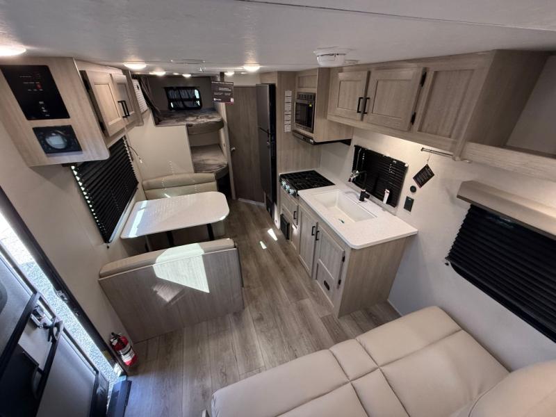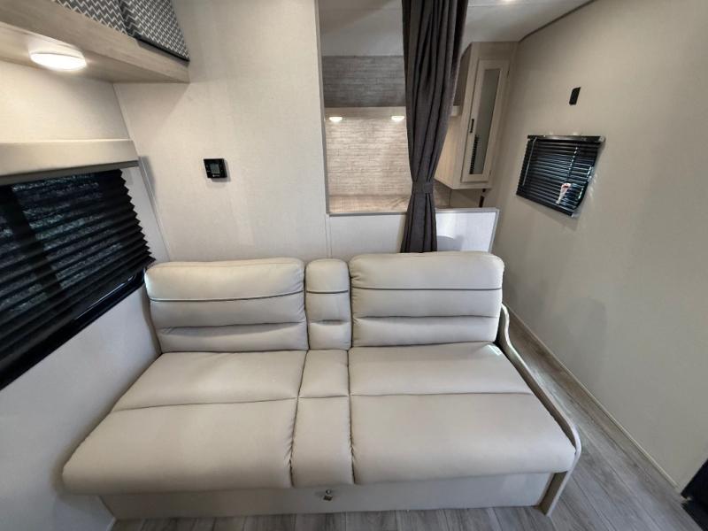 You get to choose to sit at the sofa or at the booth dinette when you are relaxing inside. There is a shelf with storage totes above the sofa for your belongings, and an additional overhead cabinet above the dinette for games. Maybe you want to rest on your own queen bed in the front semi-private bedroom before you make a meal in the kitchen or take a hike through the trails around the lake. The 15' electric awning with multi-color LED lights and a remote offers an outdoor living area where you can visit with other RVers. The kids will love their own double-size bunks that they can share with a friend or two, and the full bathroom is nearby as an added convenience.