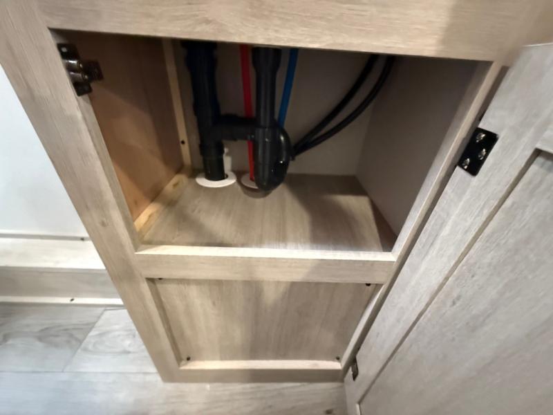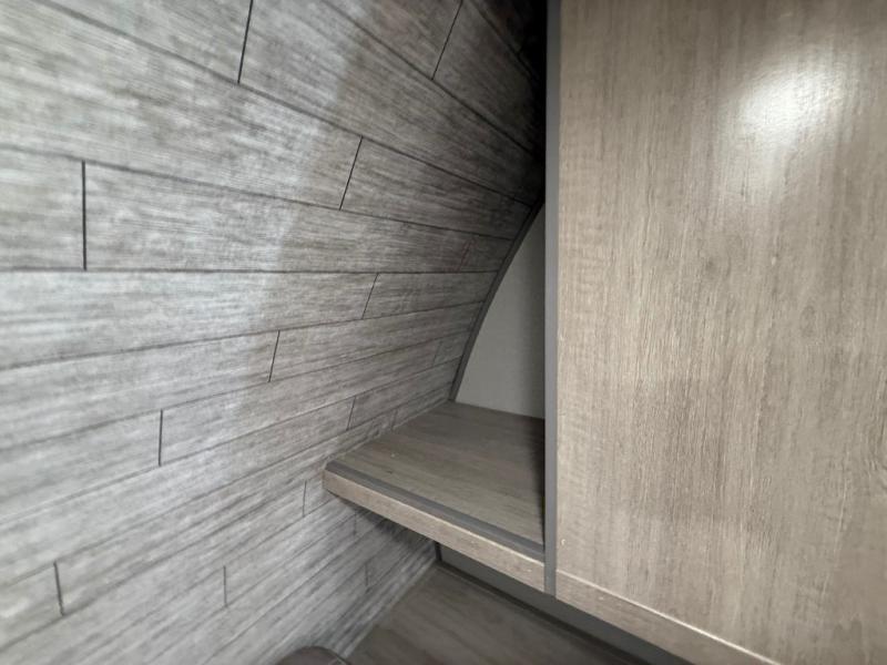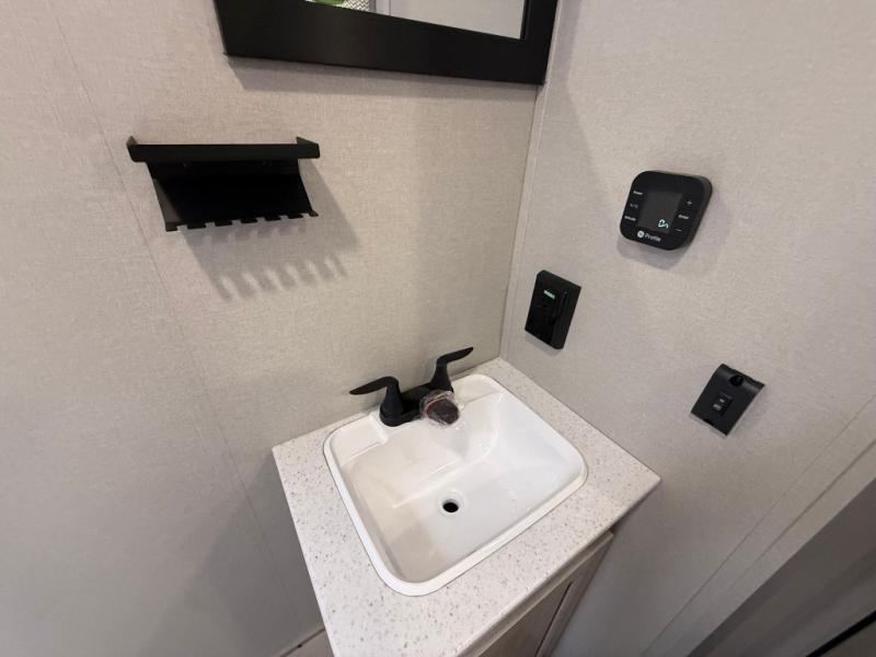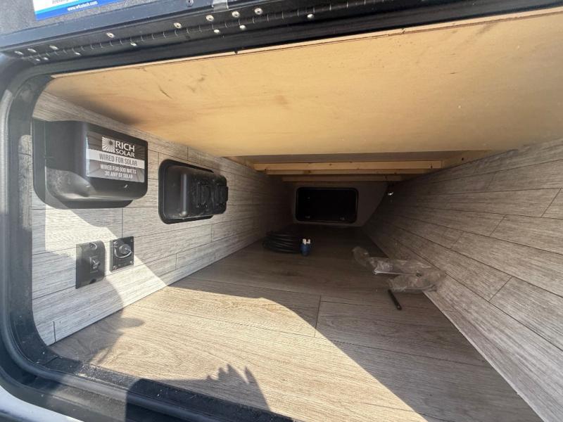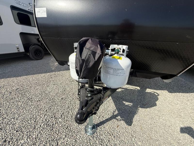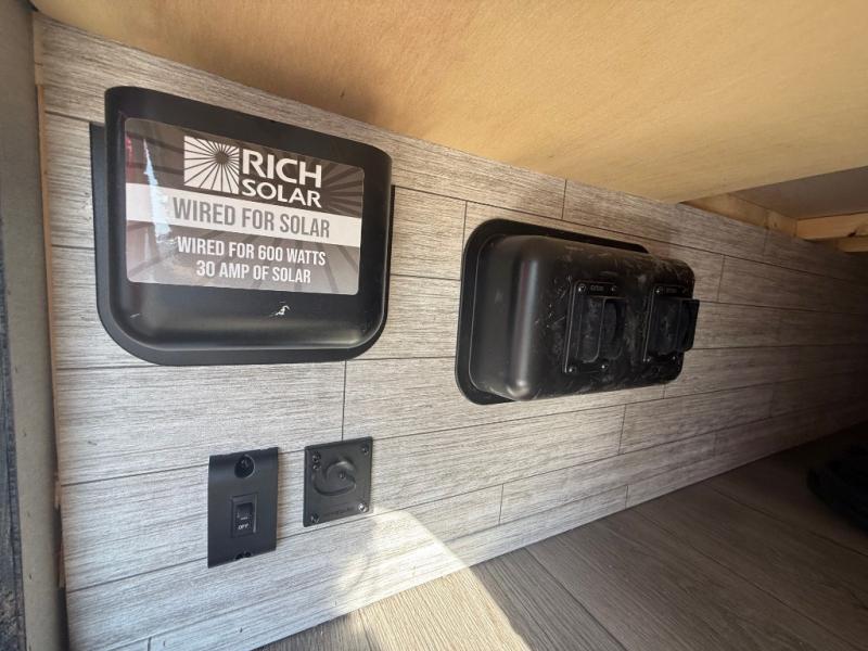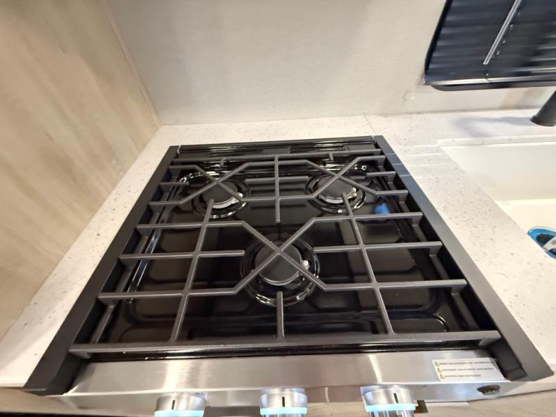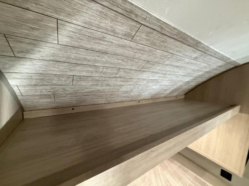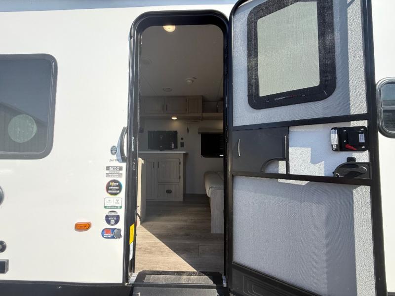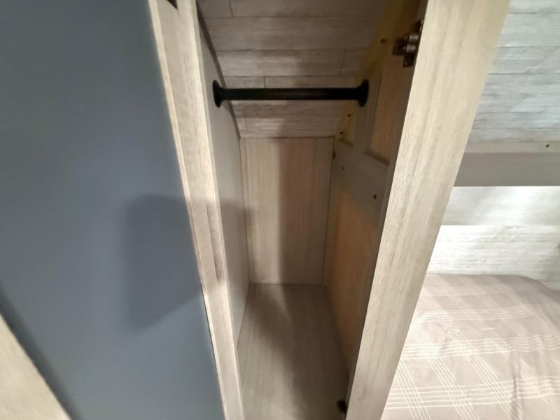 You get to choose to sit at the sofa or at the booth dinette when you are relaxing inside. There is a shelf with storage totes above the sofa for your belongings, and an additional overhead cabinet above the dinette for games. Maybe you want to rest on your own queen bed in the front semi-private bedroom before you make a meal in the kitchen or take a hike through the trails around the lake. The 15' electric awning with multi-color LED lights and a remote offers an outdoor living area where you can visit with other RVers. The kids will love their own double-size bunks that they can share with a friend or two, and the full bathroom is nearby as an added convenience.