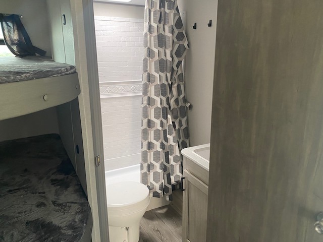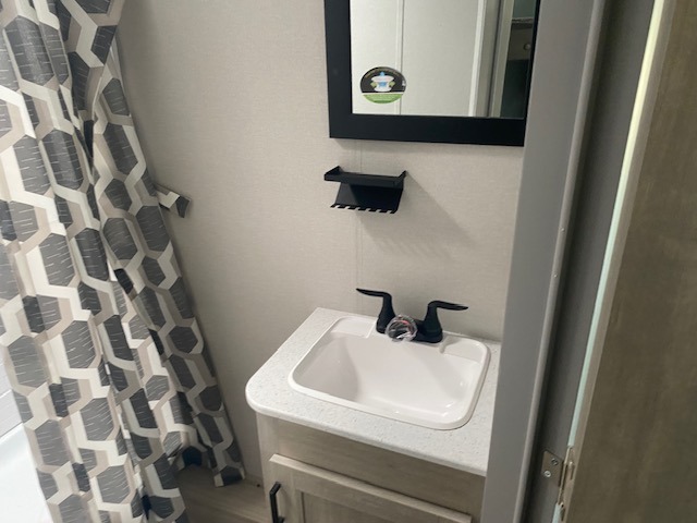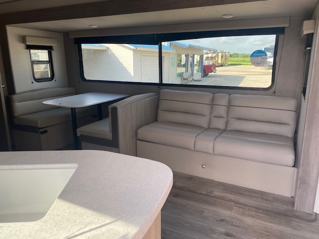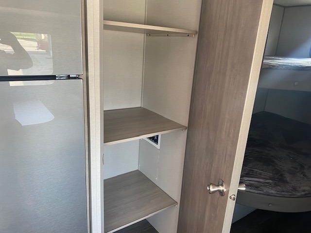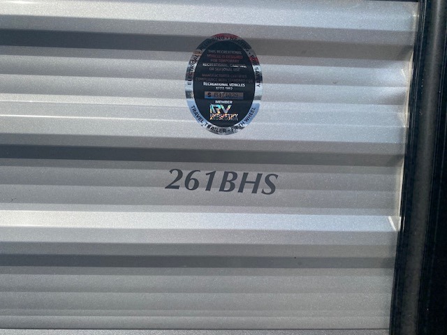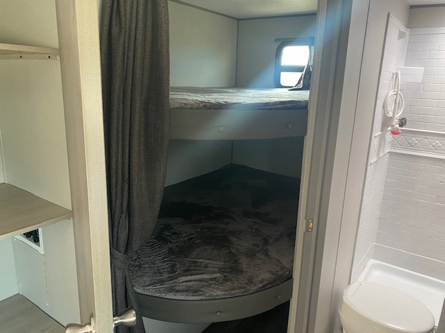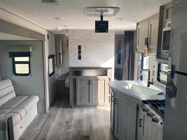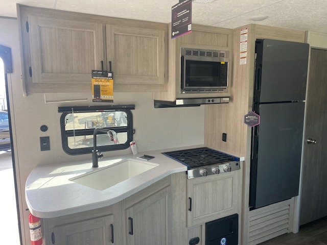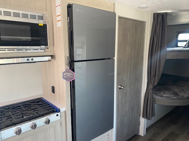 This is the perfect mid-size travel trailer for you and your family! The 46" x 74" double-size bunk beds with lower interior storage offer a comfortable sleeping space for the kids and you will have your own private sleeping space with the 60" x 74" queen bed in the front private bedroom. Freshen up each morning in the rear corner bathroom with the tub/shower and a mirror to get ready each morning. You can prepare your best home cooked meals with the GE stainless three burner cooktop and GE stainless 10.7 cu. ft. 12V refrigerator, then enjoy them together at the booth dinette. The sofa is near the entertainment center for a relaxing movie night. Don't leave any of your outdoor gear behind either thanks to the front pass-through storage area and the exterior outside storage area. You could even add the optional outside camper kitchen to grill the catch of the day on the pull out griddle!