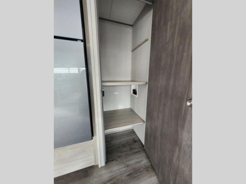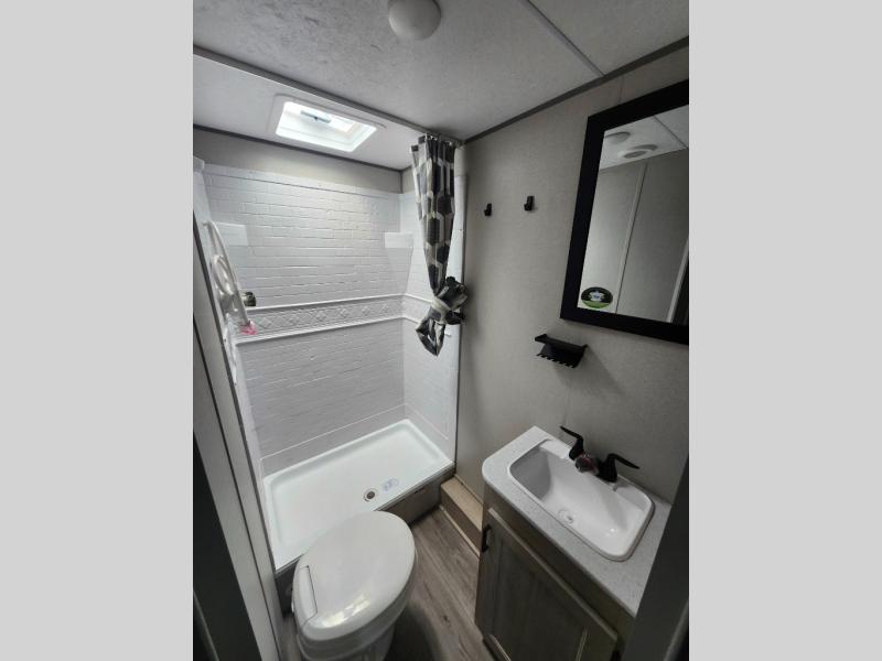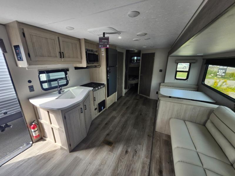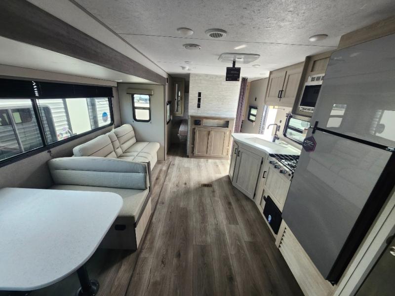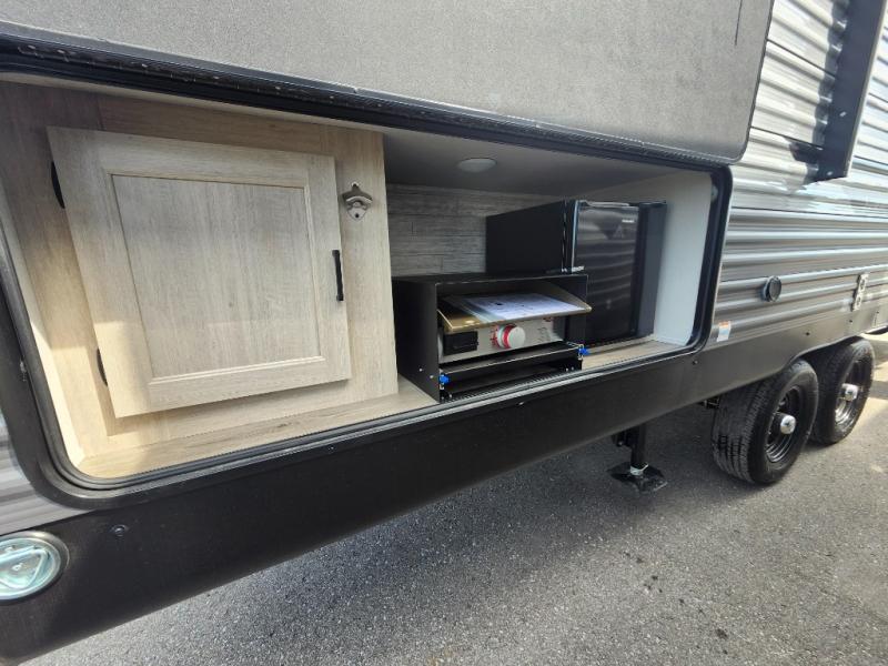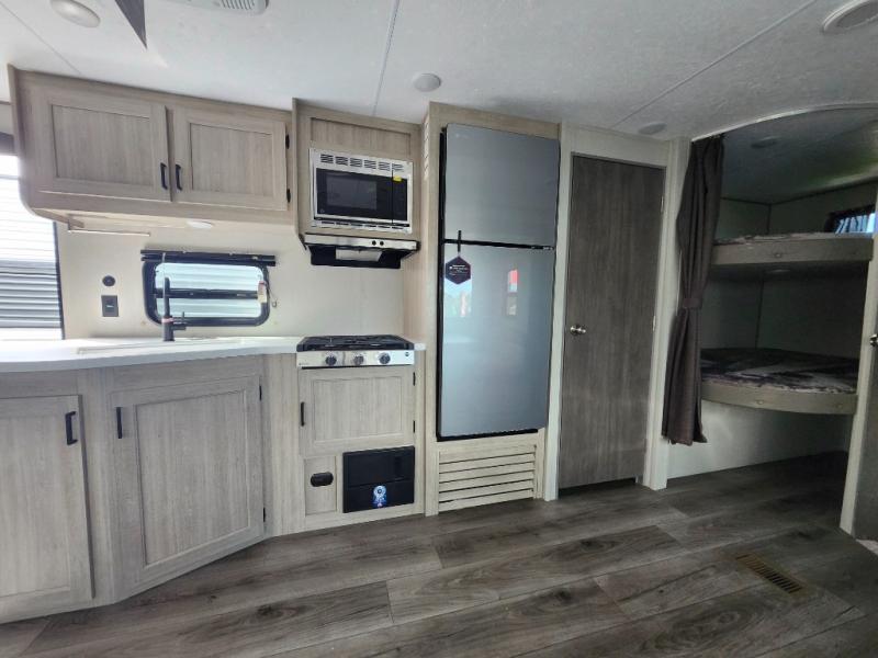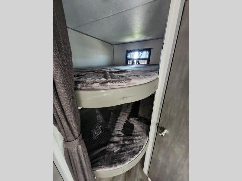 This is the perfect mid-size travel trailer for you and your family! The 46" x 74" double-size bunk beds with lower interior storage offer a comfortable sleeping space for the kids and you will have your own private sleeping space with the 60" x 74" queen bed in the front private bedroom. Freshen up each morning in the rear corner bathroom with the tub/shower and a mirror to get ready each morning. You can prepare your best home cooked meals with the GE stainless three burner cooktop and GE stainless 10.7 cu. ft. 12V refrigerator, then enjoy them together at the booth dinette. The sofa is near the entertainment center for a relaxing movie night. Don't leave any of your outdoor gear behind either, thanks to the front pass-through storage area and the exterior outside storage area. You could even add the optional outside camper kitchen to grill the catch of the day on the pull out griddle!