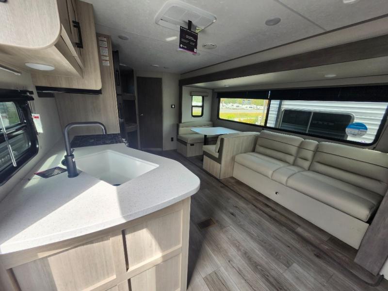 With any Catalina Summit Series 8 by Coachmen you will enjoy an affordable travel trailer packed with at-home comforts! The solid construction includes a Norco electromagnetic powder coated chassis, a seamless Alpha roof membrane, and full length frame outriggers for maximum support and durability. EZ lube axles with leaf spring suspension and self-adjusting brakes provide smooth towing from home to campground, and the premium exterior graphics package is sure to turn heads as you travel down the highway. You will love the features included, such as a JBL Aura Cube media center, magnetic baggage door latches, 4,000 lumen interior touch lighting, and the list goes on!