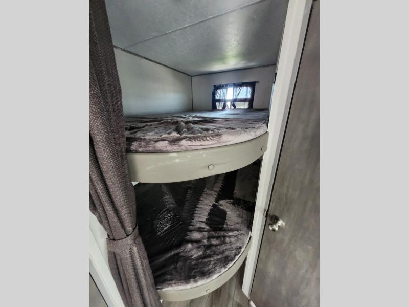 This is the perfect mid-size travel trailer for you and your family! The 46" x 74" double-size bunk beds with lower interior storage offer a comfortable sleeping space for the kids and you will have your own private sleeping space with the 60" x 74" queen bed in the front private bedroom. Freshen up each morning in the rear corner bathroom with the tub/shower and a mirror to get ready each morning. You can prepare your best home cooked meals with the GE stainless three burner cooktop and GE stainless 10.7 cu. ft. 12V refrigerator, then enjoy them together at the booth dinette. The sofa is near the entertainment center for a relaxing movie night. Don't leave any of your outdoor gear behind either thanks to the front pass-through storage area and the exterior outside storage area. You could even add the optional outside camper kitchen to grill the catch of the day on the pull out griddle!