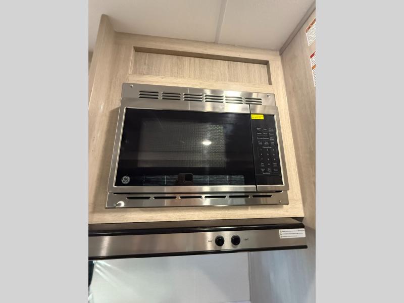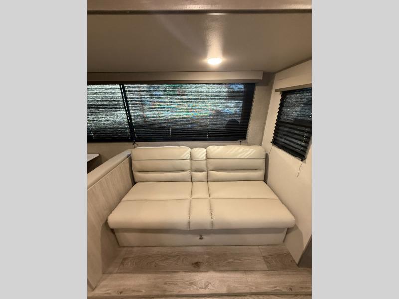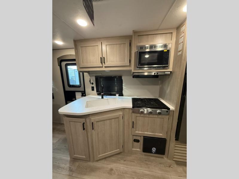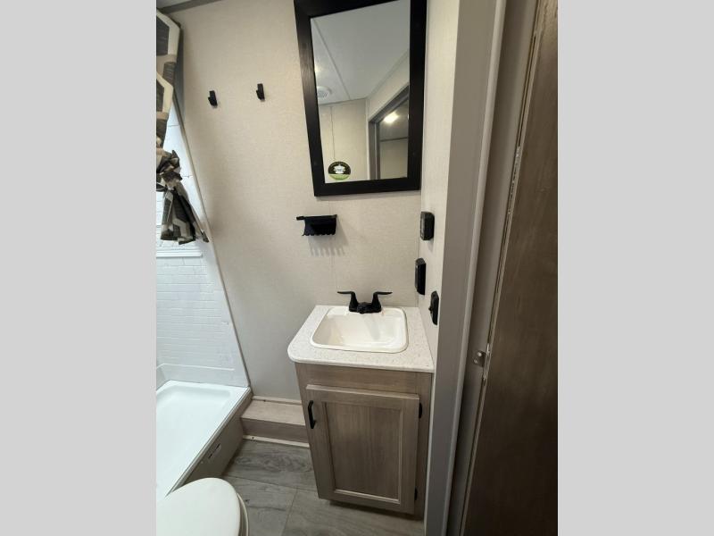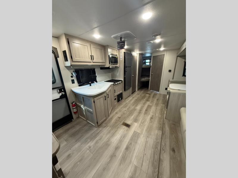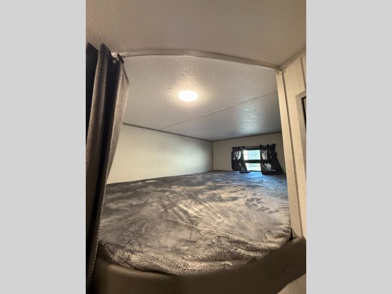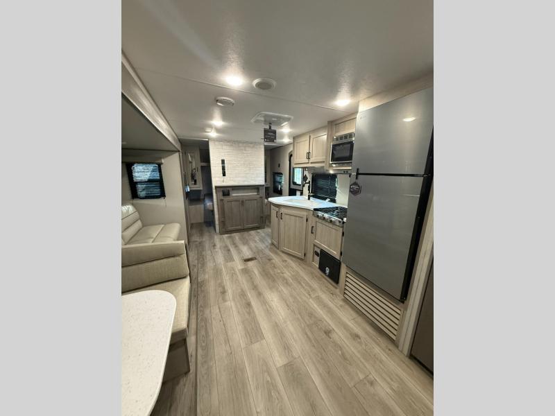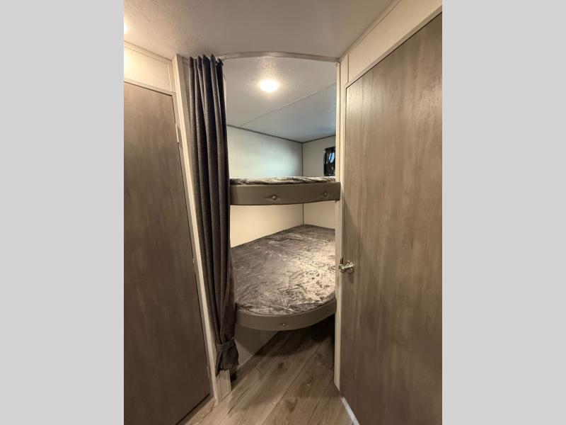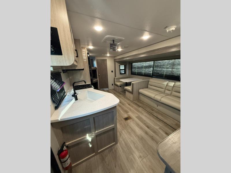 This is the perfect mid-size travel trailer for you and your family! The 46" x 74" double-size bunk beds with lower interior storage offer a comfortable sleeping space for the kids and you will have your own private sleeping space with the 60" x 74" queen bed in the front private bedroom. Freshen up each morning in the rear corner bathroom with the tub/shower and a mirror to get ready each morning. You can prepare your best home cooked meals with the GE stainless three burner cooktop and GE stainless 10.7 cu. ft. 12V refrigerator, then enjoy them together at the booth dinette. The sofa is near the entertainment center for a relaxing movie night. Don't leave any of your outdoor gear behind either thanks to the front pass-through storage area and the exterior outside storage area. You could even add the optional outside camper kitchen to grill the catch of the day on the pull out griddle!
