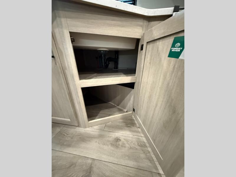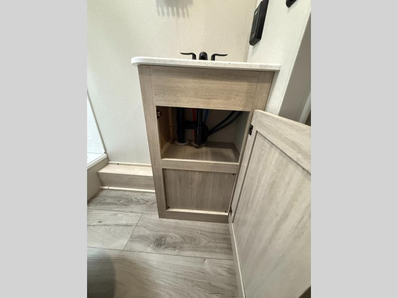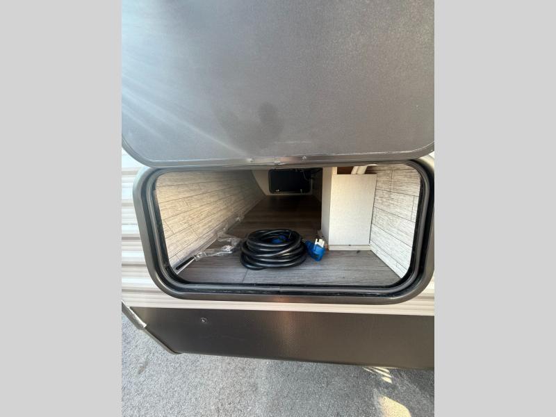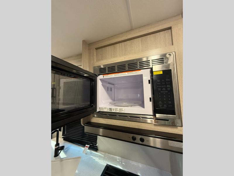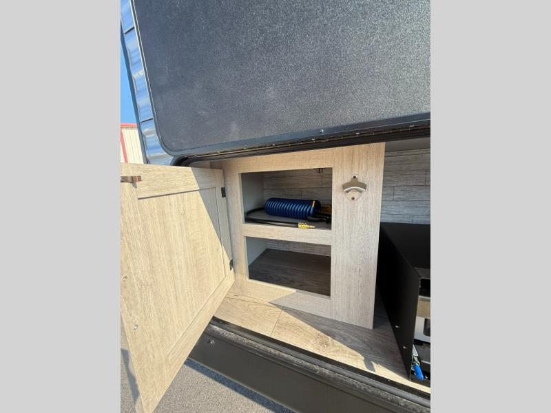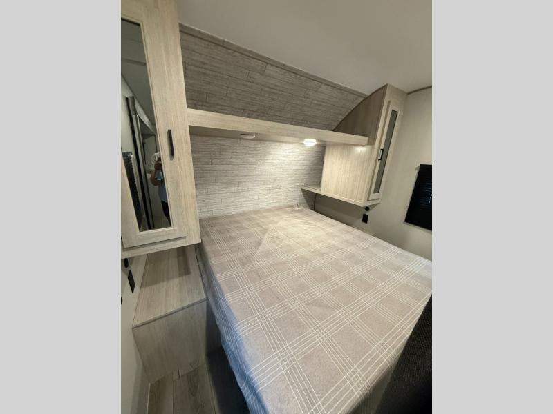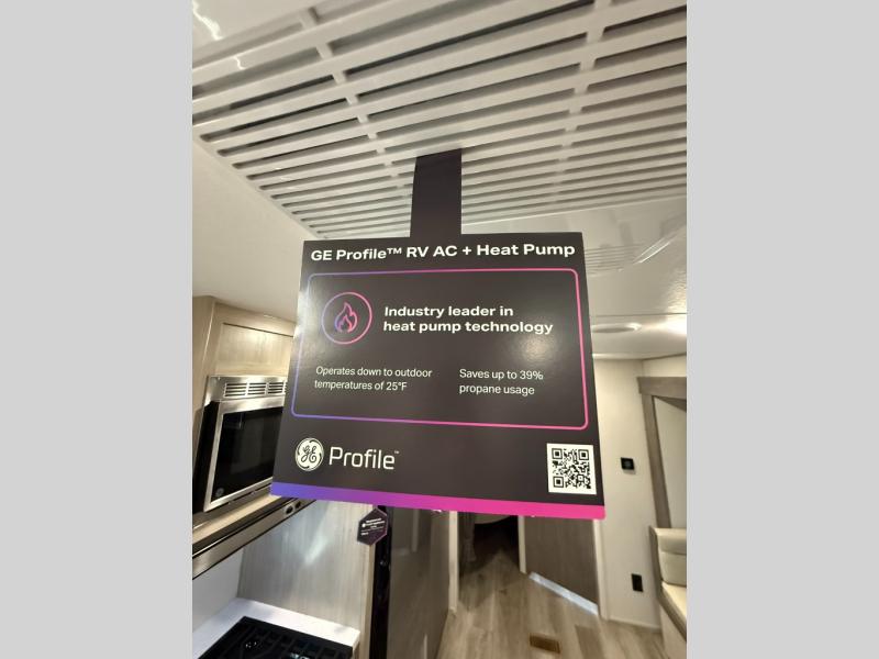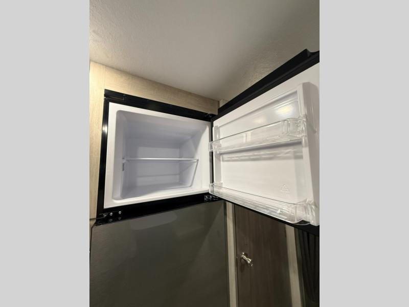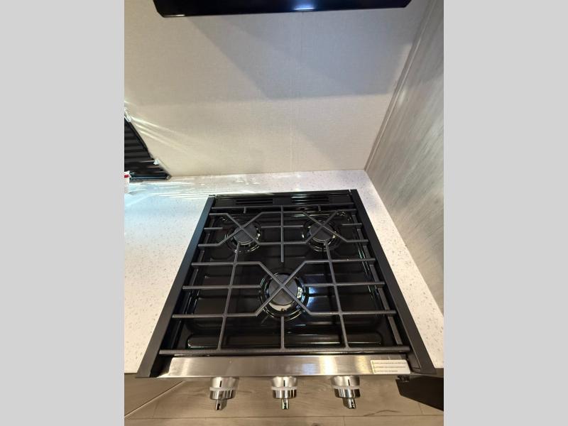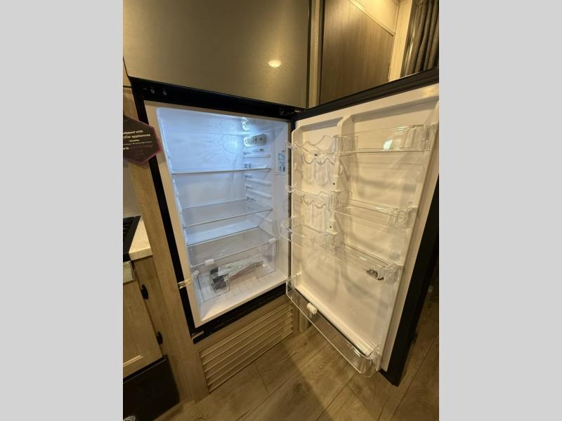 This is the perfect mid-size travel trailer for you and your family! The 46" x 74" double-size bunk beds with lower interior storage offer a comfortable sleeping space for the kids and you will have your own private sleeping space with the 60" x 74" queen bed in the front private bedroom. Freshen up each morning in the rear corner bathroom with the tub/shower and a mirror to get ready each morning. You can prepare your best home cooked meals with the GE stainless three burner cooktop and GE stainless 10.7 cu. ft. 12V refrigerator, then enjoy them together at the booth dinette. The sofa is near the entertainment center for a relaxing movie night. Don't leave any of your outdoor gear behind either thanks to the front pass-through storage area and the exterior outside storage area. You could even add the optional outside camper kitchen to grill the catch of the day on the pull out griddle!