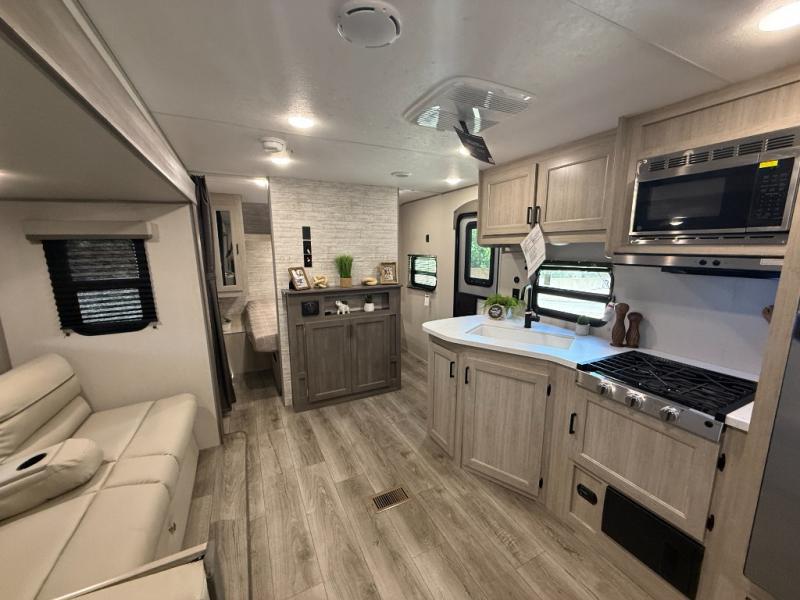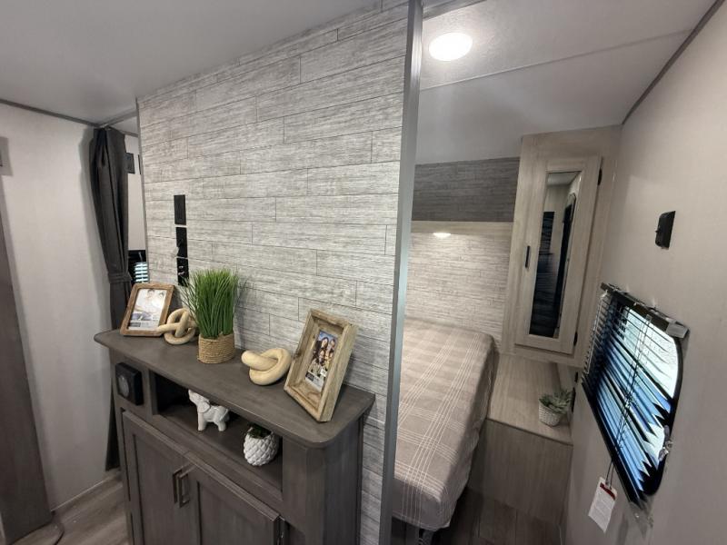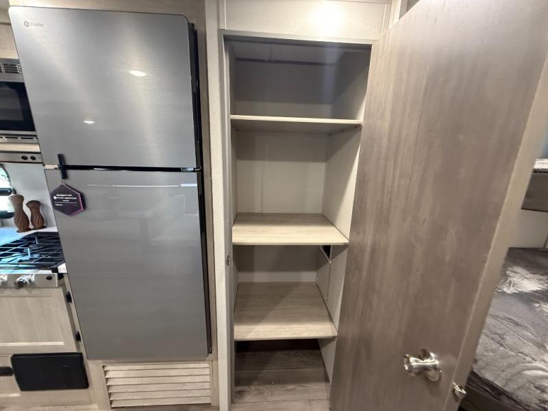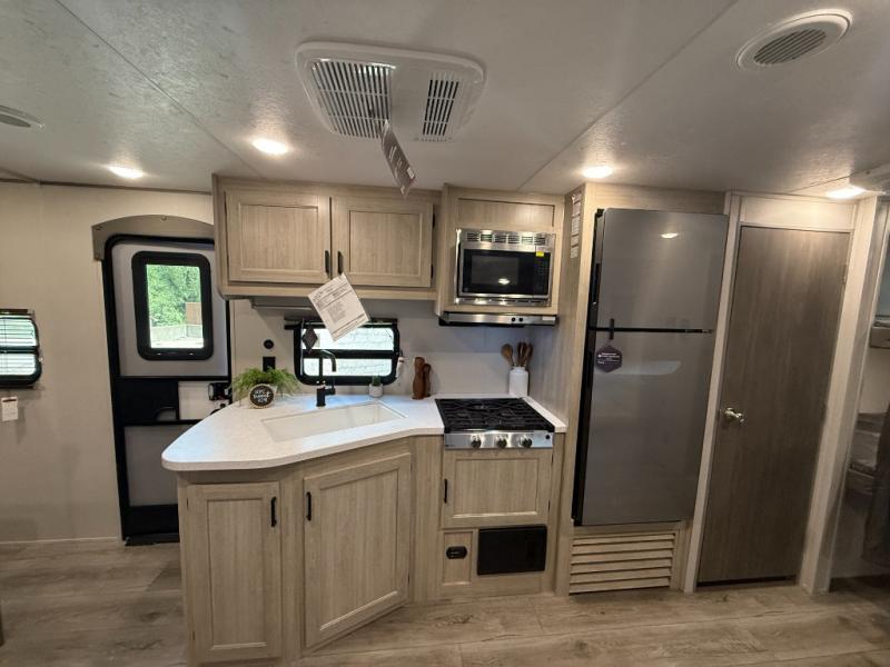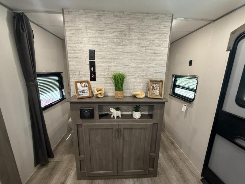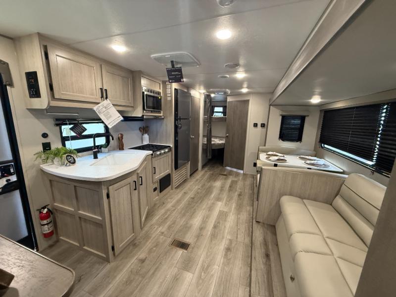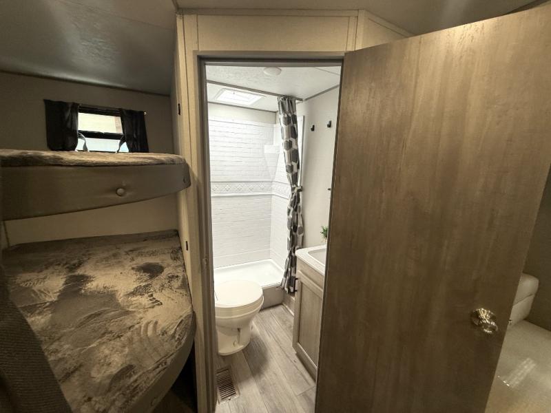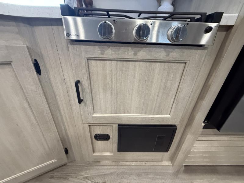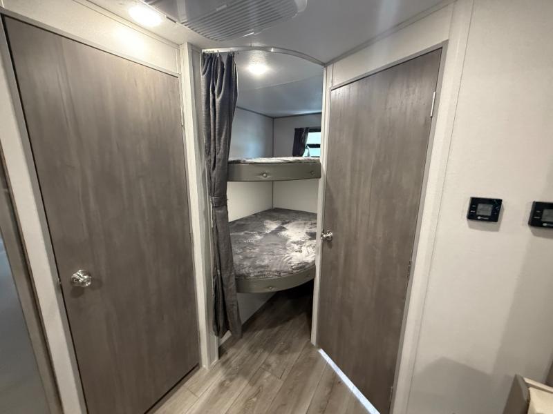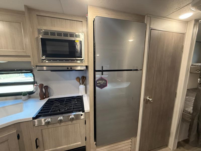 This is the perfect mid-size travel trailer for you and your family! The 46" x 74" double-size bunk beds with lower interior storage offer a comfortable sleeping space for the kids and you will have your own private sleeping space with the 60" x 74" queen bed in the front private bedroom. Freshen up each morning in the rear corner bathroom with the tub/shower and a mirror to get ready each morning. You can prepare your best home cooked meals with the GE stainless three burner cooktop and GE stainless 10.7 cu. ft. 12V refrigerator, then enjoy them together at the booth dinette. The sofa is near the entertainment center for a relaxing movie night. Don't leave any of your outdoor gear behind either thanks to the front pass-through storage area and the exterior outside storage area. You could even add the optional outside camper kitchen to grill the catch of the day on the pull out griddle!