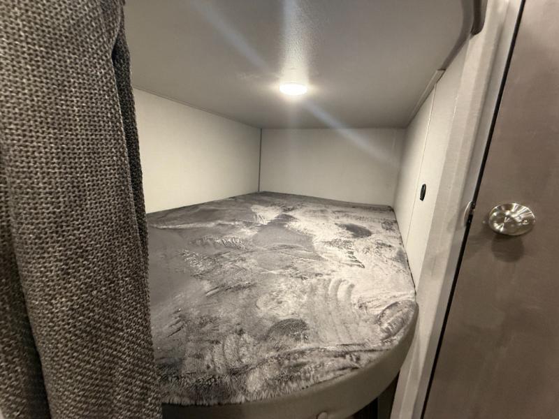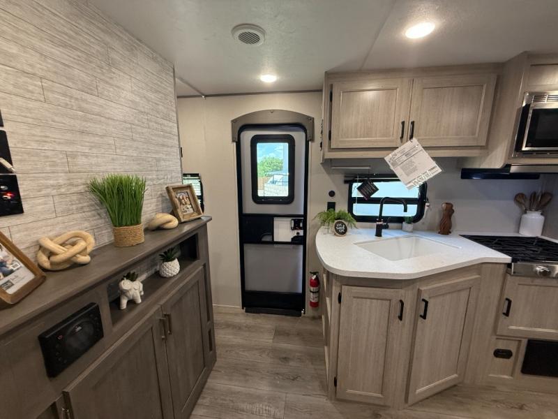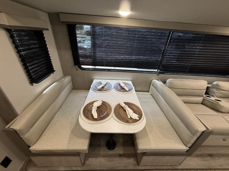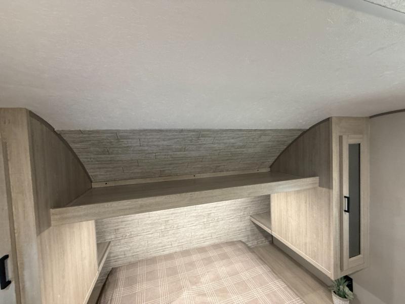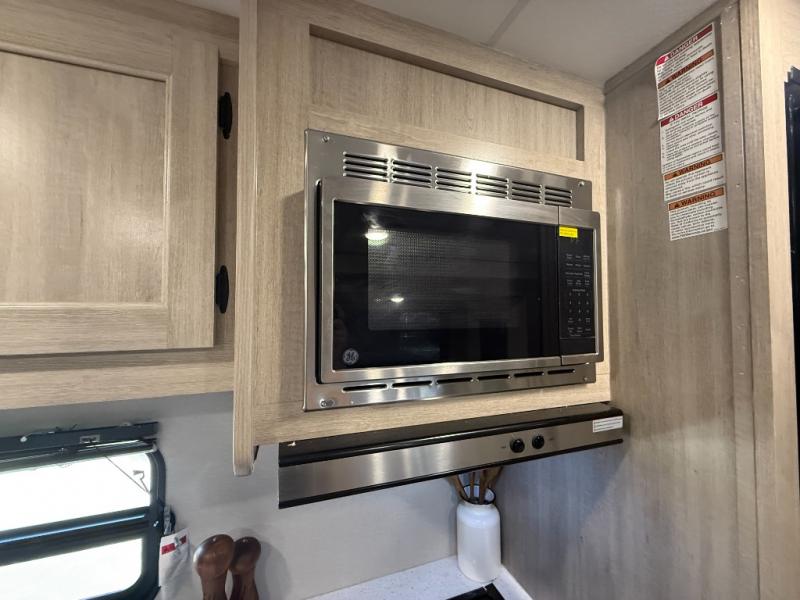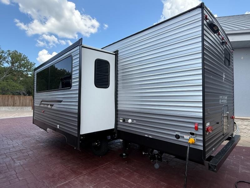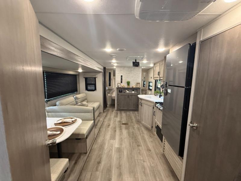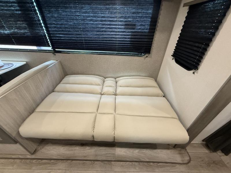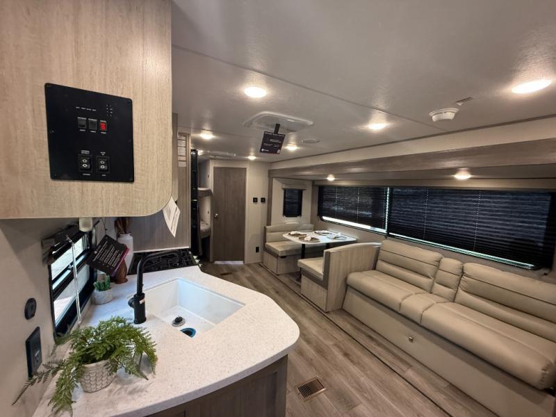 This is the perfect mid-size travel trailer for you and your family! The 46" x 74" double-size bunk beds with lower interior storage offer a comfortable sleeping space for the kids and you will have your own private sleeping space with the 60" x 74" queen bed in the front private bedroom. Freshen up each morning in the rear corner bathroom with the tub/shower and a mirror to get ready each morning. You can prepare your best home cooked meals with the GE stainless three burner cooktop and GE stainless 10.7 cu. ft. 12V refrigerator, then enjoy them together at the booth dinette. The sofa is near the entertainment center for a relaxing movie night. Don't leave any of your outdoor gear behind either thanks to the front pass-through storage area and the exterior outside storage area. You could even add the optional outside camper kitchen to grill the catch of the day on the pull out griddle!