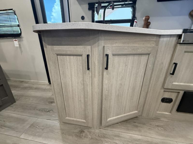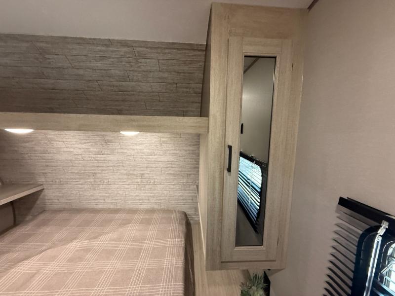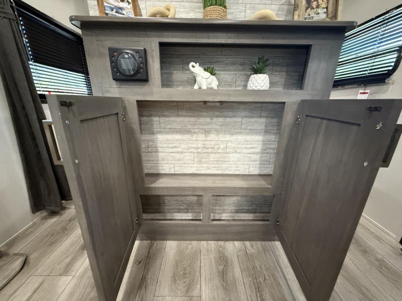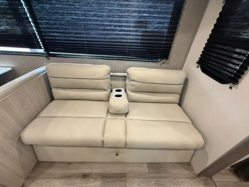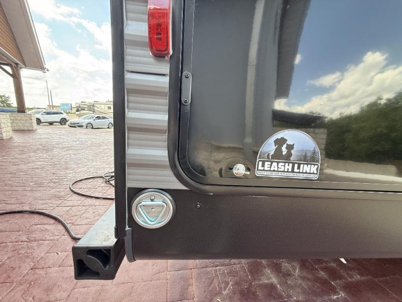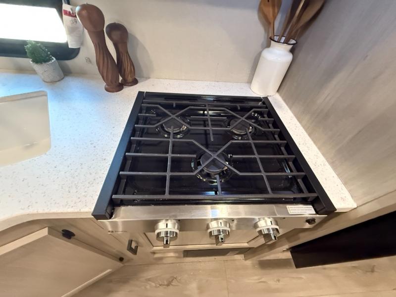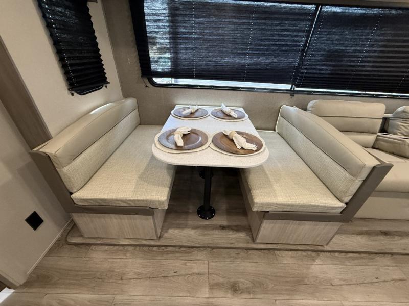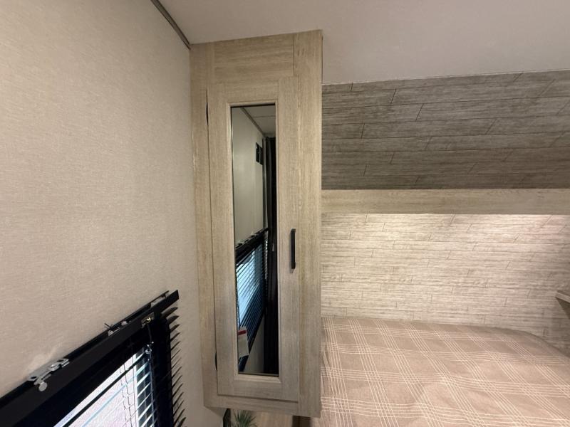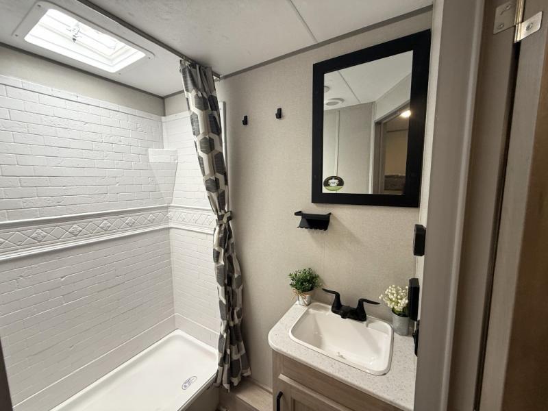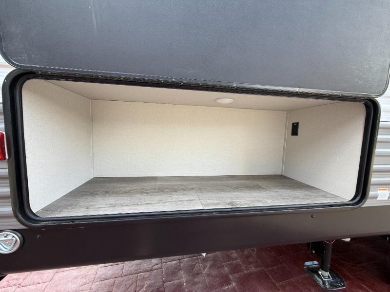 This is the perfect mid-size travel trailer for you and your family! The 46" x 74" double-size bunk beds with lower interior storage offer a comfortable sleeping space for the kids and you will have your own private sleeping space with the 60" x 74" queen bed in the front private bedroom. Freshen up each morning in the rear corner bathroom with the tub/shower and a mirror to get ready each morning. You can prepare your best home cooked meals with the GE stainless three burner cooktop and GE stainless 10.7 cu. ft. 12V refrigerator, then enjoy them together at the booth dinette. The sofa is near the entertainment center for a relaxing movie night. Don't leave any of your outdoor gear behind either thanks to the front pass-through storage area and the exterior outside storage area. You could even add the optional outside camper kitchen to grill the catch of the day on the pull out griddle!