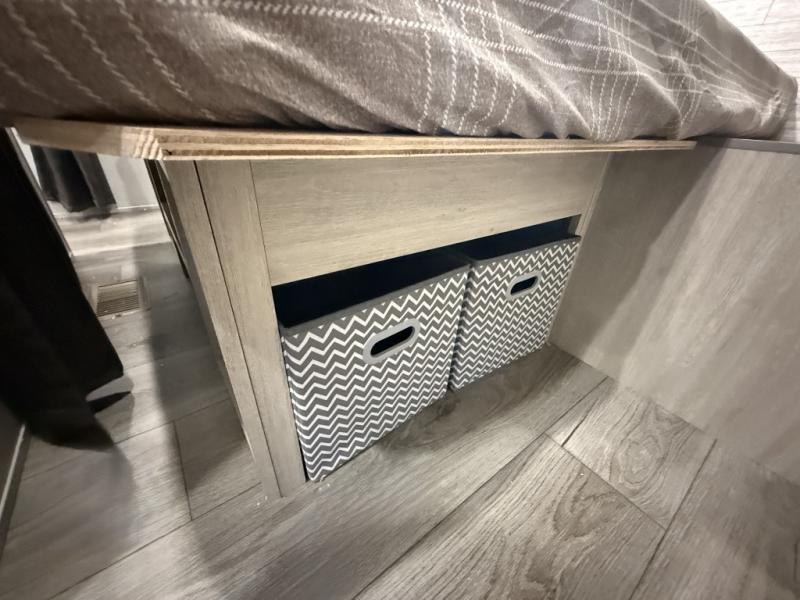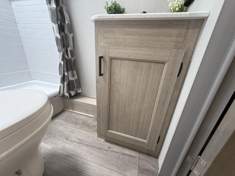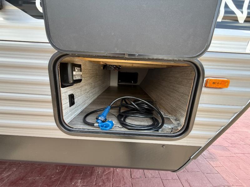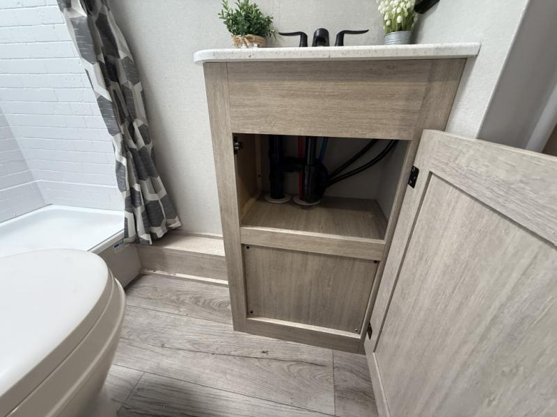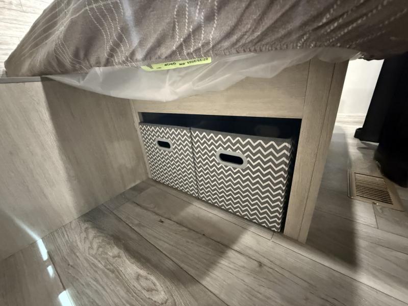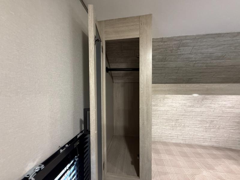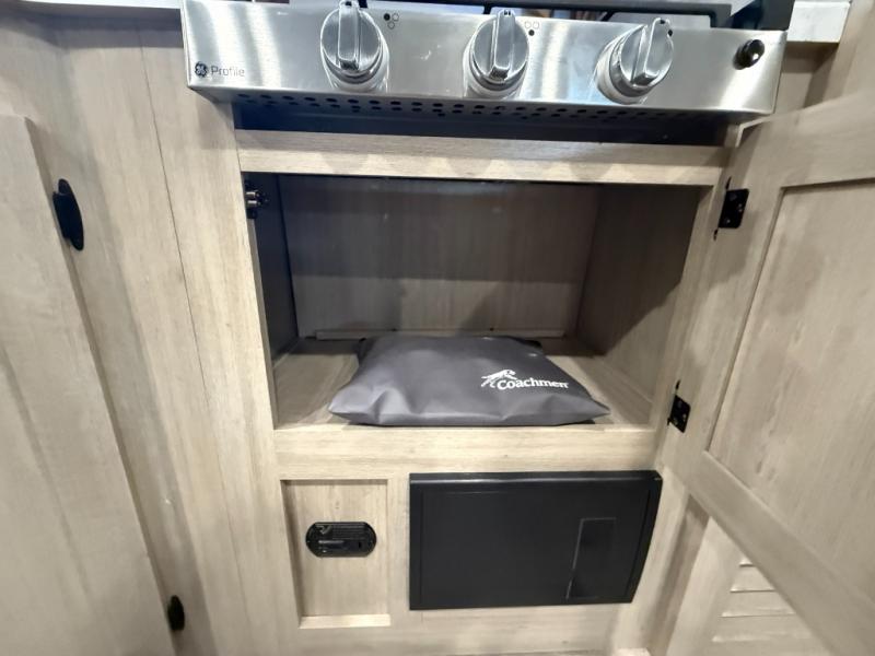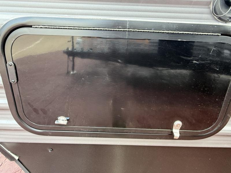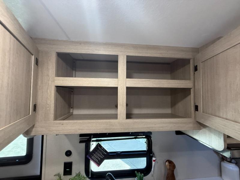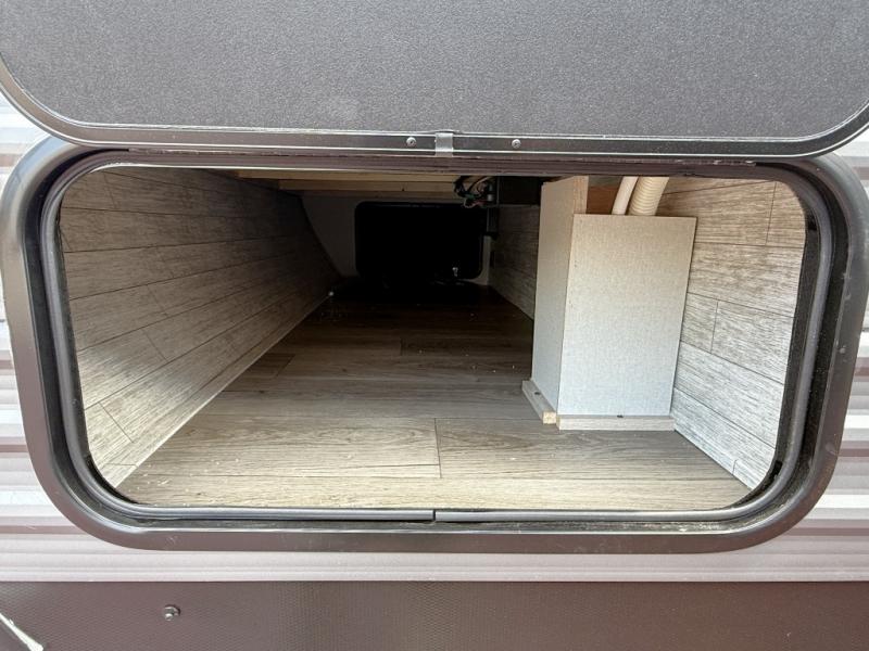 This is the perfect mid-size travel trailer for you and your family! The 46" x 74" double-size bunk beds with lower interior storage offer a comfortable sleeping space for the kids and you will have your own private sleeping space with the 60" x 74" queen bed in the front private bedroom. Freshen up each morning in the rear corner bathroom with the tub/shower and a mirror to get ready each morning. You can prepare your best home cooked meals with the GE stainless three burner cooktop and GE stainless 10.7 cu. ft. 12V refrigerator, then enjoy them together at the booth dinette. The sofa is near the entertainment center for a relaxing movie night. Don't leave any of your outdoor gear behind either thanks to the front pass-through storage area and the exterior outside storage area. You could even add the optional outside camper kitchen to grill the catch of the day on the pull out griddle!