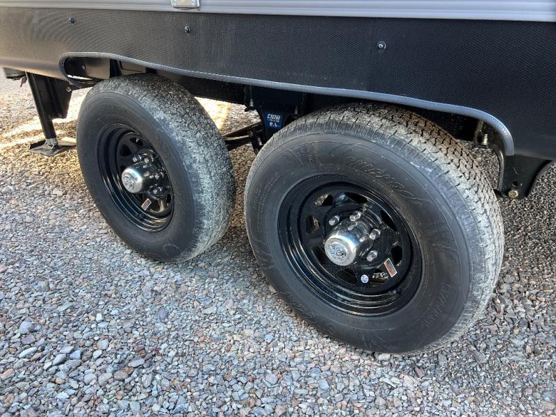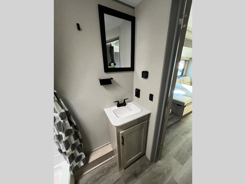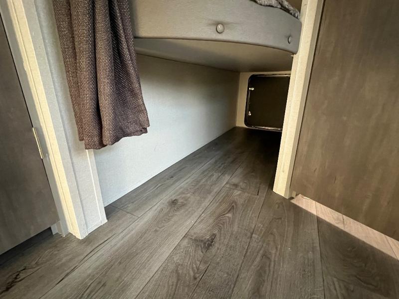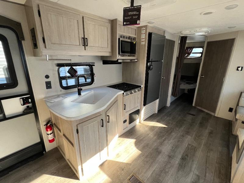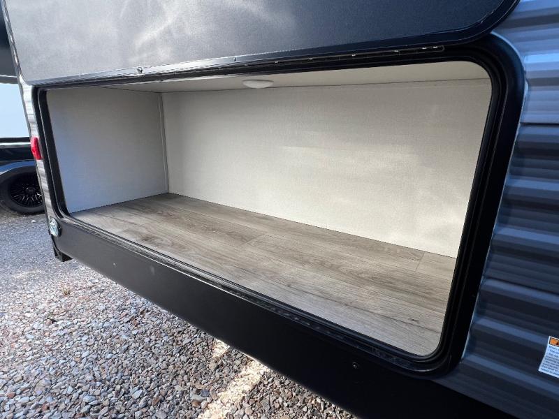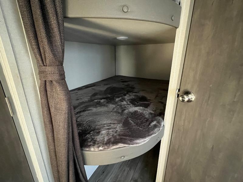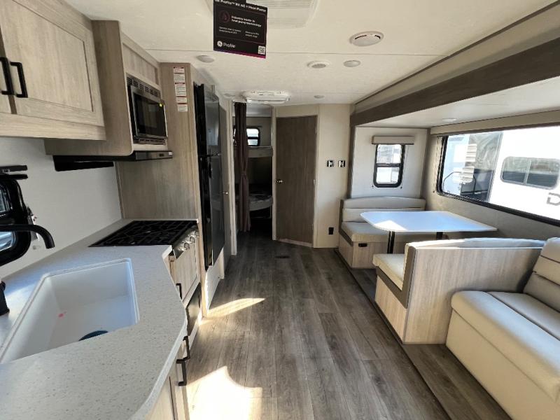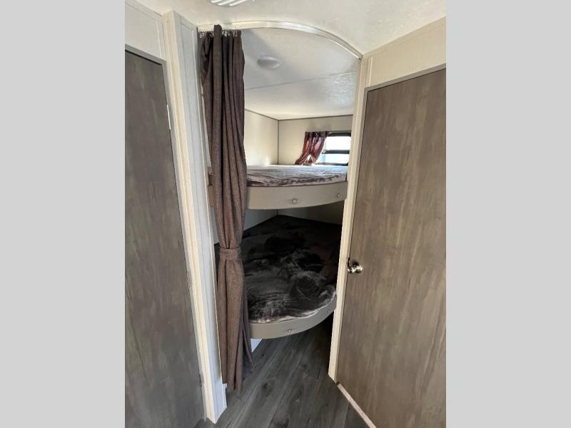 This is the perfect mid-size travel trailer for you and your family! The 46" x 74" double-size bunk beds with lower interior storage offer a comfortable sleeping space for the kids and you will have your own private sleeping space with the 60" x 74" queen bed in the front private bedroom. Freshen up each morning in the rear corner bathroom with the tub/shower and a mirror to get ready each morning. You can prepare your best home cooked meals with the GE stainless three burner cooktop and GE stainless 10.7 cu. ft. 12V refrigerator, then enjoy them together at the booth dinette. The sofa is near the entertainment center for a relaxing movie night. Don't leave any of your outdoor gear behind either, thanks to the front pass-through storage area and the exterior outside storage area. You could even add the optional outside camper kitchen to grill the catch of the day on the pull out griddle!