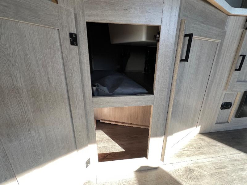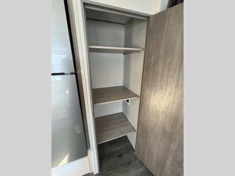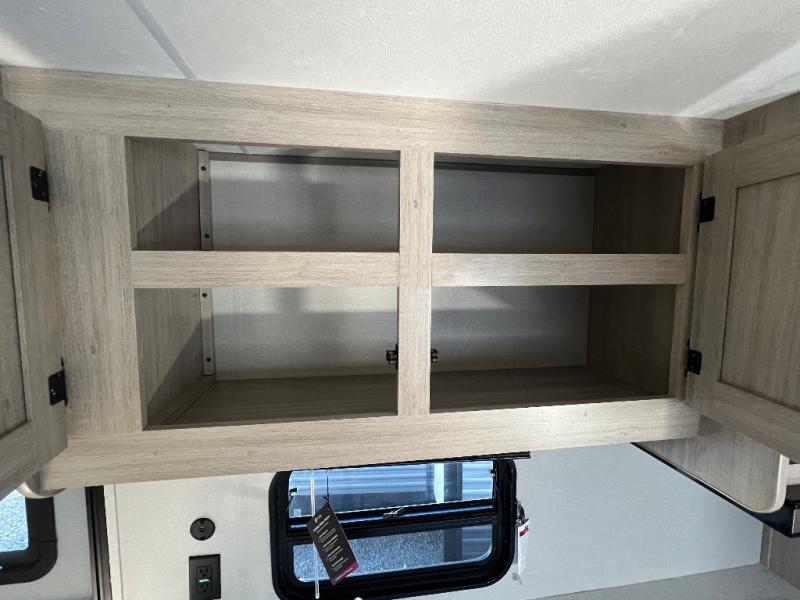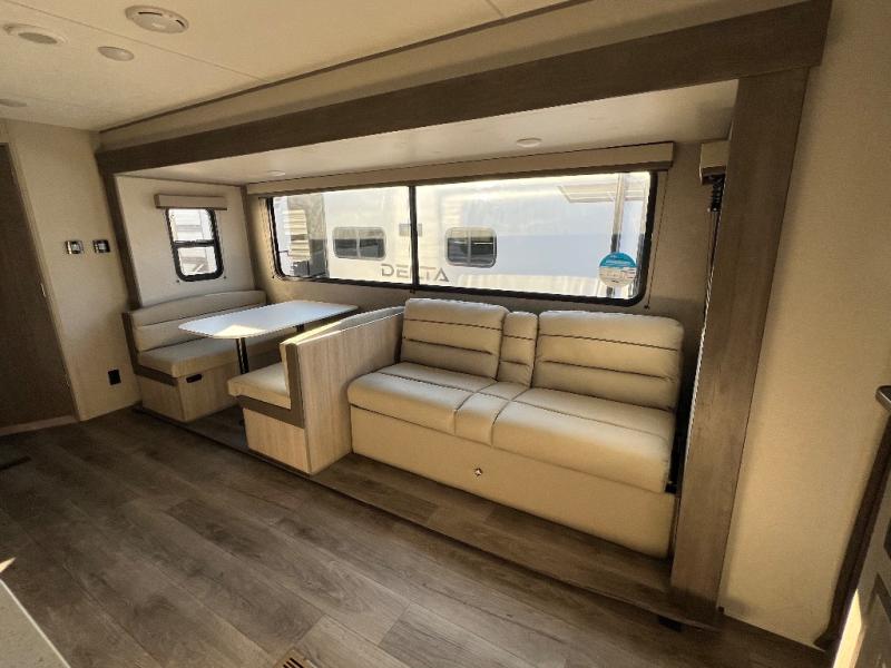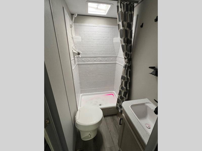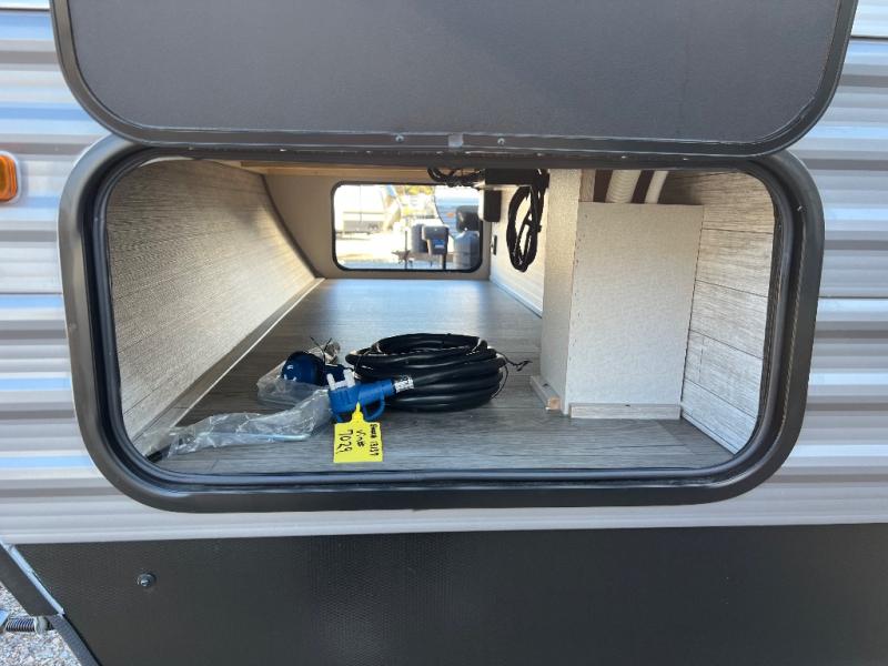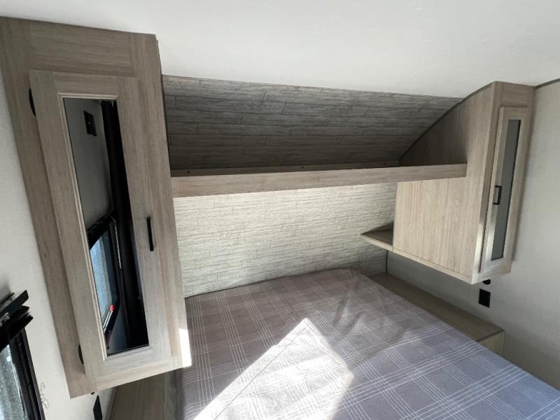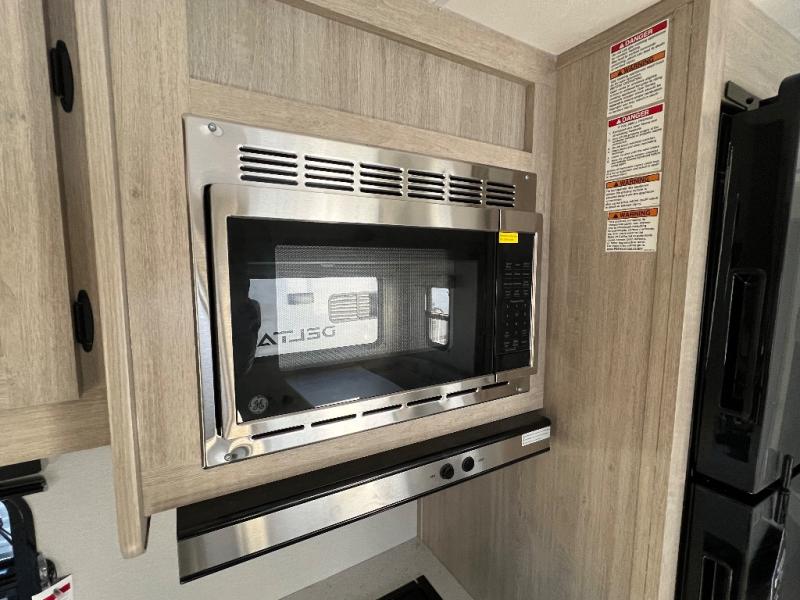 This is the perfect mid-size travel trailer for you and your family! The 46" x 74" double-size bunk beds with lower interior storage offer a comfortable sleeping space for the kids and you will have your own private sleeping space with the 60" x 74" queen bed in the front private bedroom. Freshen up each morning in the rear corner bathroom with the tub/shower and a mirror to get ready each morning. You can prepare your best home cooked meals with the GE stainless three burner cooktop and GE stainless 10.7 cu. ft. 12V refrigerator, then enjoy them together at the booth dinette. The sofa is near the entertainment center for a relaxing movie night. Don't leave any of your outdoor gear behind either, thanks to the front pass-through storage area and the exterior outside storage area. You could even add the optional outside camper kitchen to grill the catch of the day on the pull out griddle!