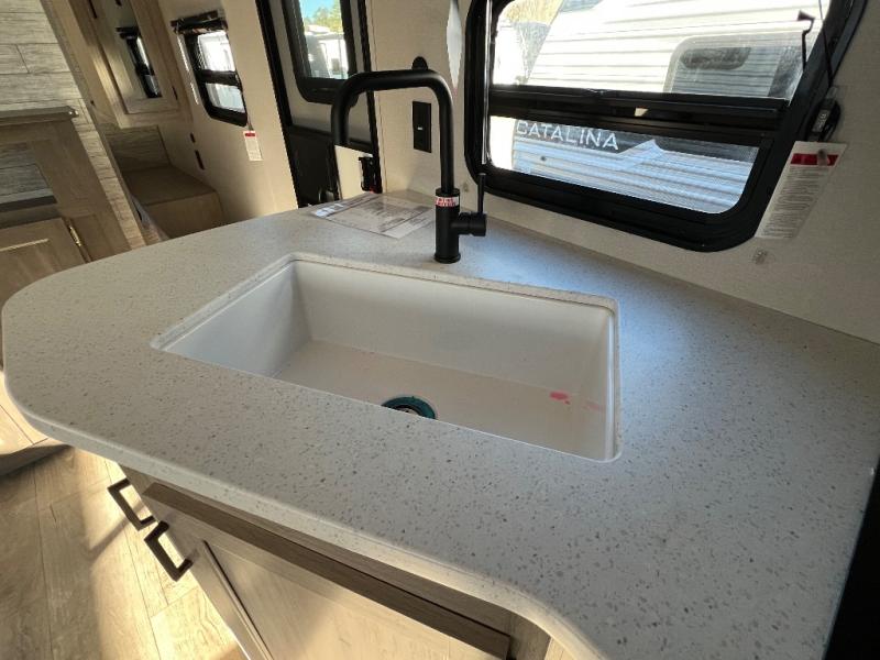 With any Catalina Summit Series 8 by Coachmen you will enjoy an affordable travel trailer packed with at-home comforts! The solid construction includes a Norco electromagnetic powder coated chassis, a seamless Alpha roof membrane, and full length frame outriggers for maximum support and durability. EZ lube axles with leaf spring suspension and self-adjusting brakes provide smooth towing from home to campground, and the premium exterior graphics package is sure to turn heads as you travel down the highway. You will love the features included, such as a JBL Aura Cube media center, magnetic baggage door latches, 4,000 lumen interior touch lighting, and the list goes on!