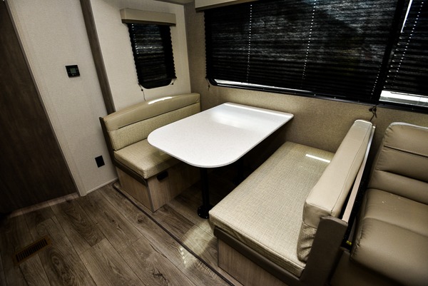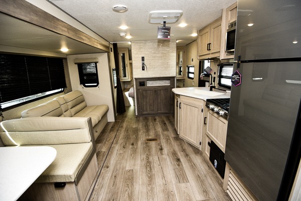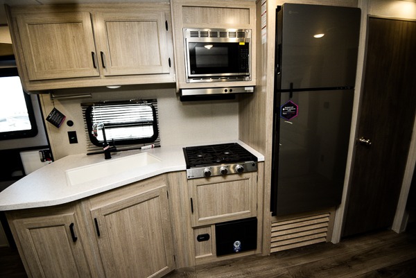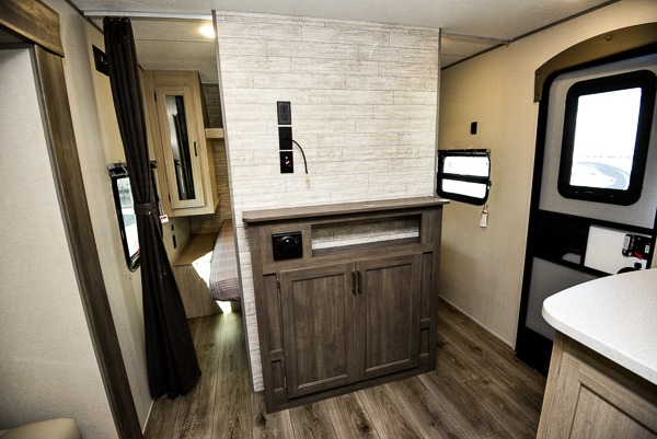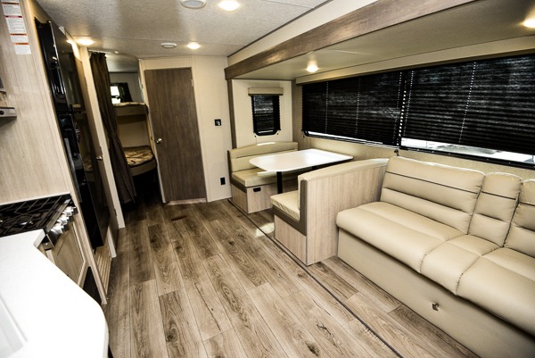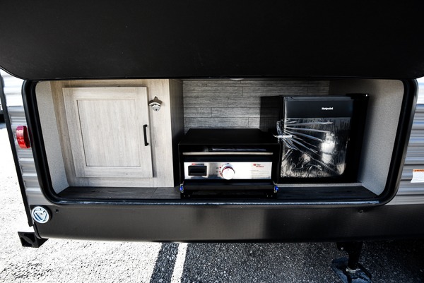 This is the perfect mid-size travel trailer for you and your family! The 46" x 74" double-size bunk beds with lower interior storage offer a comfortable sleeping space for the kids and you will have your own private sleeping space with the 60" x 74" queen bed in the front private bedroom. Freshen up each morning in the rear corner bathroom with the tub/shower and a mirror to get ready each morning. You can prepare your best home cooked meals with the GE stainless three burner cooktop and GE stainless 10.7 cu. ft. 12V refrigerator, then enjoy them together at the booth dinette. The sofa is near the entertainment center for a relaxing movie night. Don't leave any of your outdoor gear behind either, thanks to the front pass-through storage area and the exterior outside storage area. You could even add the optional outside camper kitchen to grill the catch of the day on the pull out griddle!