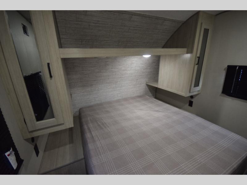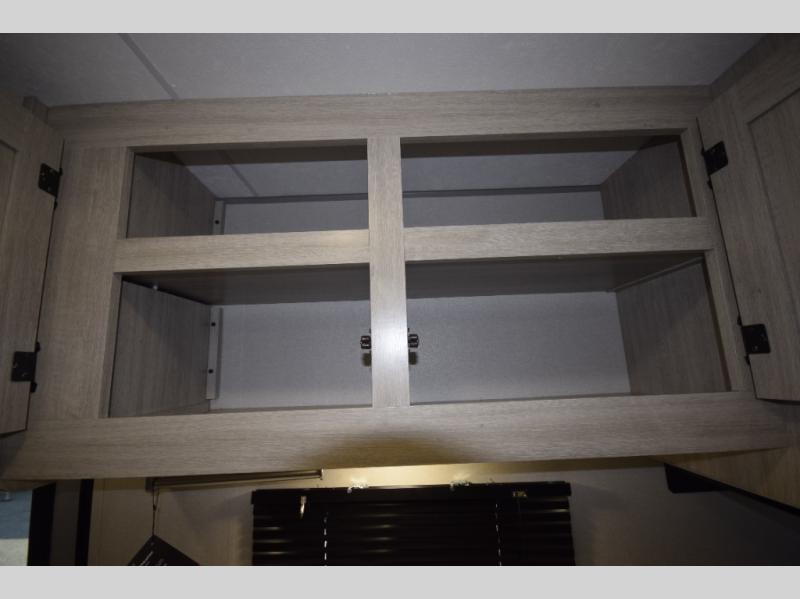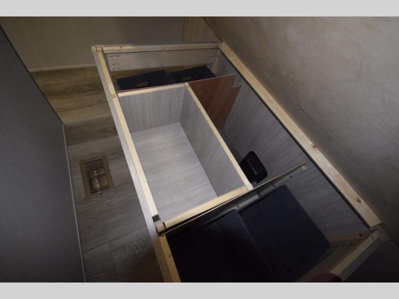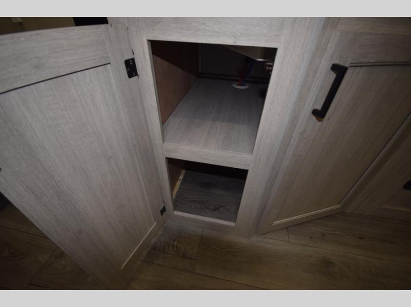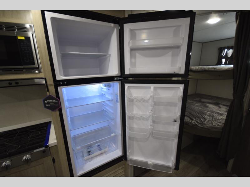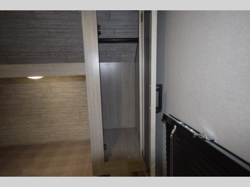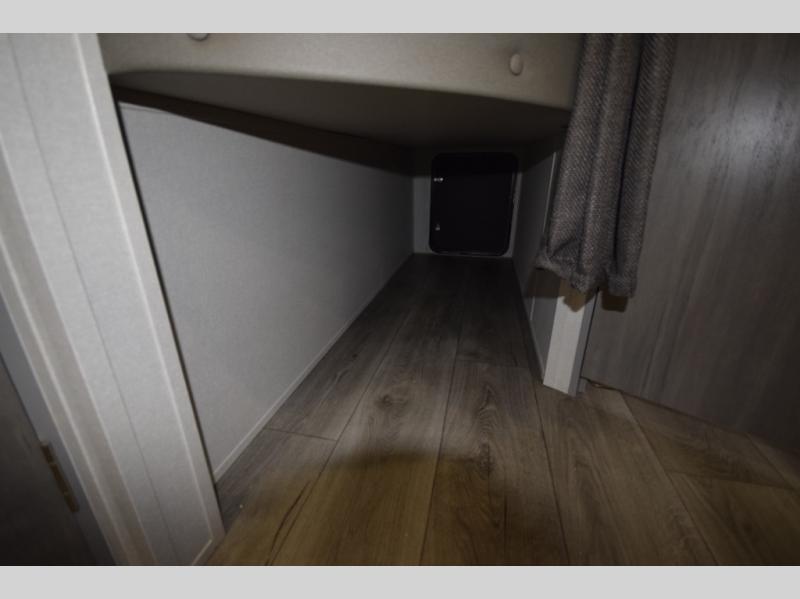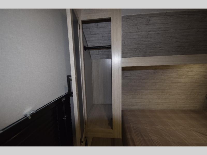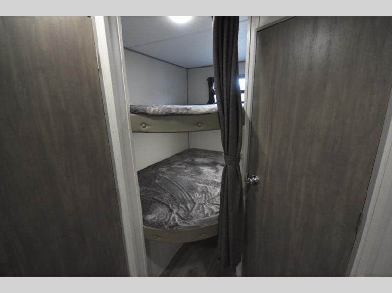 Kids will love their own space in the 46" x 74" double-size bunk beds, complete with interior storage underneath for all their gear and toys. Meanwhile, parents can retreat to the private front bedroom, featuring a cozy 60" x 74" queen bed and space to unwind after a long day outdoors.