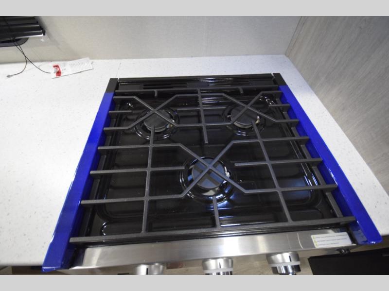 Cooking is easy and fun thanks to the fully equipped kitchen, which includes a GE stainless three-burner cooktop and a 10.7 cu. ft. 12V refrigerator to keep your food fresh and your drinks cold. Want to cook outside? Add the optional camper kitchen with a pull-out griddle—perfect for pancakes at sunrise or grilling your fresh catch of the day.