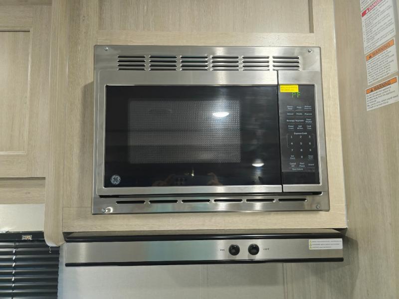 This is the perfect mid-size travel trailer for you and your family! The 46" x 74" double-size bunk beds with lower interior storage offer a comfortable sleeping space for the kids and you will have your own private sleeping space with the 60" x 74" queen bed in the front private bedroom. Freshen up each morning in the rear corner bathroom with the tub/shower and a mirror to get ready each morning. You can prepare your best home cooked meals with the GE stainless three burner cooktop and GE stainless 10.7 cu. ft. 12V refrigerator, then enjoy them together at the booth dinette. The sofa is near the entertainment center for a relaxing movie night. Don't leave any of your outdoor gear behind either thanks to the front pass-through storage area and the exterior outside storage area. You could even add the optional outside camper kitchen to grill the catch of the day on the pull out griddle!