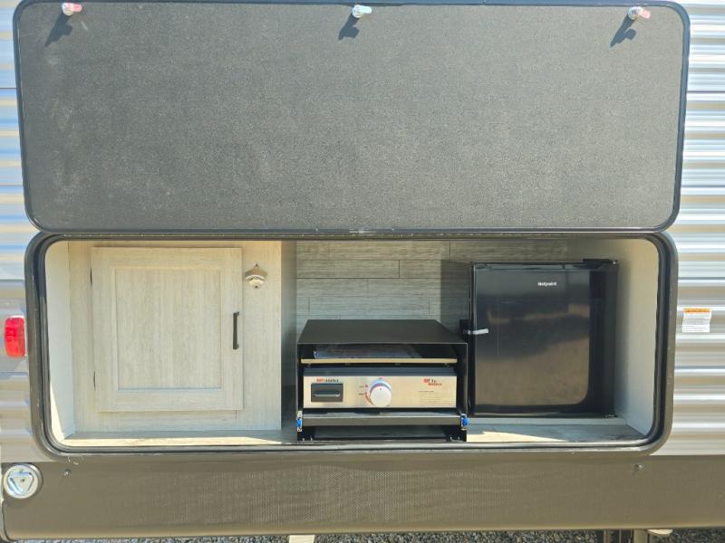 This is the perfect mid-size travel trailer for you and your family! The 46" x 74" double-size bunk beds with lower interior storage offer a comfortable sleeping space for the kids and you will have your own private sleeping space with the 60" x 74" queen bed in the front private bedroom. Freshen up each morning in the rear corner bathroom with the tub/shower and a mirror to get ready each morning. You can prepare your best home cooked meals with the GE stainless three burner cooktop and GE stainless 10.7 cu. ft. 12V refrigerator, then enjoy them together at the booth dinette. The sofa is near the entertainment center for a relaxing movie night. Don't leave any of your outdoor gear behind either thanks to the front pass-through storage area and the exterior outside storage area. You could even add the optional outside camper kitchen to grill the catch of the day on the pull out griddle!
