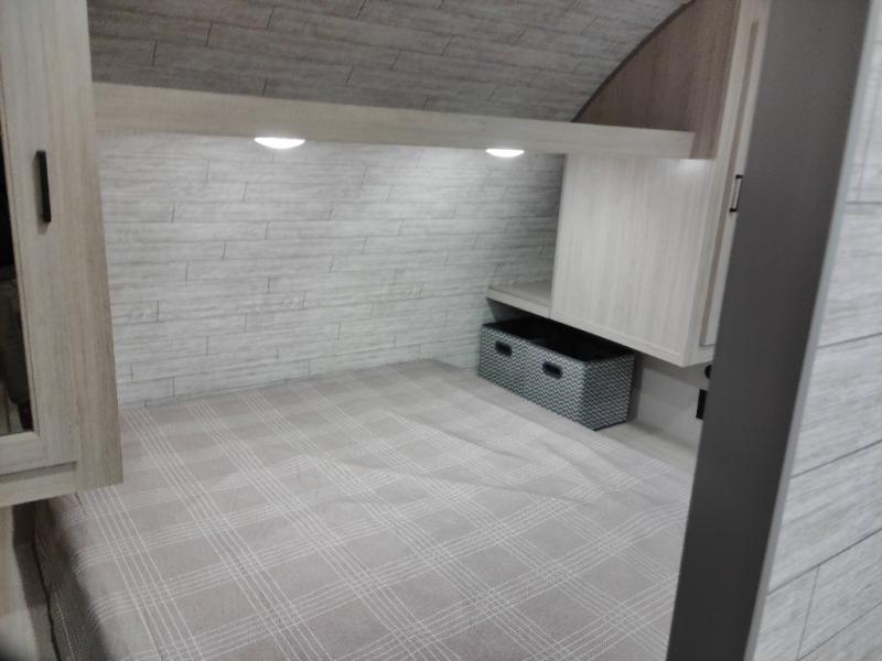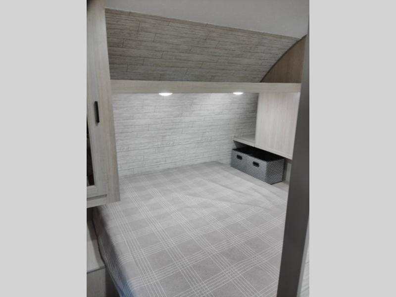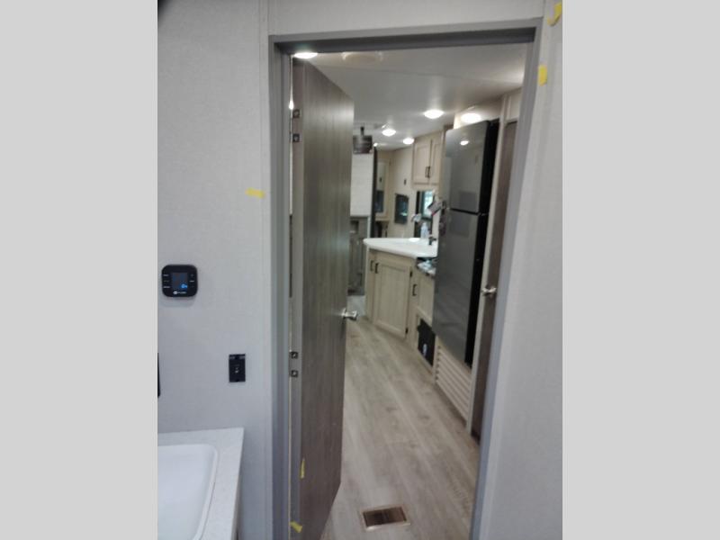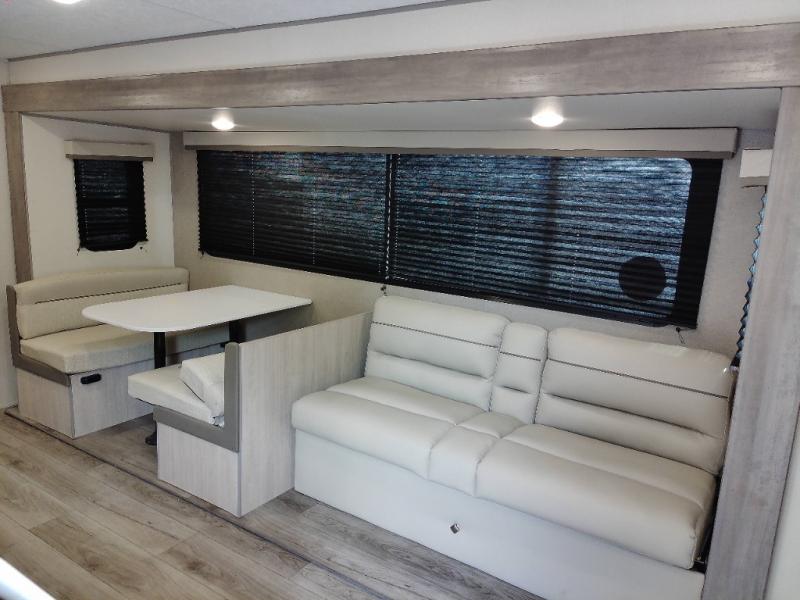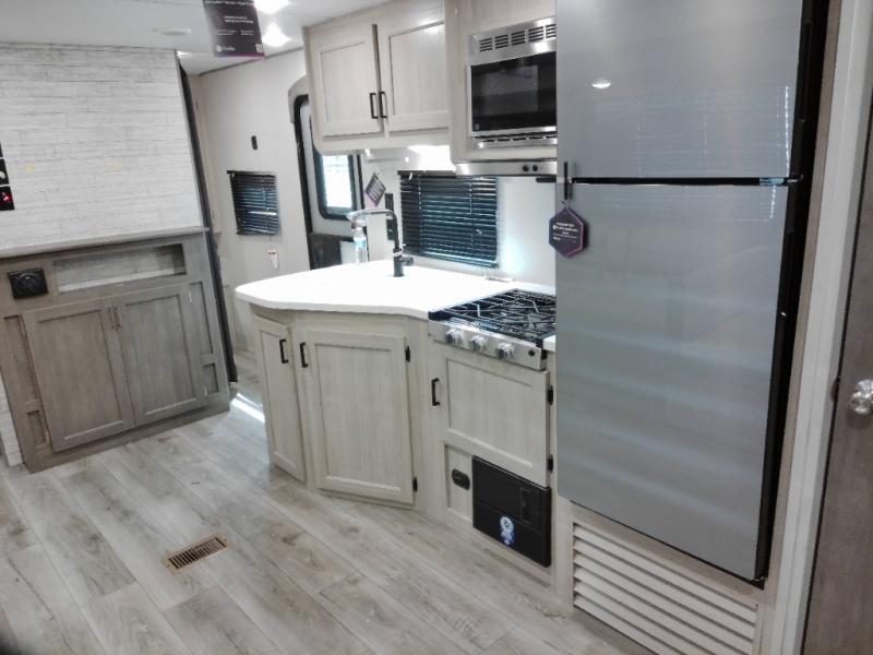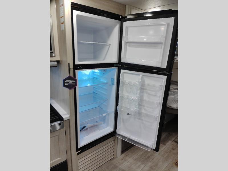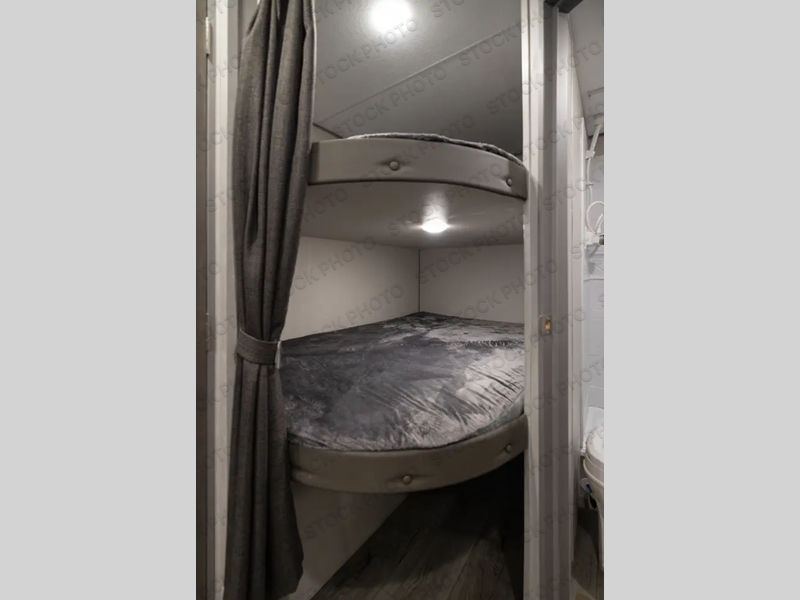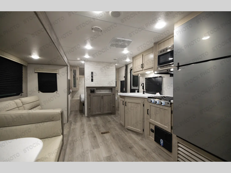 This is the perfect mid-size travel trailer for you and your family! The 46" x 74" double-size bunk beds with lower interior storage offer a comfortable sleeping space for the kids and you will have your own private sleeping space with the 60" x 74" queen bed in the front private bedroom. Freshen up each morning in the rear corner bathroom with the tub/shower and a mirror to get ready each morning. You can prepare your best home cooked meals with the GE stainless three burner cooktop and GE stainless 10.7 cu. ft. 12V refrigerator, then enjoy them together at the booth dinette. The sofa is near the entertainment center for a relaxing movie night. Don't leave any of your outdoor gear behind either, thanks to the front pass-through storage area and the exterior outside storage area. You could even add the optional outside camper kitchen to grill the catch of the day on the pull out griddle!