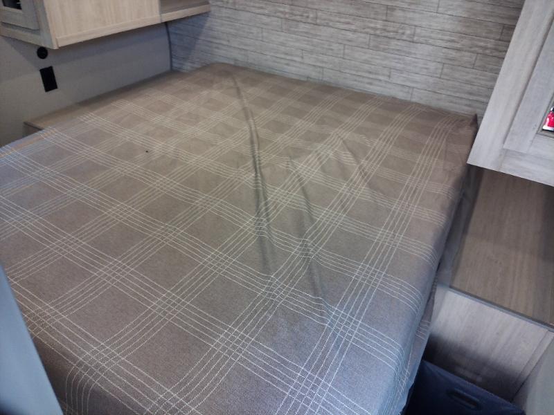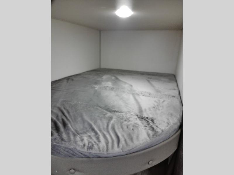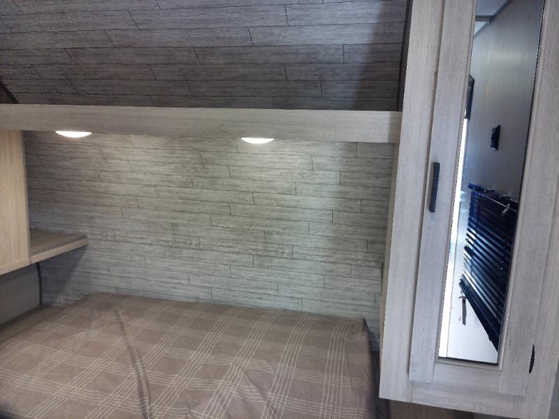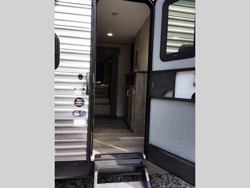 This is the perfect mid-size travel trailer for you and your family! The 46" x 74" double-size bunk beds with lower interior storage offer a comfortable sleeping space for the kids and you will have your own private sleeping space with the 60" x 74" queen bed in the front private bedroom. Freshen up each morning in the rear corner bathroom with the tub/shower and a mirror to get ready each morning. You can prepare your best home cooked meals with the GE stainless three burner cooktop and GE stainless 10.7 cu. ft. 12V refrigerator, then enjoy them together at the booth dinette. The sofa is near the entertainment center for a relaxing movie night. Don't leave any of your outdoor gear behind either, thanks to the front pass-through storage area and the exterior outside storage area. You could even add the optional outside camper kitchen to grill the catch of the day on the pull out griddle!