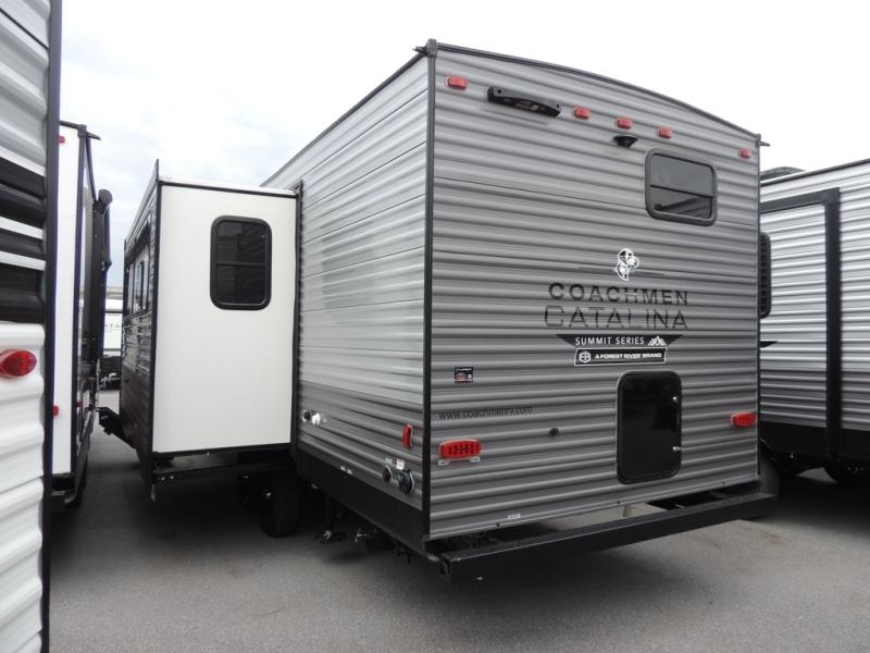 With any Catalina Summit Series 8 by Coachmen you will enjoy an affordable travel trailer packed with at-home comforts! The solid construction includes a Norco electromagnetic powder coated chassis, a seamless Alpha roof membrane, and full length frame outriggers for maximum support and durability. EZ lube axles with leaf spring suspension and self-adjusting brakes provide smooth towing from home to campground, and the premium exterior graphics package is sure to turn heads as you travel down the highway. You will love the features included, such as a JBL Aura Cube media center, magnetic baggage door latches, 4,000 lumen interior touch lighting, and the list goes on!