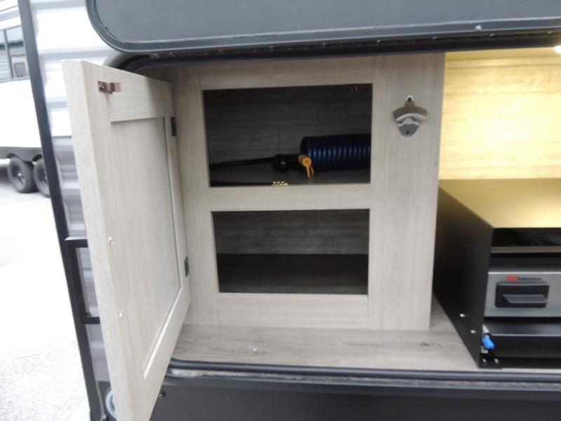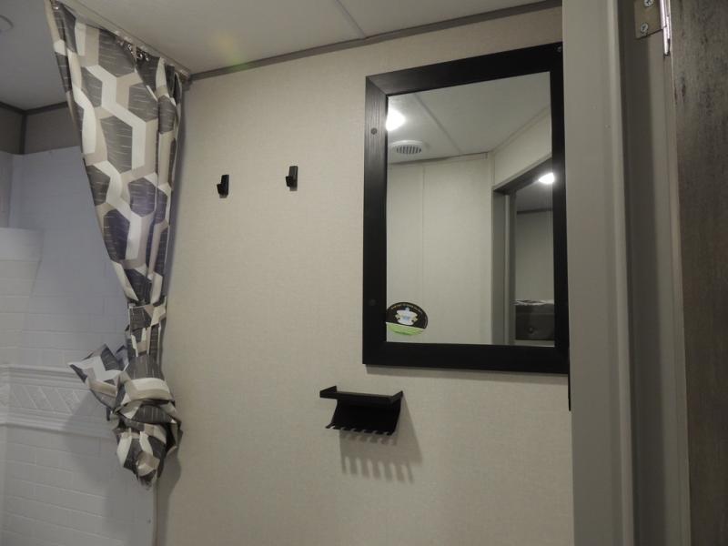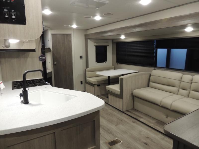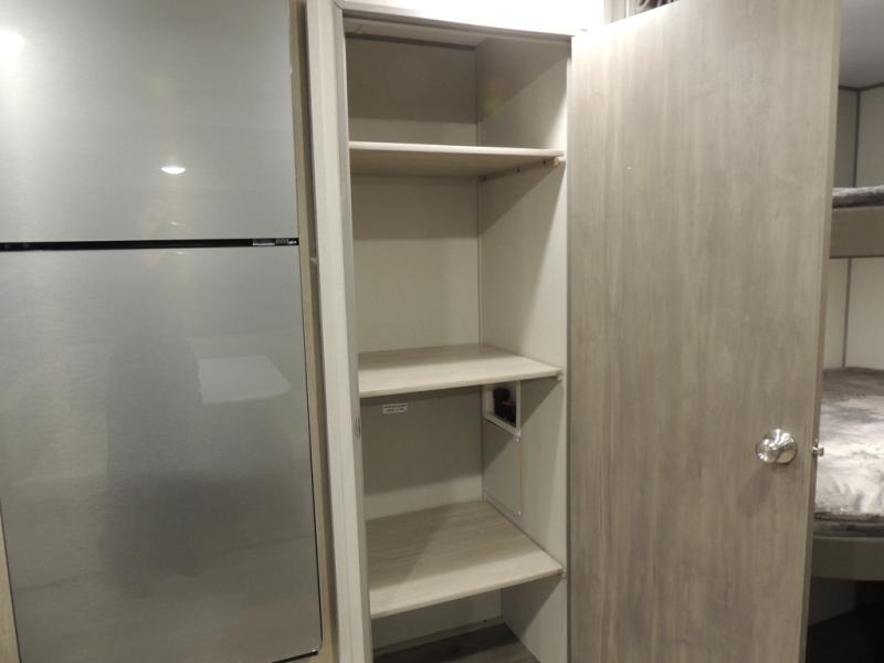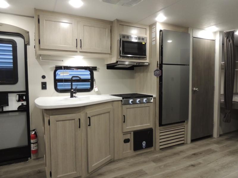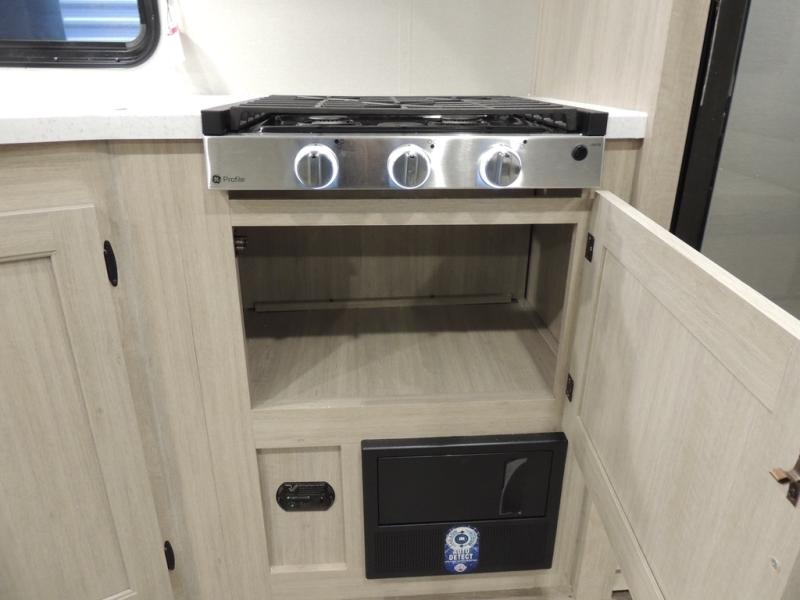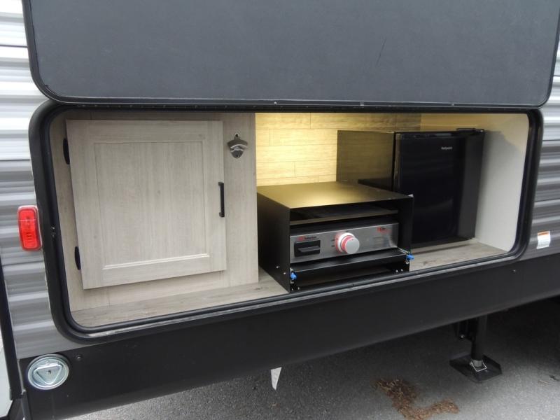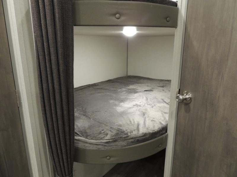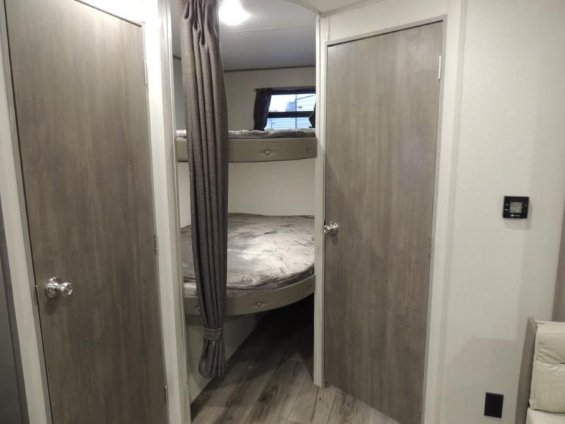 This is the perfect mid-size travel trailer for you and your family! The 46" x 74" double-size bunk beds with lower interior storage offer a comfortable sleeping space for the kids and you will have your own private sleeping space with the 60" x 74" queen bed in the front private bedroom. Freshen up each morning in the rear corner bathroom with the tub/shower and a mirror to get ready each morning. You can prepare your best home cooked meals with the GE stainless three burner cooktop and GE stainless 10.7 cu. ft. 12V refrigerator, then enjoy them together at the booth dinette. The sofa is near the entertainment center for a relaxing movie night. Don't leave any of your outdoor gear behind either, thanks to the front pass-through storage area and the exterior outside storage area. You could even add the optional outside camper kitchen to grill the catch of the day on the pull out griddle!