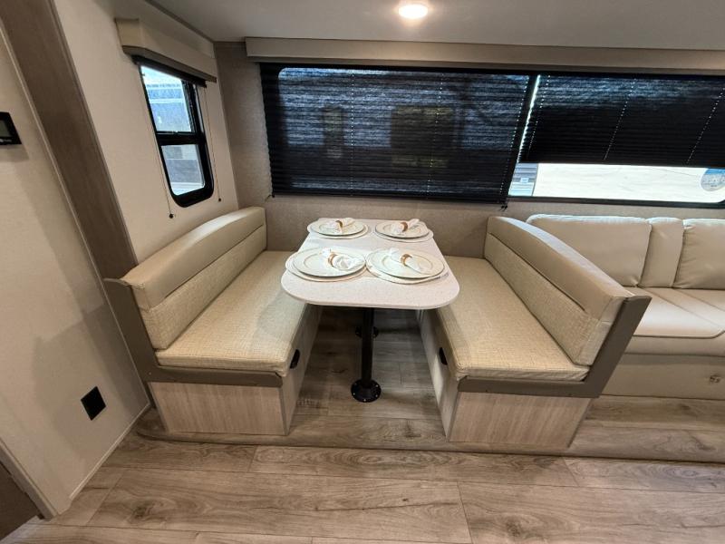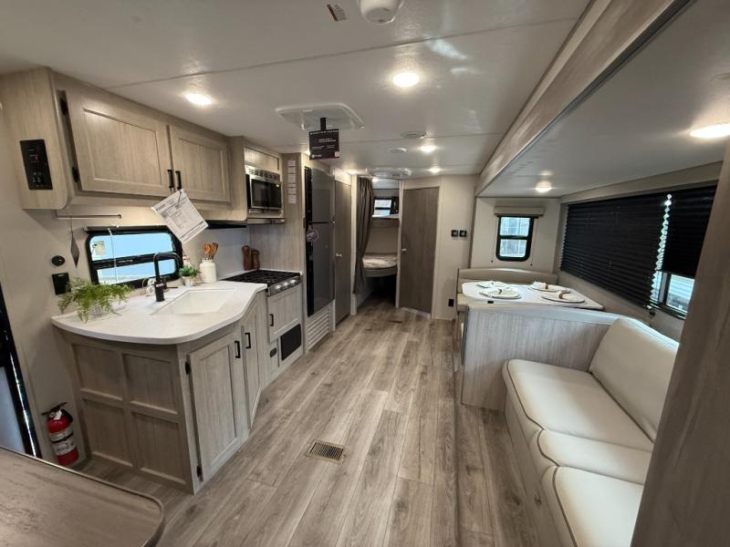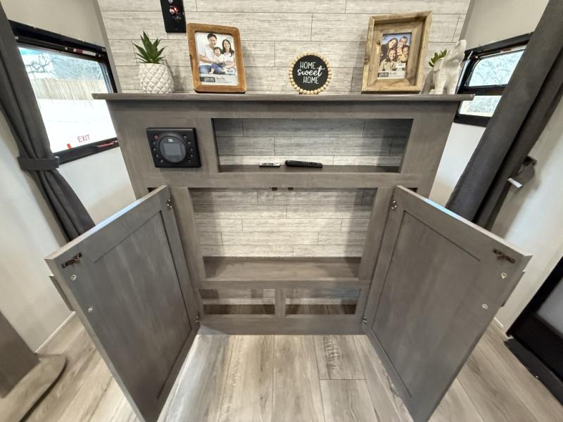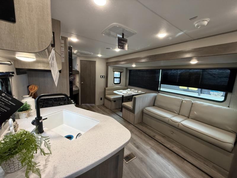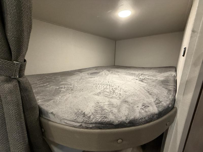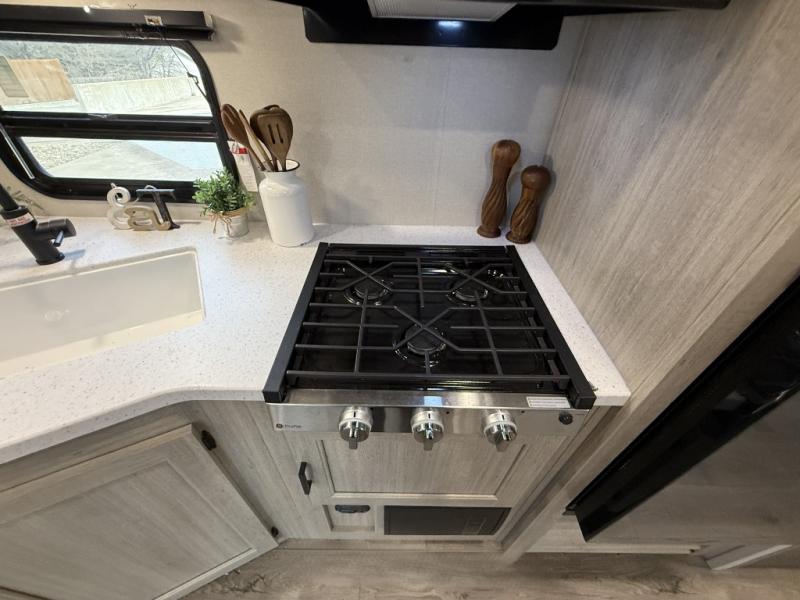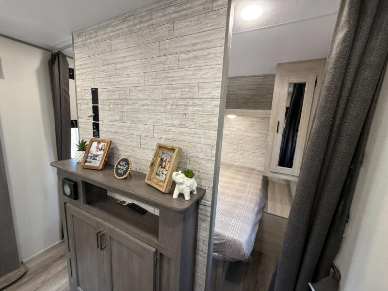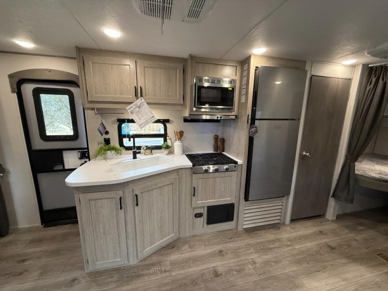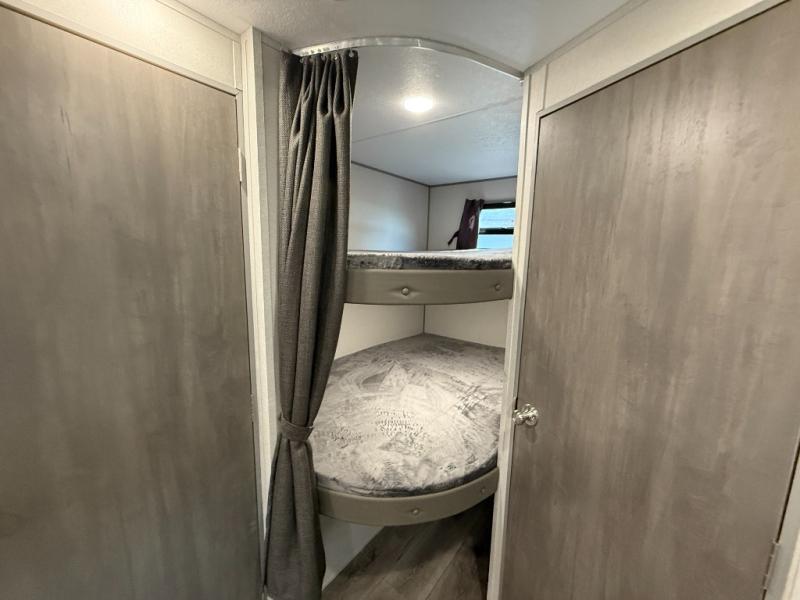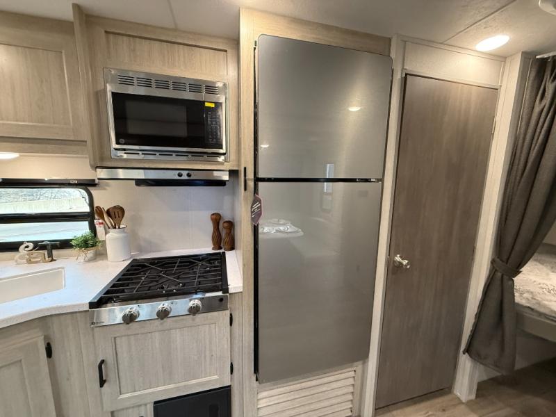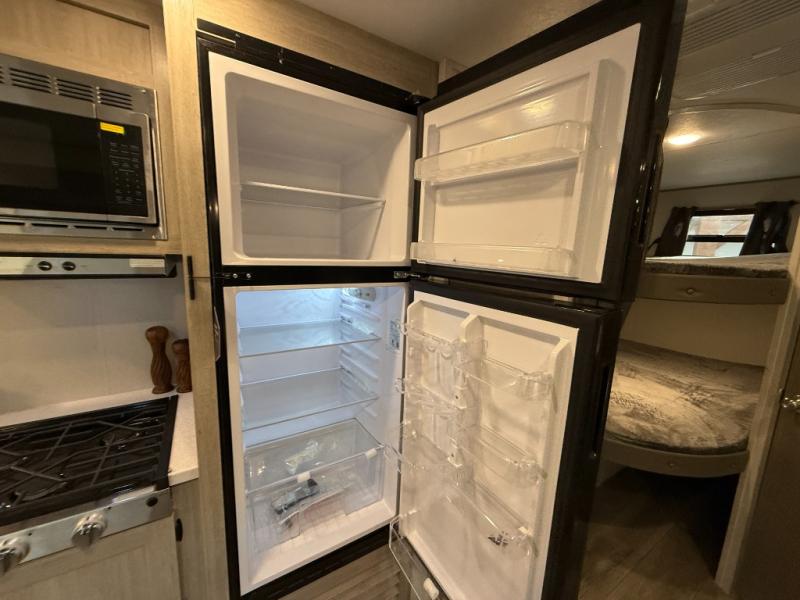 This is the perfect mid-size travel trailer for you and your family! The 46" x 74" double-size bunk beds with lower interior storage offer a comfortable sleeping space for the kids and you will have your own private sleeping space with the 60" x 74" queen bed in the front bedroom. Freshen up each morning in the rear corner bathroom with the tub/shower and a mirror to get ready each morning. You can prepare your best home cooked meals with the GE stainless three burner cooktop and GE stainless 10.7 cu. ft. 12V refrigerator, then enjoy them together at the booth dinette. The sofa is near the entertainment center for a relaxing movie night. Don't leave any of your outdoor gear behind either, thanks to the front pass-through storage area and the exterior outside storage area. You could even add the optional outside camper kitchen to grill the catch of the day on the pull out griddle!