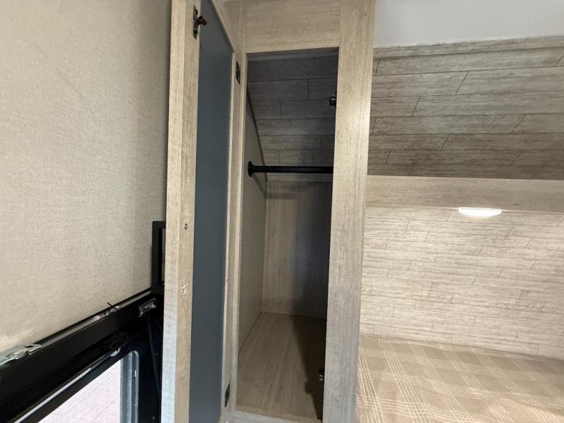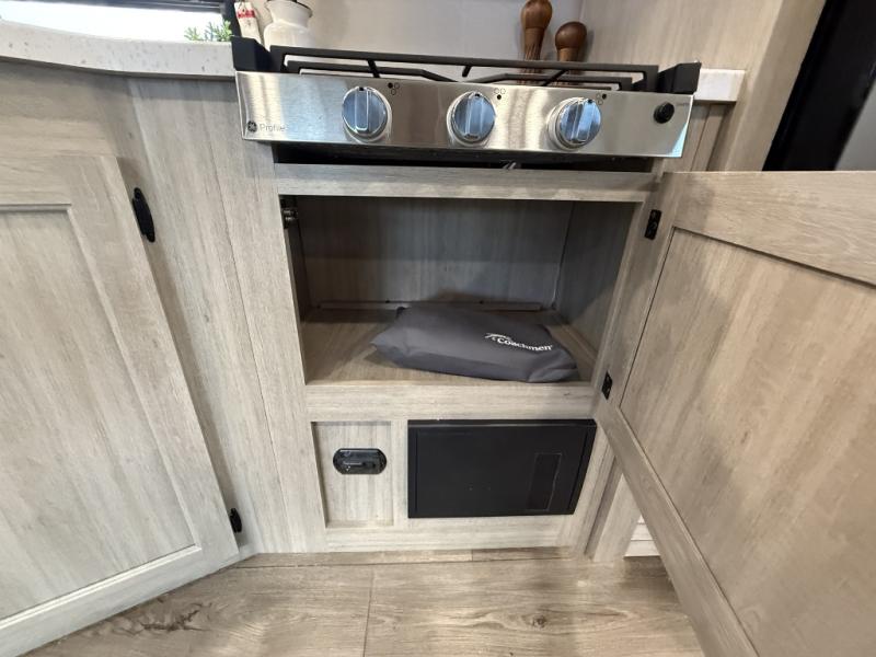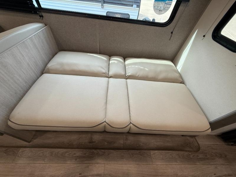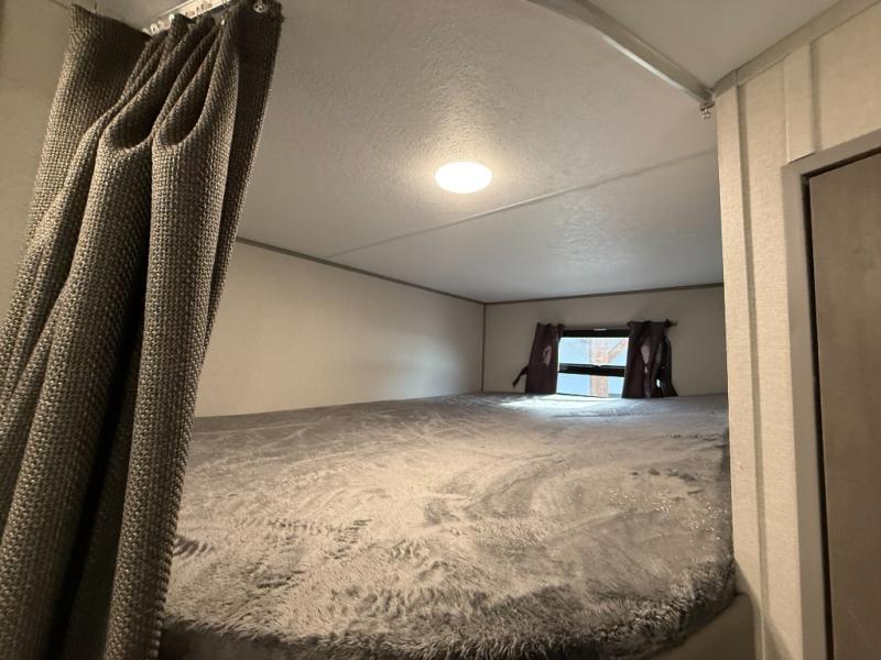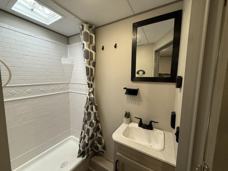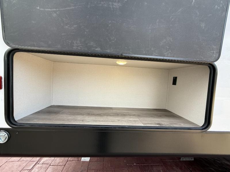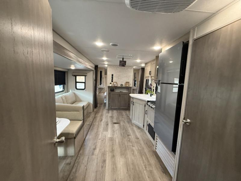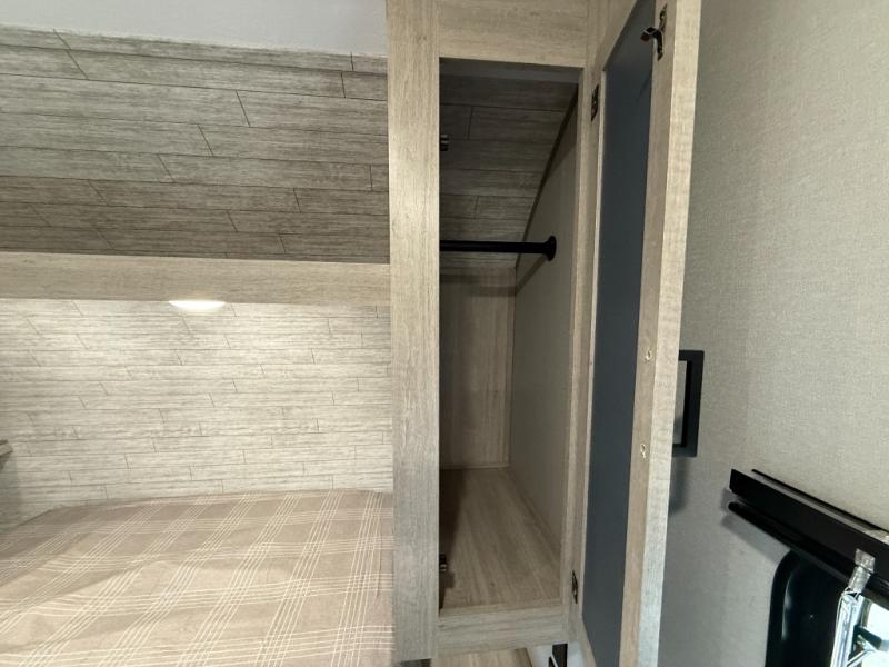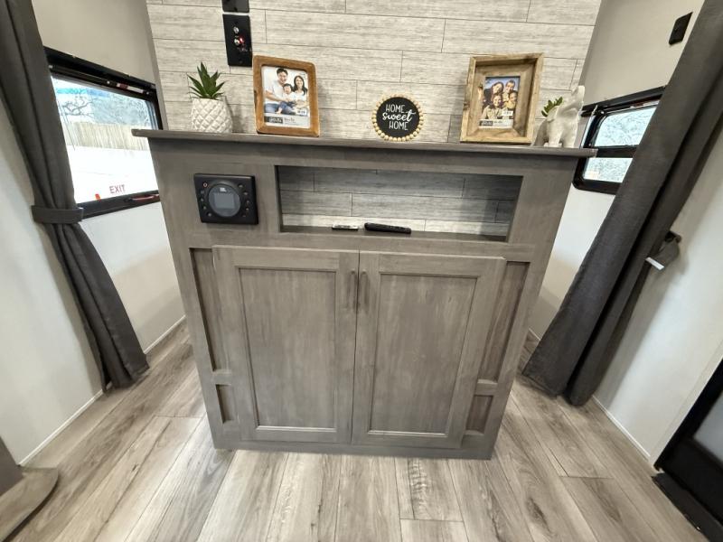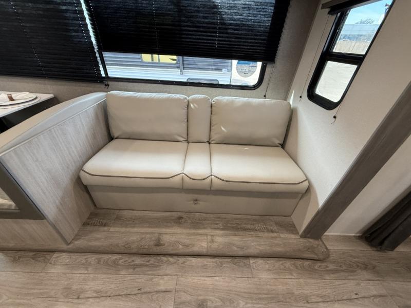 This is the perfect mid-size travel trailer for you and your family! The 46" x 74" double-size bunk beds with lower interior storage offer a comfortable sleeping space for the kids and you will have your own private sleeping space with the 60" x 74" queen bed in the front bedroom. Freshen up each morning in the rear corner bathroom with the tub/shower and a mirror to get ready each morning. You can prepare your best home cooked meals with the GE stainless three burner cooktop and GE stainless 10.7 cu. ft. 12V refrigerator, then enjoy them together at the booth dinette. The sofa is near the entertainment center for a relaxing movie night. Don't leave any of your outdoor gear behind either, thanks to the front pass-through storage area and the exterior outside storage area. You could even add the optional outside camper kitchen to grill the catch of the day on the pull out griddle!