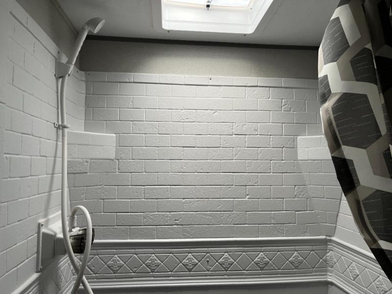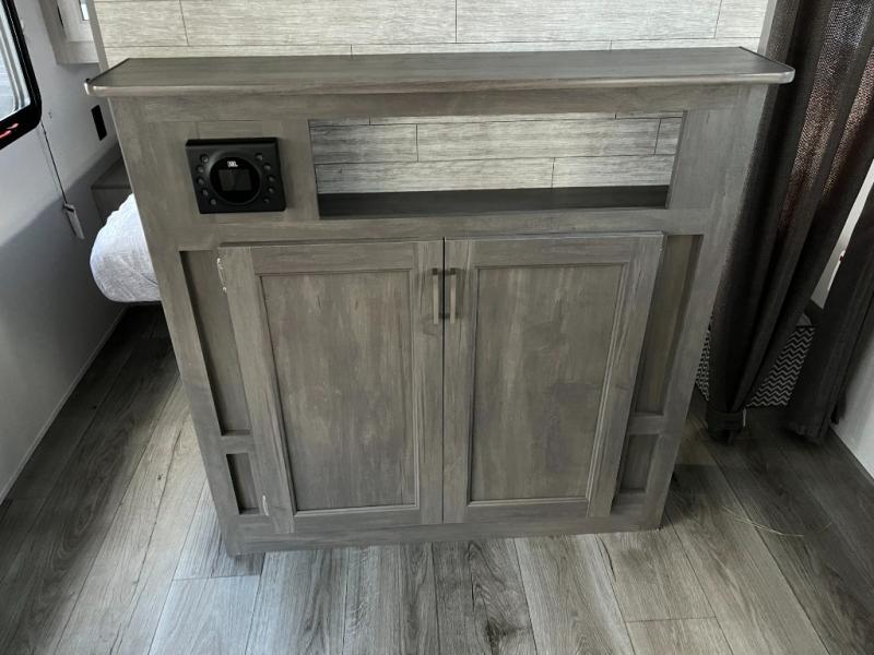 At the end of your day’s adventures, the private bedroom offers a cozy retreat with a comfortable bed and storage for personal items. The bathroom is conveniently located and outfitted with practical amenities, giving you the comfort of home no matter where you park for the night.