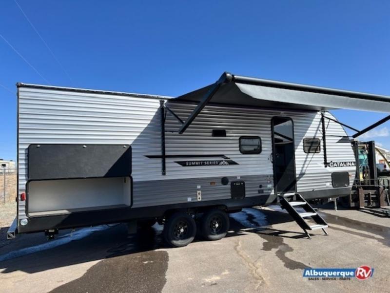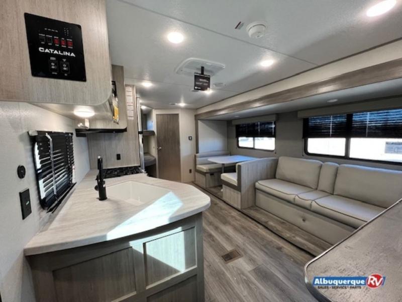 With any Catalina Summit Series 8 by Coachmen you will enjoy an affordable travel trailer packed with at-home comforts! The solid construction includes a Norco electromagnetic powder coated chassis, a seamless Alpha roof membrane, and full length frame outriggers for maximum support and durability. EZ lube axles with leaf spring suspension and self-adjusting brakes provide smooth towing from home to campground, and the premium exterior graphics package is sure to turn heads as you travel down the highway. You will love the features included, such as a JBL Aura Cube media center, magnetic baggage door latches, 4,000 lumen interior touch lighting, and the list goes on!