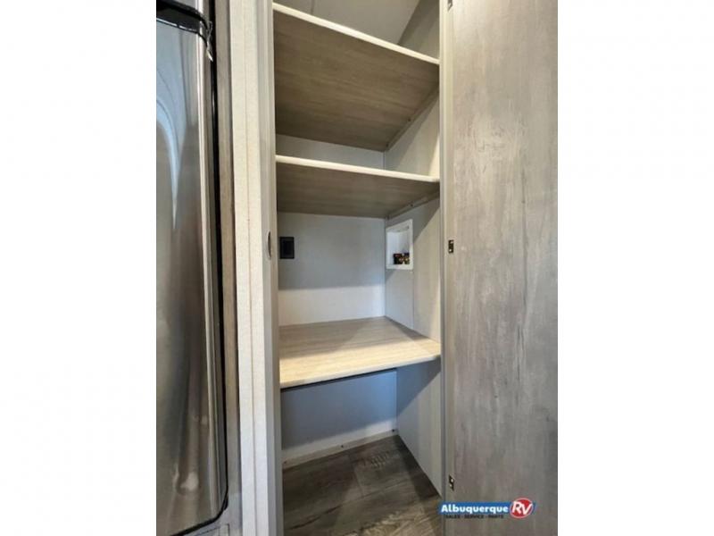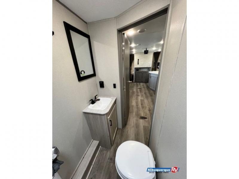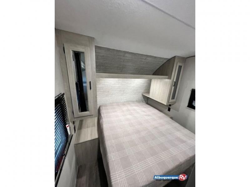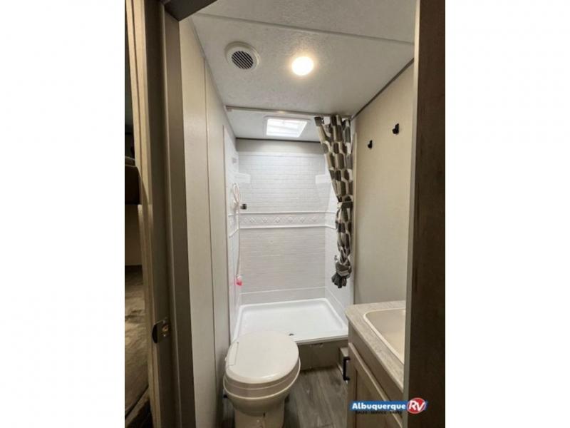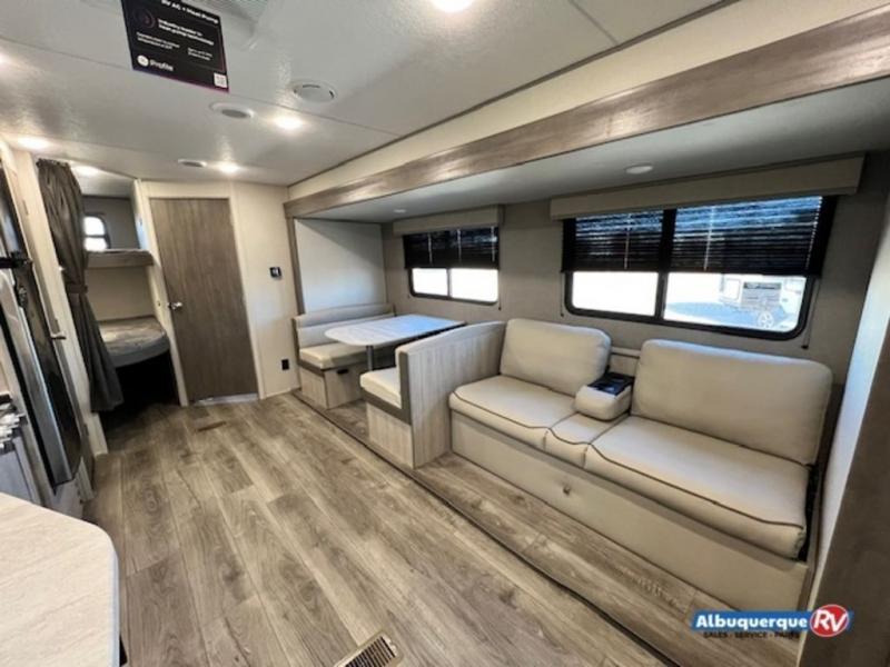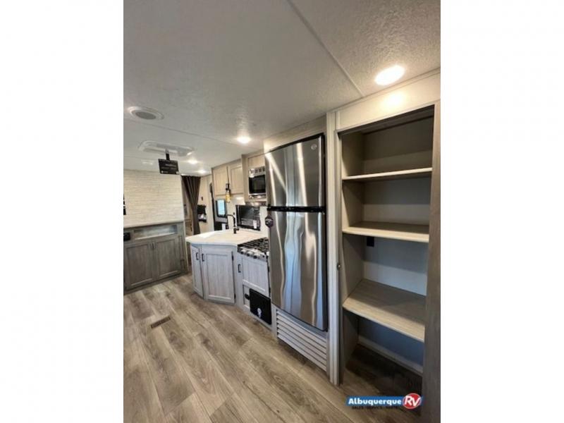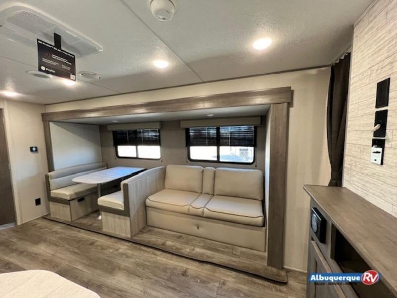 This is the perfect mid-size travel trailer for you and your family! The 46" x 74" double-size bunk beds with lower interior storage offer a comfortable sleeping space for the kids and you will have your own private sleeping space with the 60" x 74" queen bed in the front bedroom. Freshen up each morning in the rear corner bathroom with the tub/shower and a mirror to get ready each morning. You can prepare your best home cooked meals with the GE stainless three burner cooktop and GE stainless 10.7 cu. ft. 12V refrigerator, then enjoy them together at the booth dinette. The sofa is near the entertainment center for a relaxing movie night. Don't leave any of your outdoor gear behind either, thanks to the front pass-through storage area and the exterior outside storage area. You could even add the optional outside camper kitchen to grill the catch of the day on the pull out griddle!