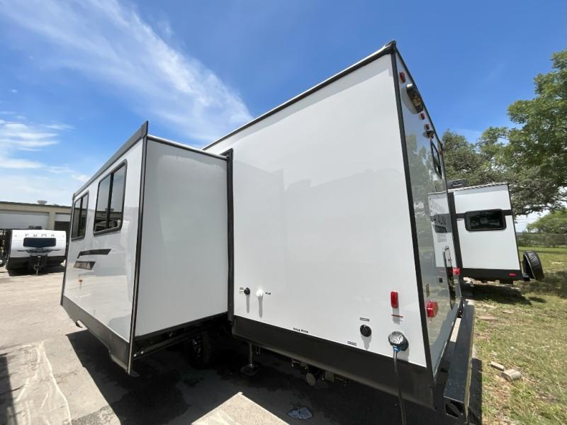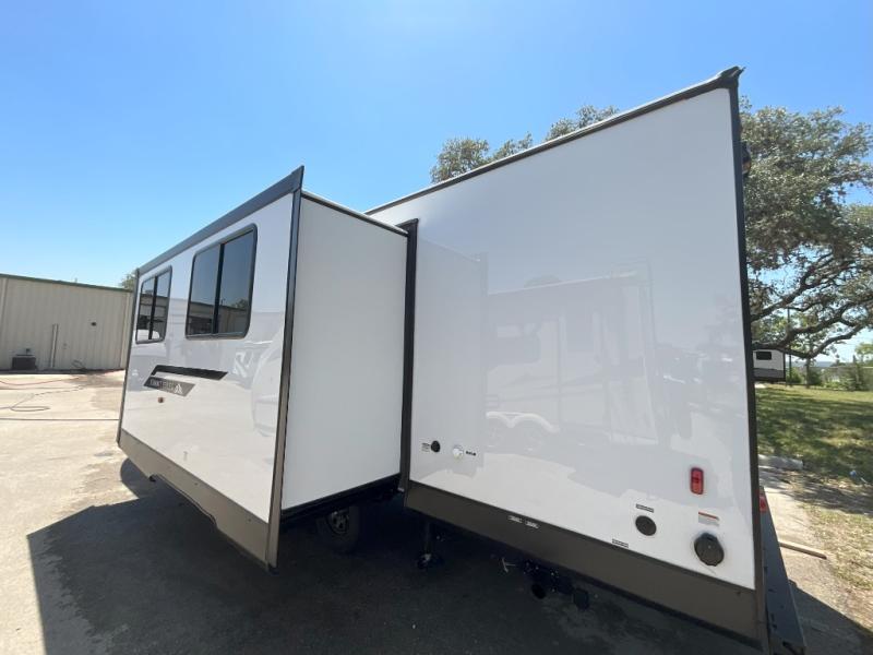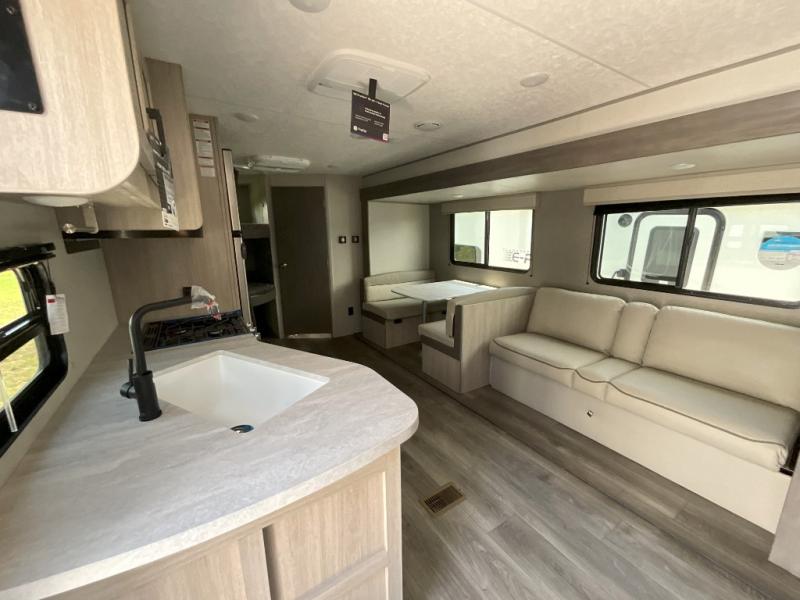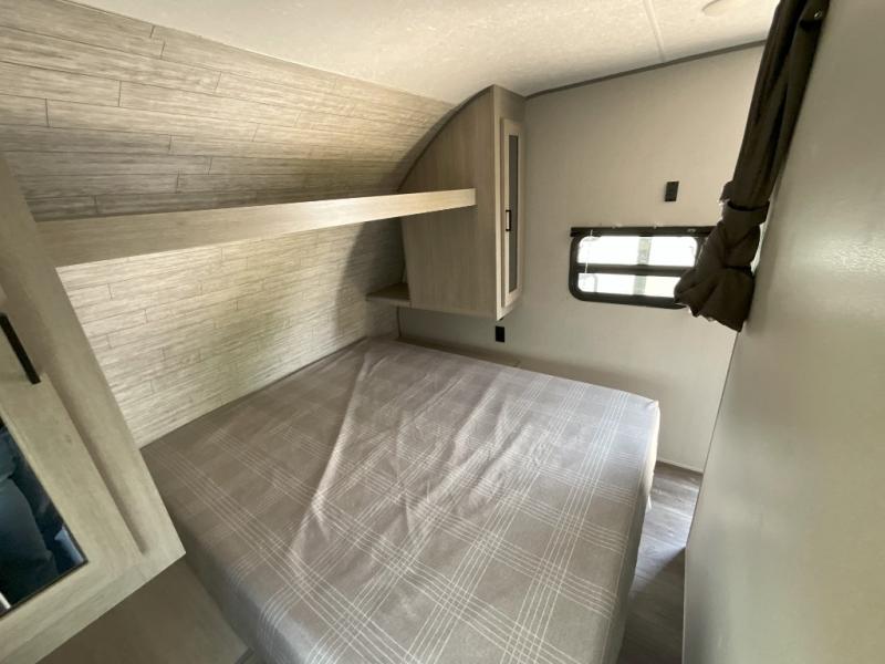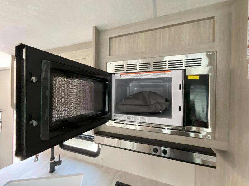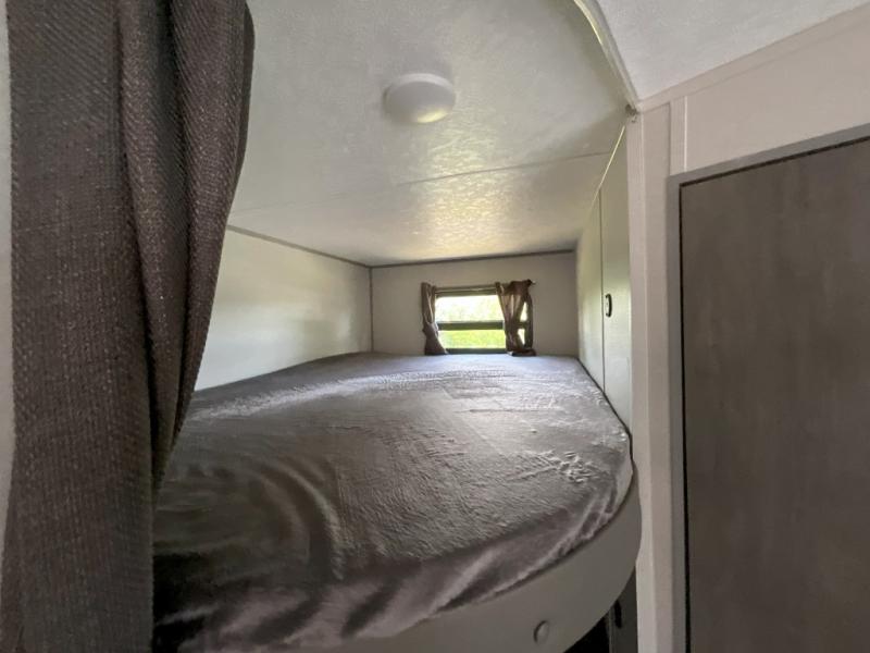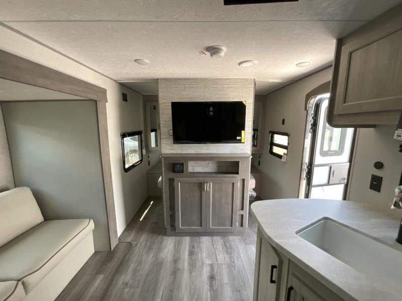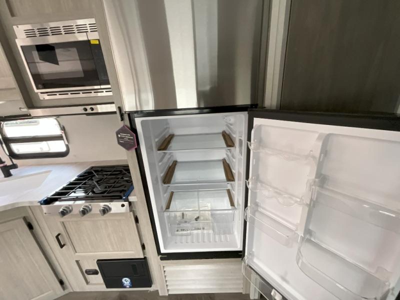 This is the perfect mid-size travel trailer for you and your family! The 46" x 74" double-size bunk beds with lower interior storage offer a comfortable sleeping space for the kids and you will have your own private sleeping space with the 60" x 74" queen bed in the front bedroom. Freshen up each morning in the rear corner bathroom with the tub/shower and a mirror to get ready each morning. You can prepare your best home cooked meals with the GE stainless three burner cooktop and GE stainless 10.7 cu. ft. 12V refrigerator, then enjoy them together at the booth dinette. The sofa is near the entertainment center for a relaxing movie night. Don't leave any of your outdoor gear behind either, thanks to the front pass-through storage area and the exterior outside storage area. You could even add the optional outside camper kitchen to grill the catch of the day on the pull out griddle!