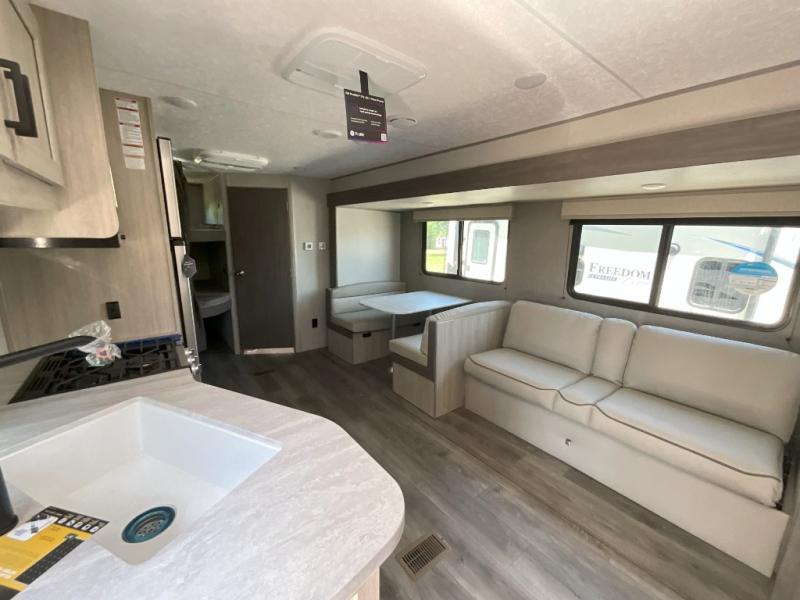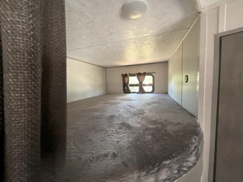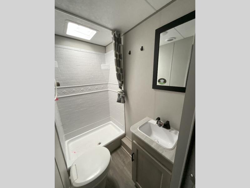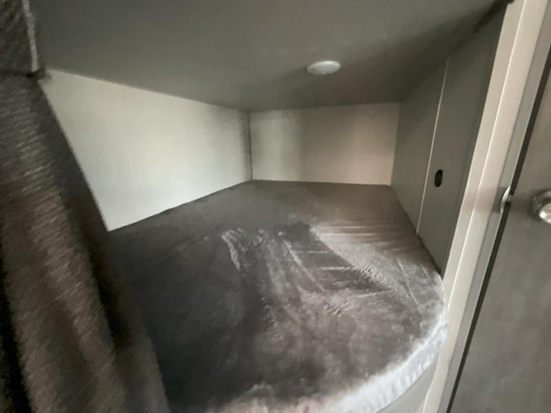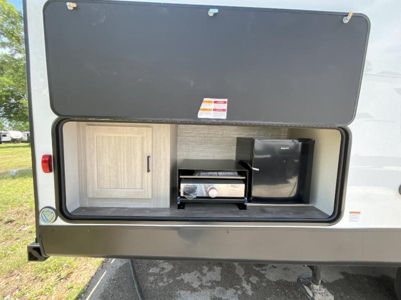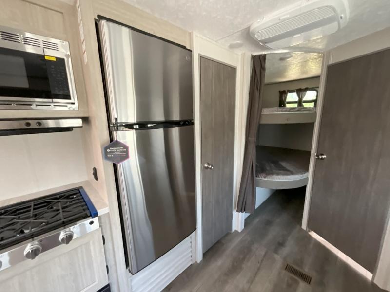 This is the perfect mid-size travel trailer for you and your family! The 46" x 74" double-size bunk beds with lower interior storage offer a comfortable sleeping space for the kids and you will have your own private sleeping space with the 60" x 74" queen bed in the front bedroom. Freshen up each morning in the rear corner bathroom with the tub/shower and a mirror to get ready each morning. You can prepare your best home cooked meals with the GE stainless three burner cooktop and GE stainless 10.7 cu. ft. 12V refrigerator, then enjoy them together at the booth dinette. The sofa is near the entertainment center for a relaxing movie night. Don't leave any of your outdoor gear behind either, thanks to the front pass-through storage area and the exterior outside storage area. You could even add the optional outside camper kitchen to grill the catch of the day on the pull out griddle!